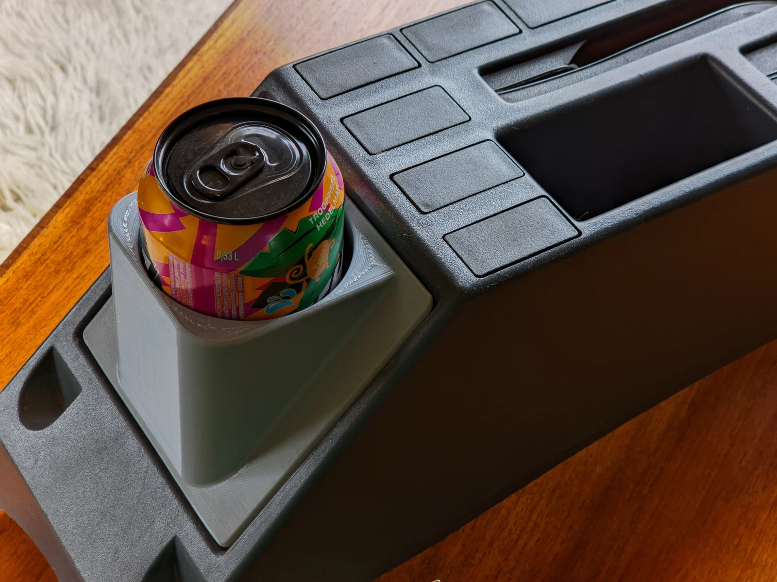 Giá đỡ này phù hợp với các loại lon và chai nước 0,33l hay 0,5l thông thường, có thêm rãnh cho các loại lon nhỏ 0,25l / 0,355l và cũng lắp vừa khít với chai nước thể thao 0,75l mà mình đang dùng.