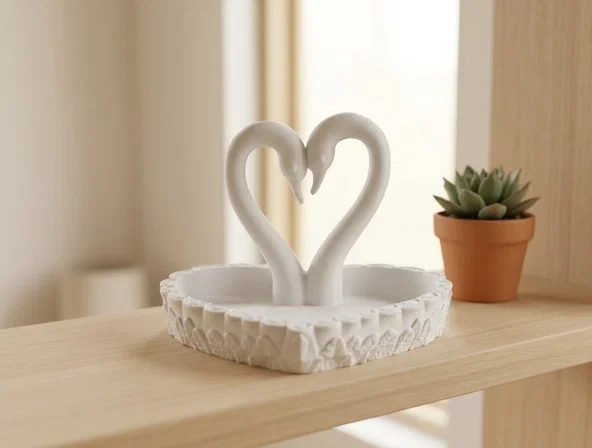 Mẫu khay hình trái tim lãng mạn với điểm nhấn là hai chú thiên nga duyên dáng. Sản phẩm hoàn hảo để làm vật dụng trang trí, đựng nhẫn hoặc quà tặng đầy tinh tế cho các dịp đặc biệt. Dễ dàng in ấn với thiết lập tiêu chuẩn, phù hợp cho mọi không gian sống.
