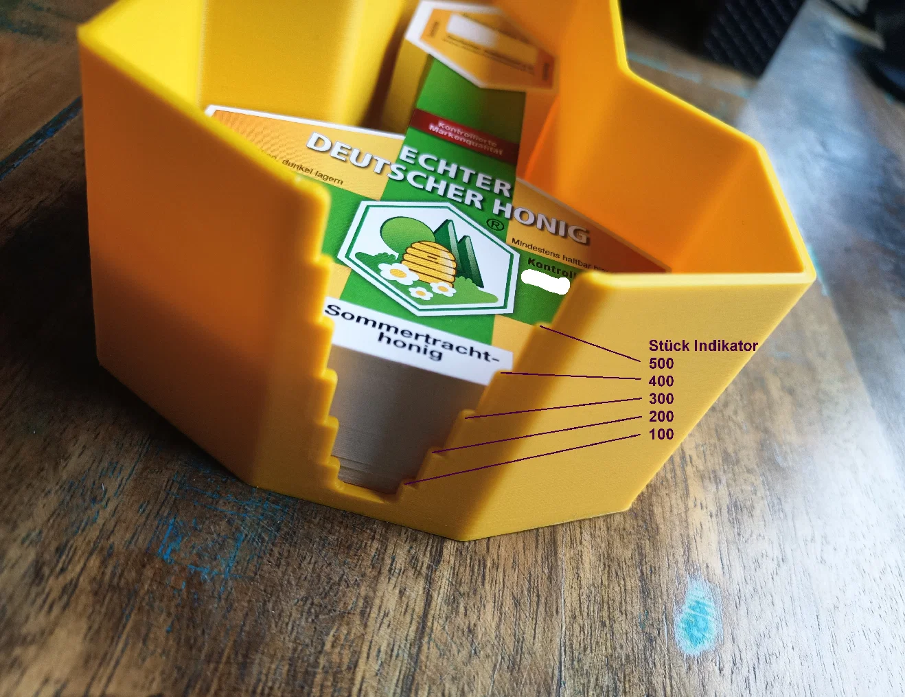 Chiếc hộp lưu trữ có nắp đậy này được thiết kế chuyên dụng cho nhãn DIB. Ngoài ra, hộp còn có một bộ phận chỉ báo để giúp mọi người dễ dàng theo dõi số lượng nhãn còn lại bên trong. Sản phẩm bao gồm hai phiên bản khác nhau dành cho loại nhãn 500g và 250g của Hiệp hội Người nuôi ong Đức (Deutscher Imkerbund).