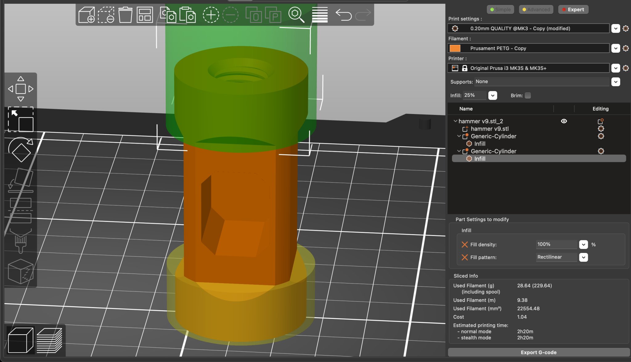In mỗi phần ở 2 mm, ba chu vi là gì. Tôi đã thêm các bộ điều chỉnh infill ở các đầu ren của đầu búa đến phần vát với 100% infill. Thêm một viền xung quanh bên trong và bên ngoài của tay cầm. Mọi thứ khác có thể được in bình thường, bạn có thể sẽ không đánh vào bất cứ thứ gì đủ mạnh để làm gãy đầu hoặc tay cầm. Các mặt dây có thể được lấp đầy theo bất kỳ điều gì bạn cảm thấy cần thiết. Tôi đã làm của mình bằng PETG và nó hoạt động tốt. Dán tay cầm vào đầu búa bằng keo epoxy năm phút đã sử dụng. Và bạn có thể in các mặt đánh bằng bất kỳ vật liệu nào bạn thích. Thêm hỗ trợ theo ý bạn. làm mặt đánh 3mm.