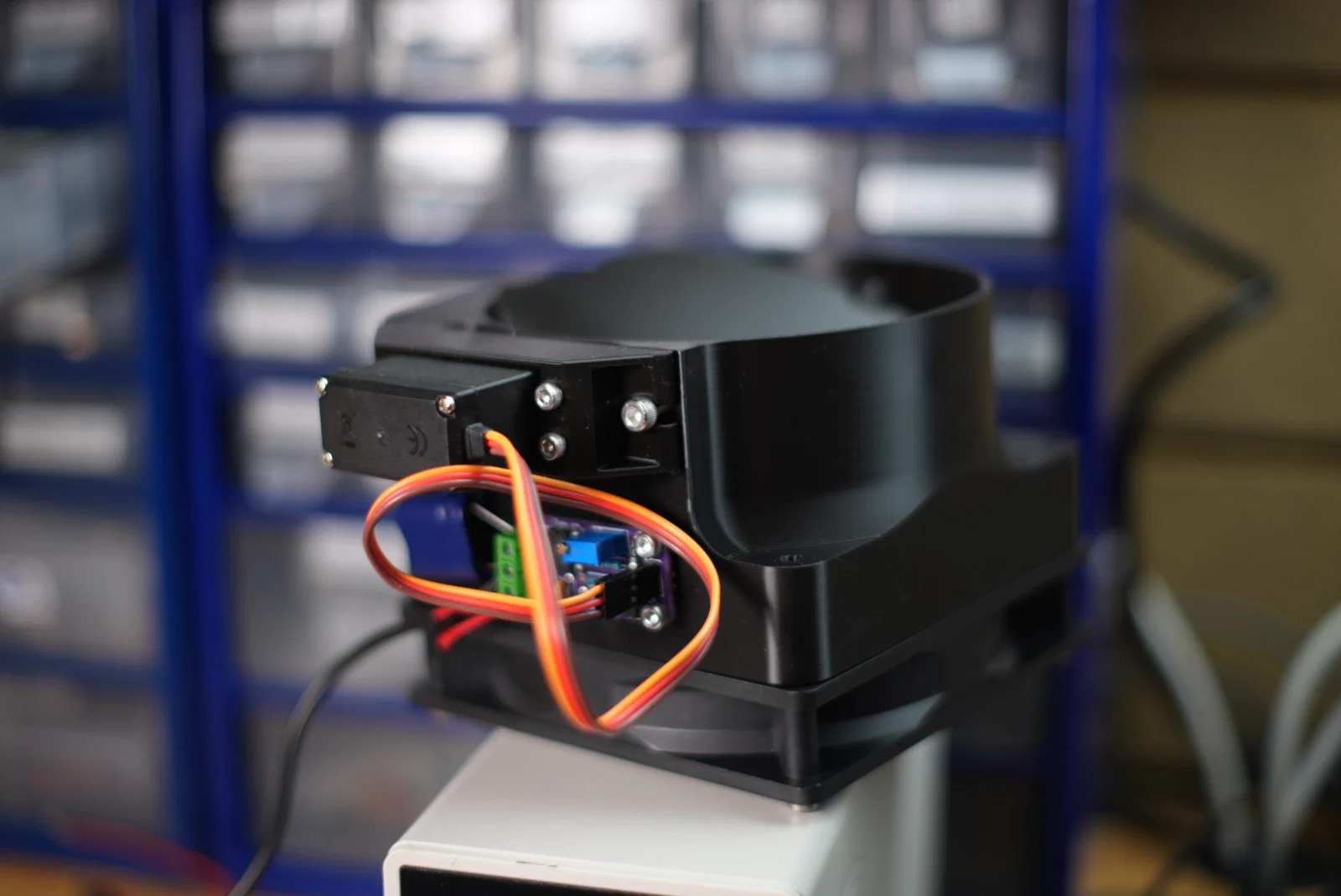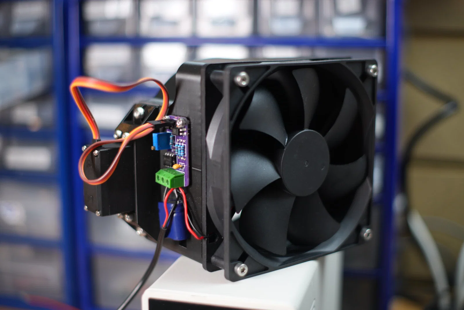 Như trong ảnh, mạch được kết hợp với siêu tụ điện (super cap) và diode để cho phép tự động mở cửa thông gió và bật quạt khi có điện, đồng thời tắt quạt và đóng cửa khi ngắt điện. Hoạt động khá ổn định cho đến khi tụ điện gần xả hết, vì vậy bạn có thể cần thêm một mô-đun ngắt điện áp thấp. Trong cấu hình thông thường với nguồn điện liên tục và đầu vào tín hiệu có chuyển mạch, hệ thống hoạt động rất tốt.