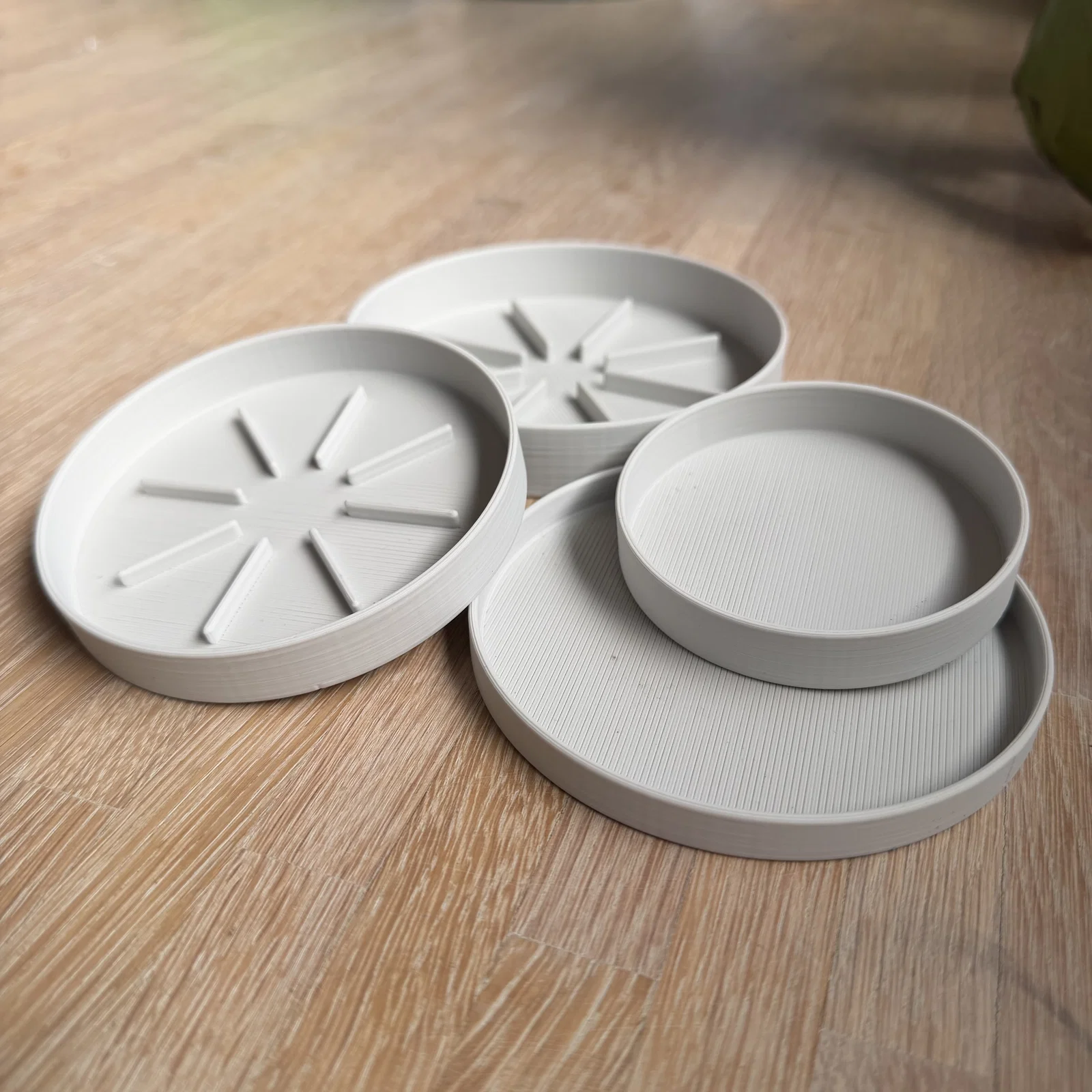 Trọn bộ khay lót chậu cây với kích thước từ 80–200 mm, gồm 3 loại chiều cao. Thiết kế tích hợp bệ nâng giúp cây luôn khô ráo, tránh ngập úng và mang lại vẻ ngoài gọn gàng cho không gian của bạn.