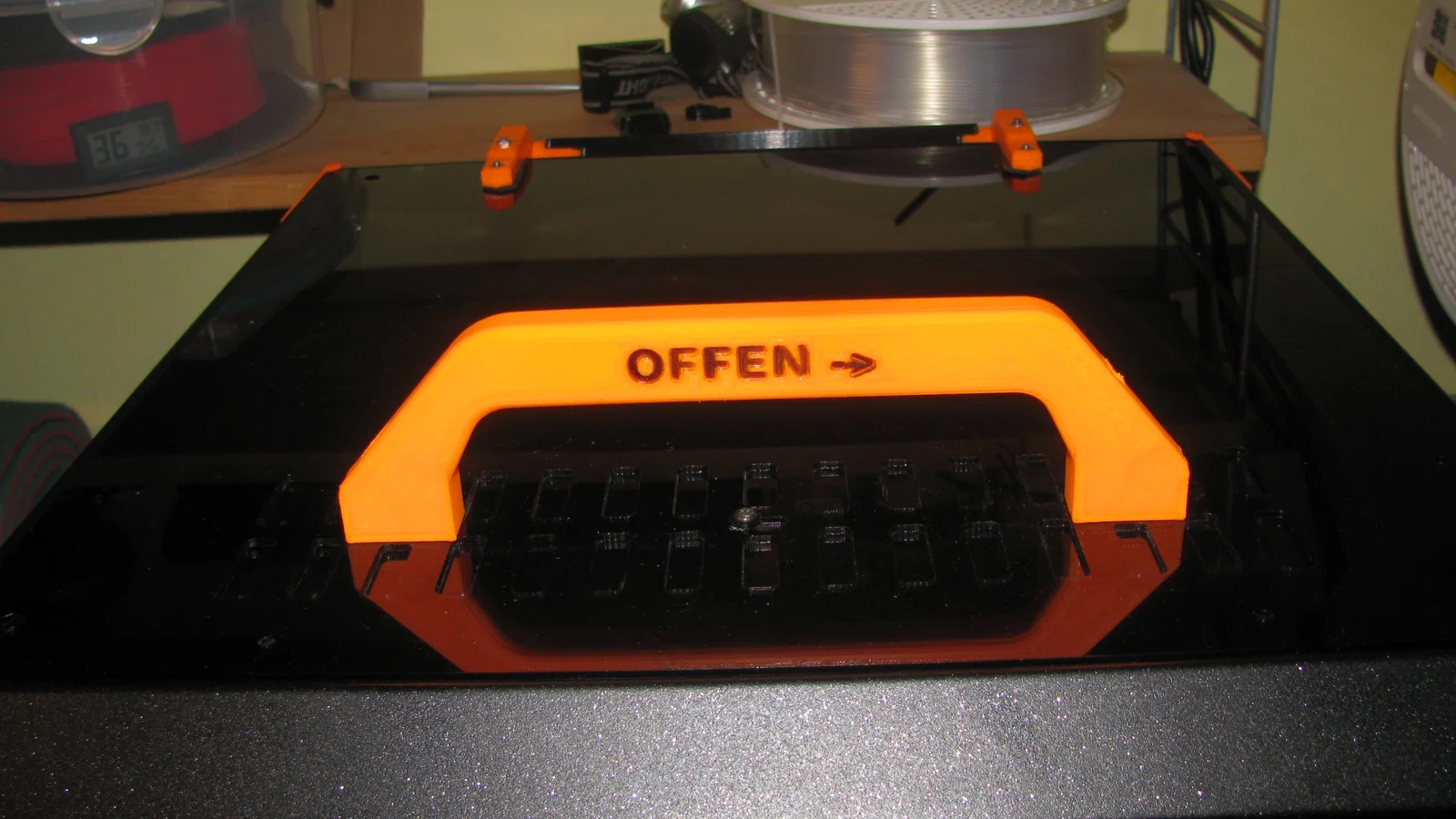 Mình sử dụng cái tay cầm này để chỉnh khe thông gió và mở nắp trên của máy. Ngoài ra, mình có kết hợp dùng bản lề từ một tác giả khác (cảm ơn bạn ấy nhiều) kèm theo một thanh kẹp giữ cố định, nhờ vậy mà không cần phải khoan thêm lỗ lên vỏ kim loại của máy. Ngoại trừ việc cần khoan hai lỗ nhỏ trên tấm nắp phía trên, mọi thứ còn lại đều có thể bắt vít trực tiếp vào các lỗ có sẵn.