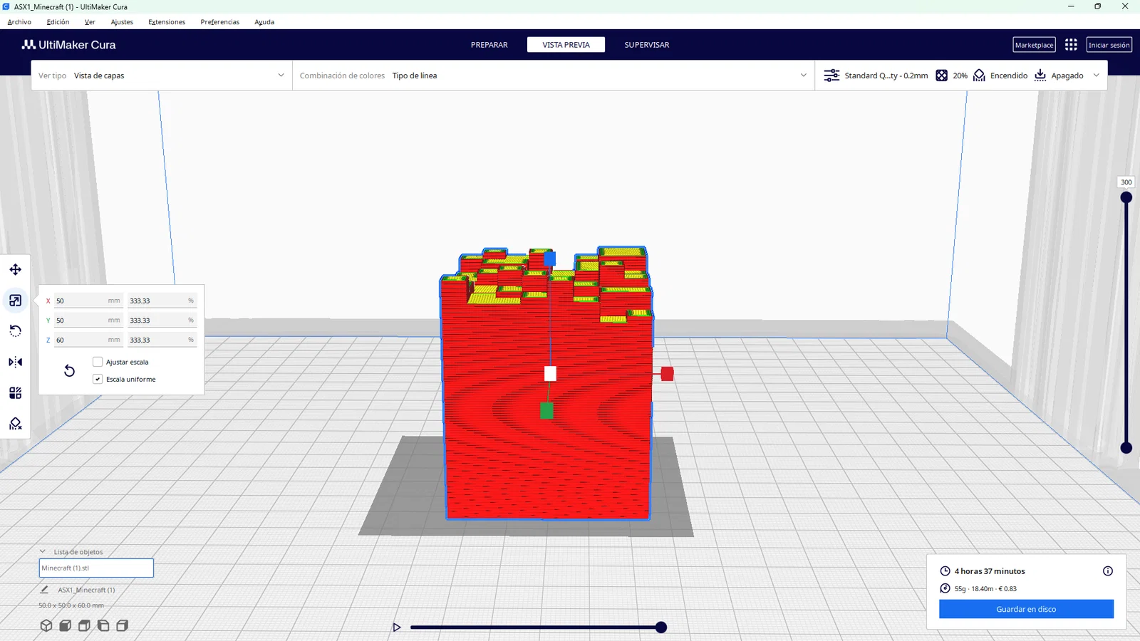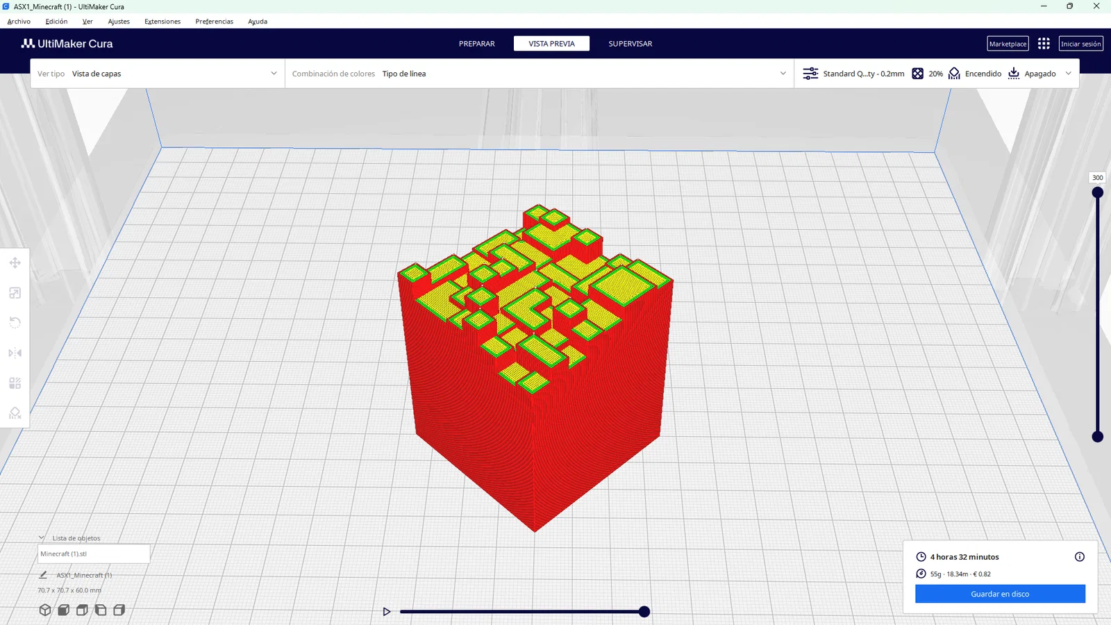 • Kỹ thuật đổi màu: Một mẹo hay trong Ultimaker Cura là bạn có thể theo dõi chiều cao của mô hình. Khi in đến khoảng 15.5mm tính từ đáy, hãy tạm dừng máy để thay đổi cuộn nhựa màu khác, giúp mô hình có sự chuyển màu tự nhiên và chuyên nghiệp hơn.