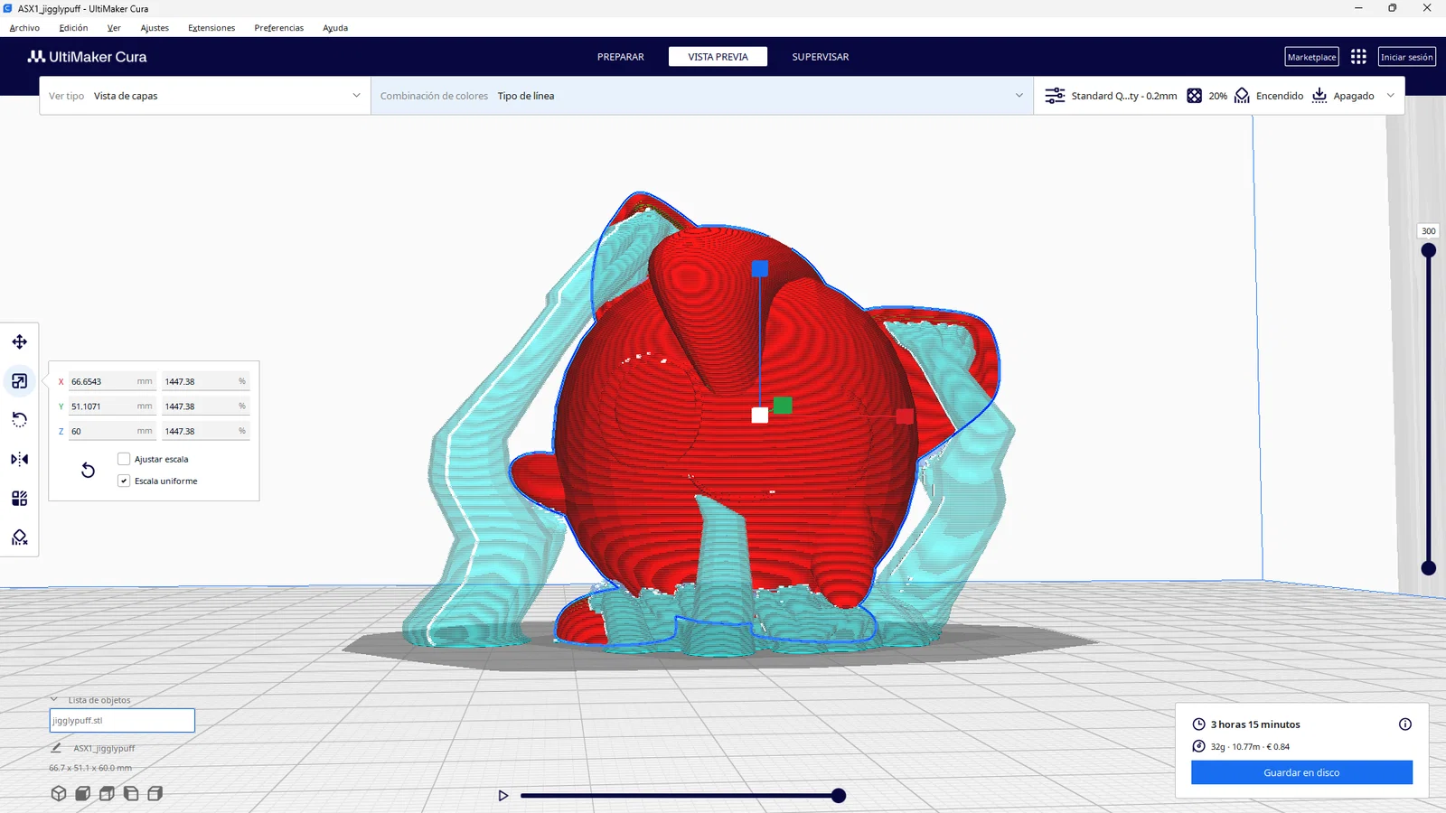 • Cấu trúc hỗ trợ (Supports): Như đã thấy trong ảnh minh họa từ phần mềm cắt lớp, cấu trúc support là rất cần thiết để đỡ phần tai và tay của Jigglypuff, giúp mô hình không bị lỗi khi in các phần nhô ra.