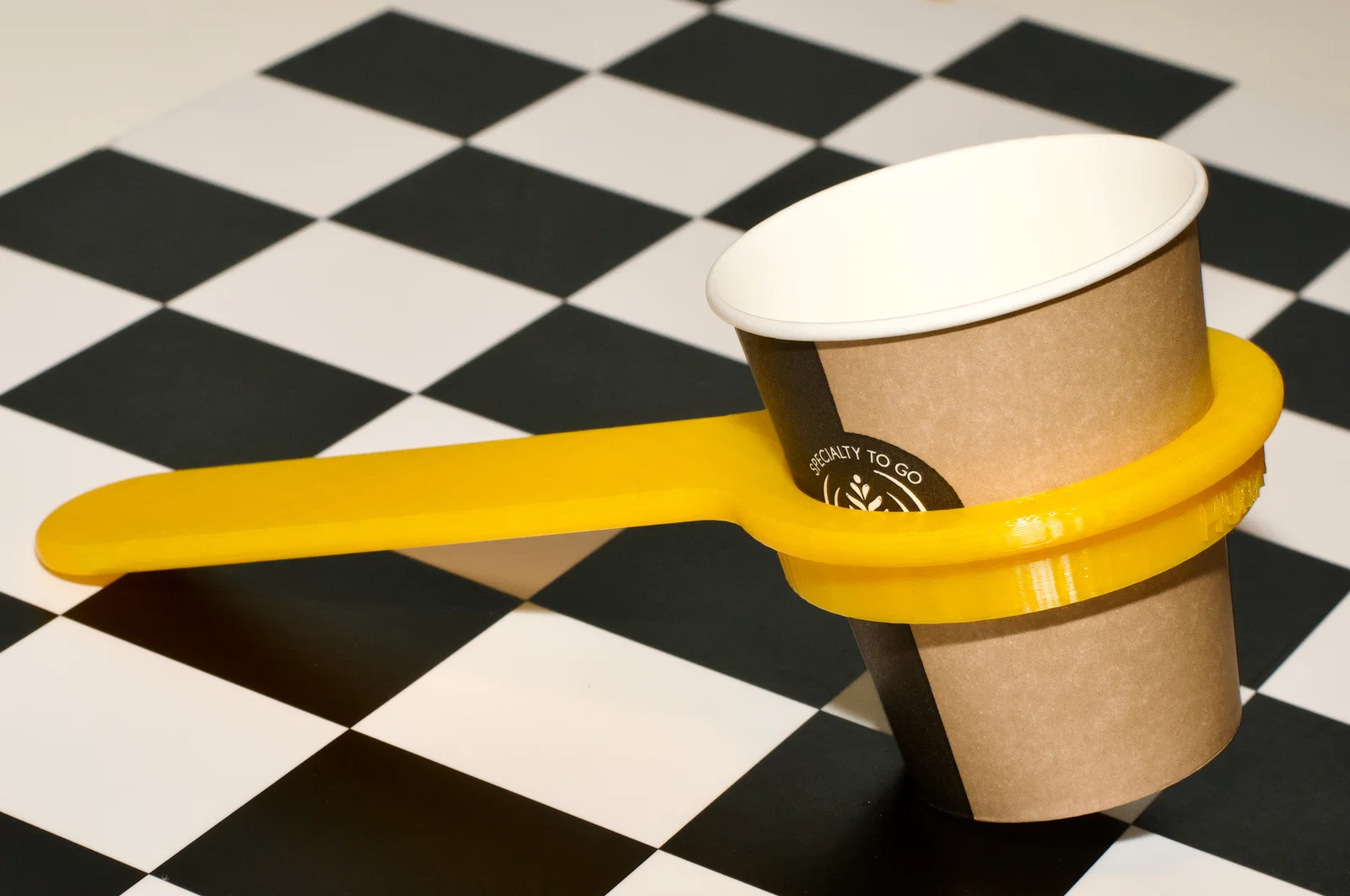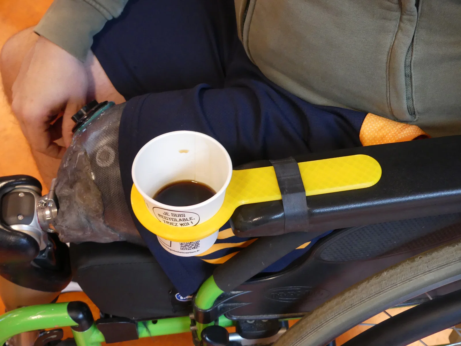 Đối với những người sử dụng xe lăn, việc di chuyển hoặc làm các công việc thường ngày đôi khi trở nên bất tiện khi phải cầm theo đồ uống. Hiểu được nhu cầu đó, dự án Humanlab Apajh 44 đã thiết kế một giải pháp in 3D cực kỳ hữu ích: giá đỡ cốc nước (cup holder) có thể gắn trực tiếp vào tay vịn của xe lăn tay. Thiết bị này giúp người dùng có một vị trí cố định để đặt cốc cà phê, trà hoặc các loại đồ uống mang đi một cách an toàn mà không lo bị đổ.