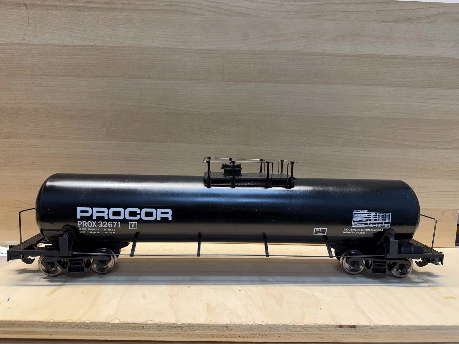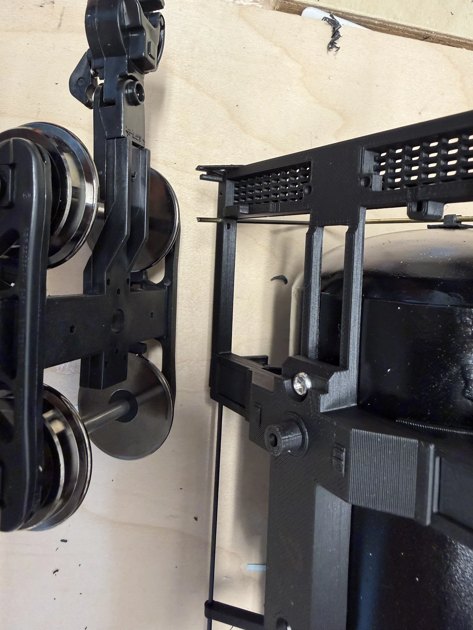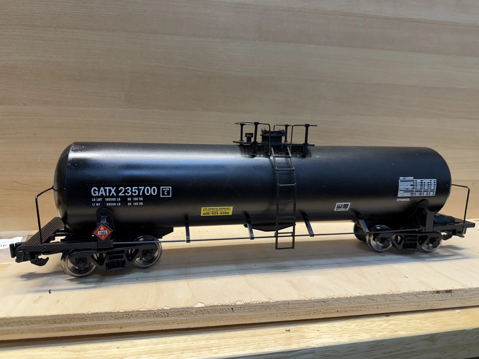 Việc tìm kiếm các toa xe bồn G-scale hiện đại và chân thực khá là khó khăn. Bản remix này được xây dựng dựa trên thiết kế gốc của Manimal, bao gồm một sàn trên đỉnh bồn dài hơn, kiểu dáng thường thấy trên các toa LPG, đồng thời có thêm các trụ dẫn hướng để gắn bồn (tôi có cung cấp khuôn lỗ cho đỉnh bồn trong bản remix toa xe acid). Ngoài ra, tôi còn làm lại kiểu giá đỡ tay vịn khác với chốt định vị, giúp việc lắp đặt dễ dàng mà không cần dùng keo. Cuối cùng, tôi đã chỉnh sửa lại giá gắn trục (truck mount) từ bản gốc để phù hợp với loại bánh xe kim loại Bachmann đời mới. Các bộ bánh xe này có phần gắn móc nối hướng lên trên, vốn dễ va vào mặt dưới của giá đỡ cũ làm cản trở việc xoay mượt mà. Giá đỡ mới được làm phẳng mặt dưới nên dùng rất tốt với bánh xe Bachmann. Tôi cũng đính kèm thêm khuôn lỗ cho thanh đứng (stanchion) và giá đỡ trục cho cả toa LPG (ống PVC 18" x 3") và loại toa bồn ngắn hơn (ống PVC 16" x 3"). Bạn cần dùng thanh đứng kiểu góc cho khuôn này. Trong hầu hết các trường hợp, bạn sẽ cần khoan mở rộng lỗ khuôn vì chúng chỉ mang tính chất định vị ban đầu. Sàn ngắn hơn trên toa GATX giống với bản remix toa Acid. Decal trong ảnh được mua từ Circus City Decals. Video hướng dẫn lắp ráp tại đây: Các bộ phận khác như thanh đỡ (bolsters), bình khí, bộ van... bạn có thể tải từ bản gốc của Manimal. Cập nhật: Thanh sợi carbon 40cm x 1.5mm cực kỳ phù hợp cho các đường ống ngang. Đã thêm kiểu bánh phanh gắn trên trục thay vì gắn trên bồn. Đã chỉnh sửa thang lên thành thiết kế 2 mảnh để in dễ dàng hơn. Đã tải lên khuôn cho sàn và lỗ định vị lối đi. Tôi nhận thấy chốt xoay in 3D là điểm yếu, dễ bị gãy khi kéo đoàn tàu dài. Tôi đã cải tiến bộ phận giá đỡ trục để dùng miếng đệm ren 1/4" x 5/8" (dùng ốc vít #6-32) để tăng độ bền. Tôi khuyên bạn nên tránh dùng chốt xoay in 3D từ các bản trước. Ngoài ra, một số bản dựng/remix khác đã gắn trực tiếp móc nối vào thân giá đỡ trục, đây cũng là một lựa chọn tốt.