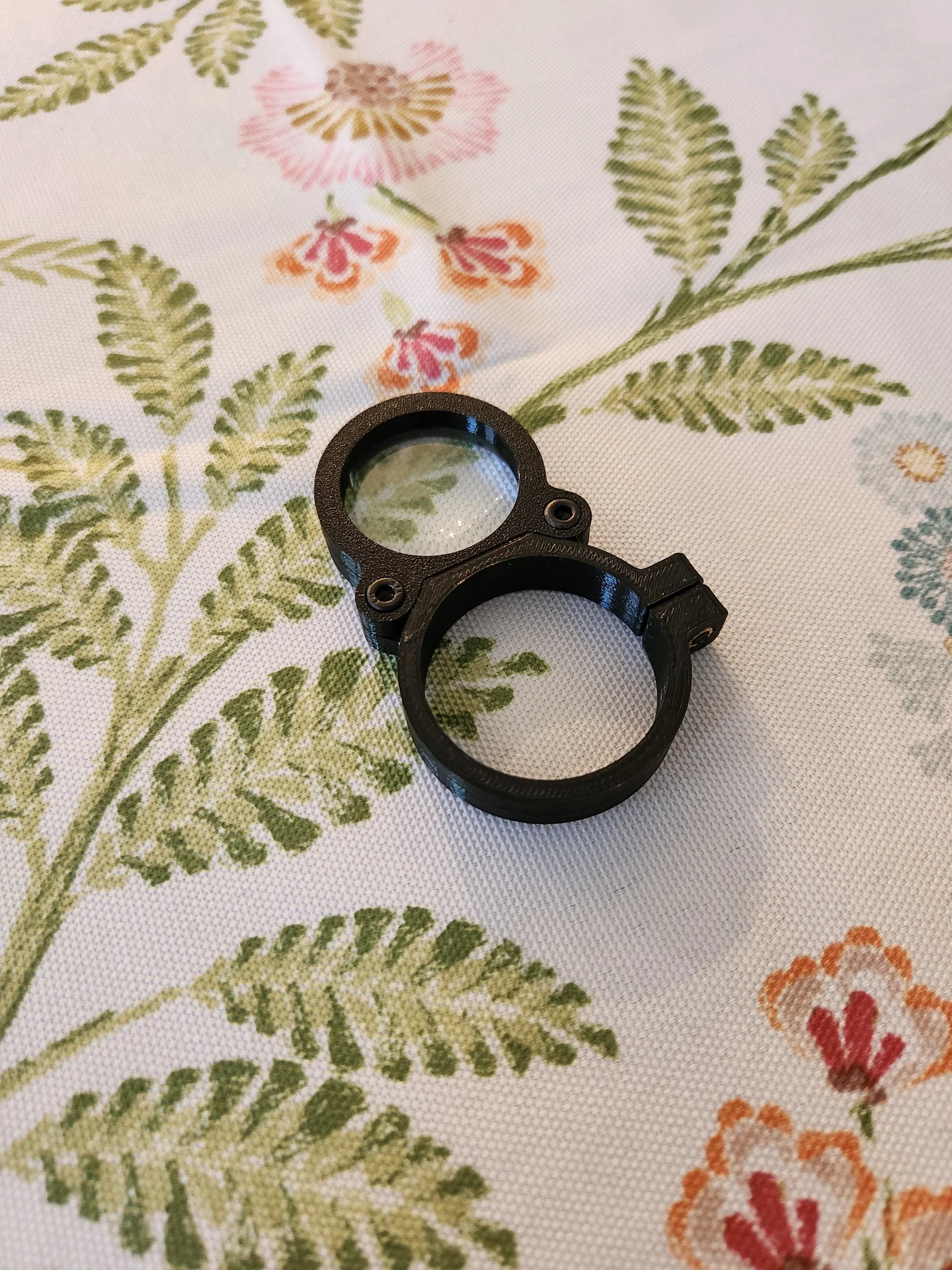Kính lúp gắn tháp chỉnh (Turret Magnifier) dành cho ống ngắm có đường kính thân 34mm. Sản phẩm được in bằng nhựa PETG. Phần thân ống của kính lúp được thiết kế có thể mở rộng đủ lớn để lắp vào ống ngắm mà không sợ bị gãy. Các linh kiện cần thiết: 2 - Ốc lục giác chìm M3 x 7mm 1 - Ốc đầu bằng M3 x 11mm 2 - Đai ốc mỏng M3 1 - Miếng chèn ren CNC Kitchen M3 x 3 * 1 - Thấu kính lồi hai mặt (Double Convex Lens), tiêu cự 50mm, đường kính 30mm.