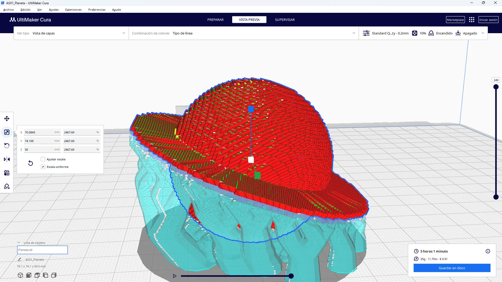 • Hỗ trợ in ấn (Support): Do thiết kế có vành đai trải rộng, bạn bắt buộc phải thiết lập hỗ trợ (support) trong phần mềm slicer như hình minh họa từ UltiMaker Cura để tránh lỗi khi in các phần nhô ra.