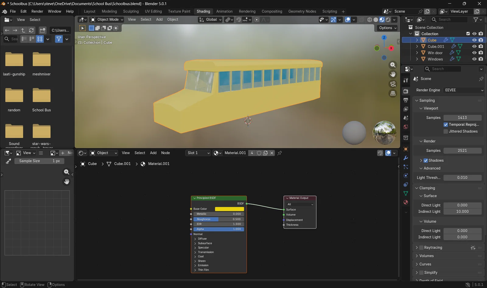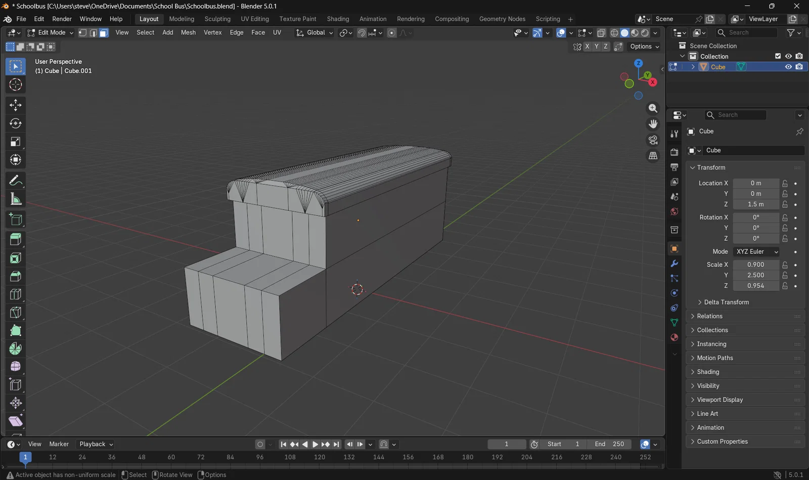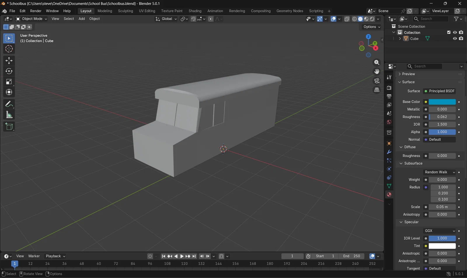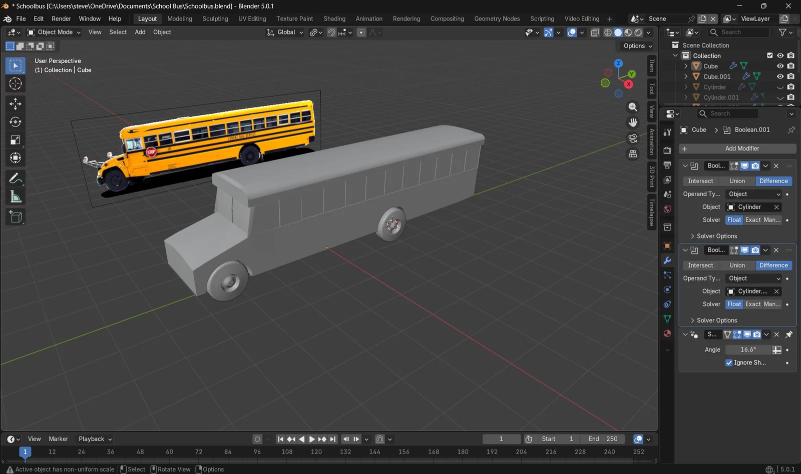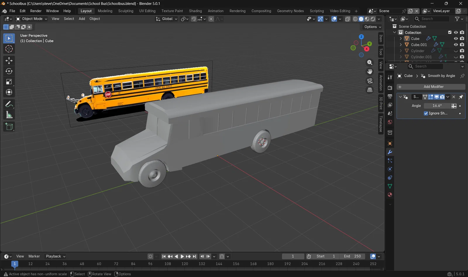 Mình tự tay thiết kế mô hình 3D này bằng phần mềm Blender. Mình quyết định làm chiếc xe bus trường học này vì muốn thử thách bản thân một chút. Khi tạo mẫu xe bus, mình phải cực kỳ cẩn thận để đảm bảo không có lỗi non-manifold geometry nào. Theo mình, phần khó nhất chính là phần đầu xe vì có quá nhiều đường cong và cấu trúc hình học độc đáo, rất tốn công để xử lý.