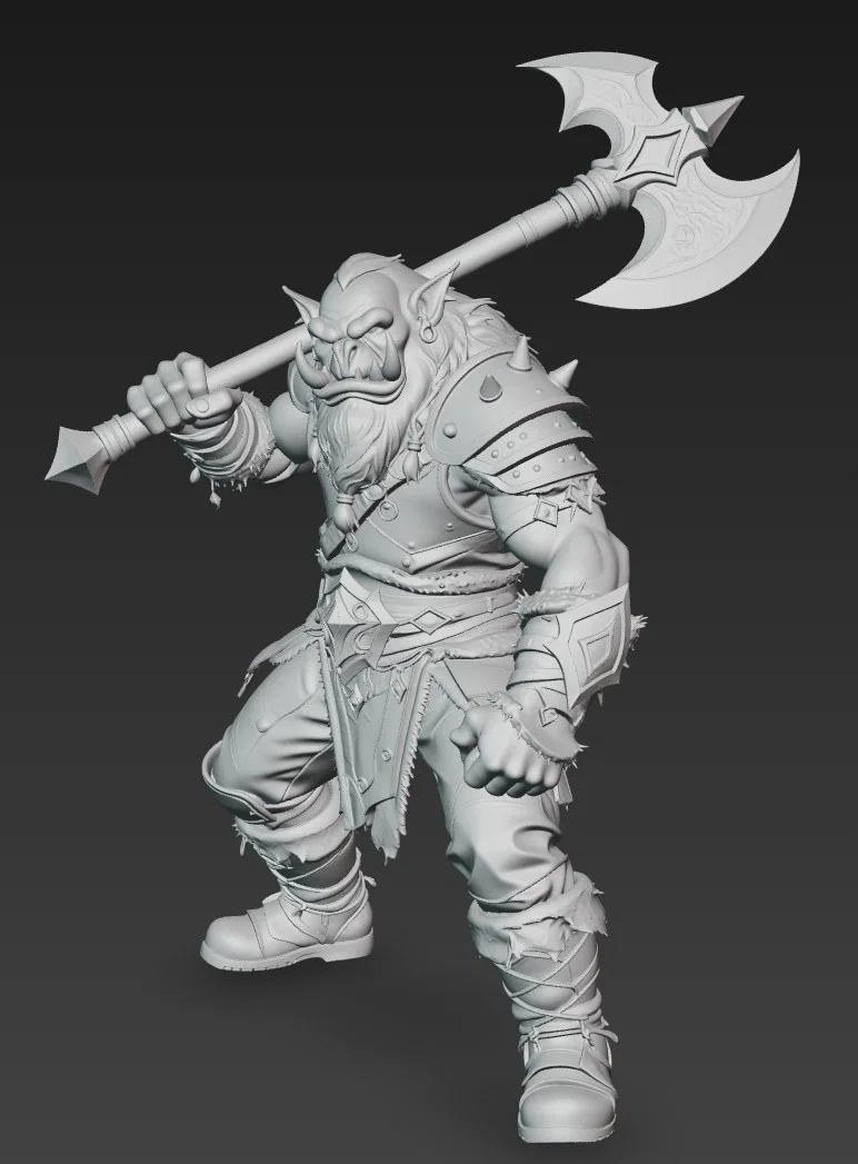 Mô hình này khắc họa một chiến binh Orc dũng mãnh, đang vác trên vai một cây rìu khổng lồ với thiết kế gai góc đầy uy lực. Các chi tiết như bộ râu dài, những chiếc nanh nhọn hoắt và bộ giáp vai gai nhọn tạo nên một vẻ ngoài đậm chất Dark Fantasy. Tỷ lệ mô hình được tính toán rất kỹ, cực kỳ phù hợp để in với nhựa Resin để làm nổi bật những đường vân trên da và các chi tiết chạm khắc tinh xảo trên vũ khí, mang lại kết quả sắc nét đến từng milimet.