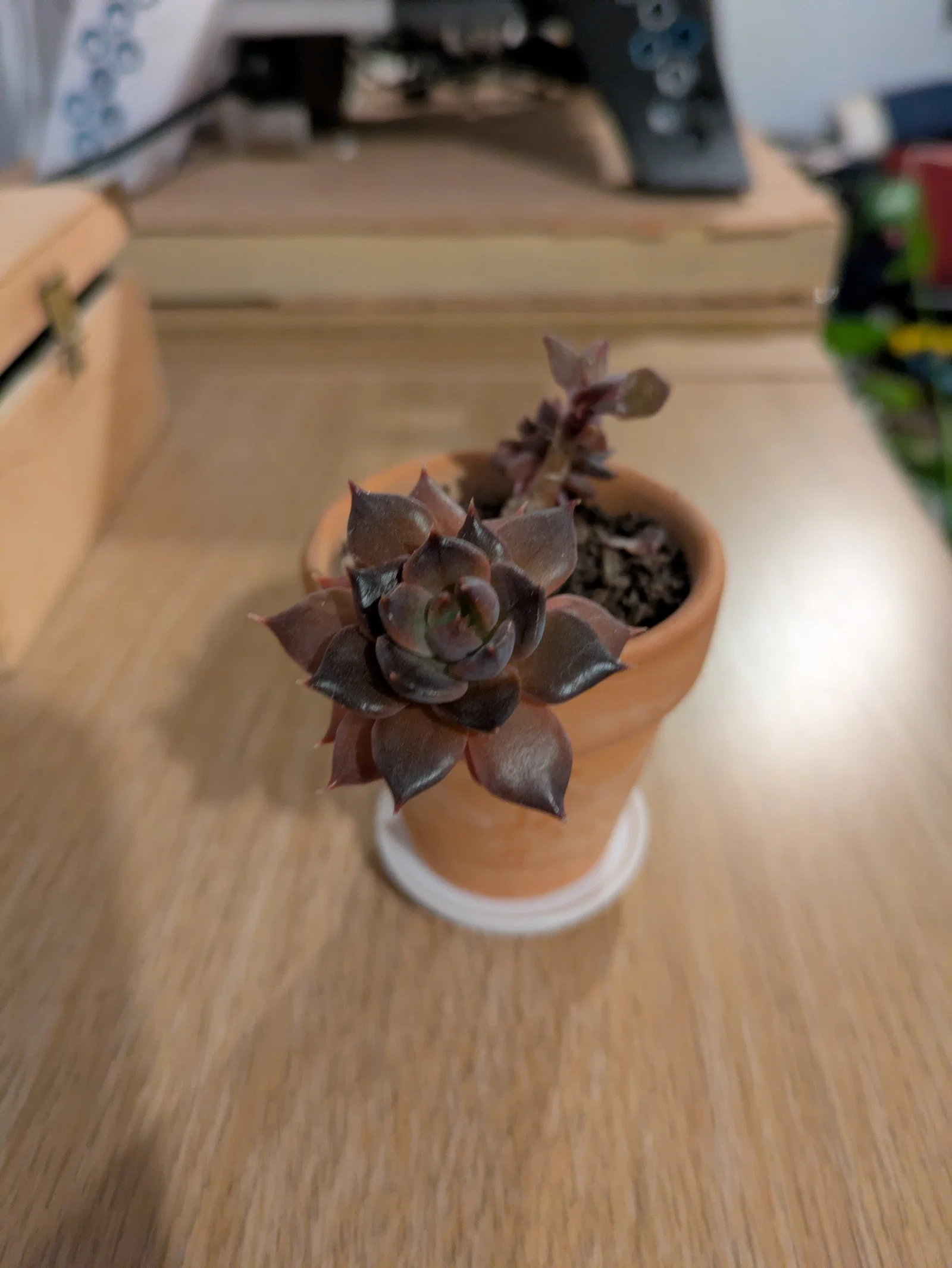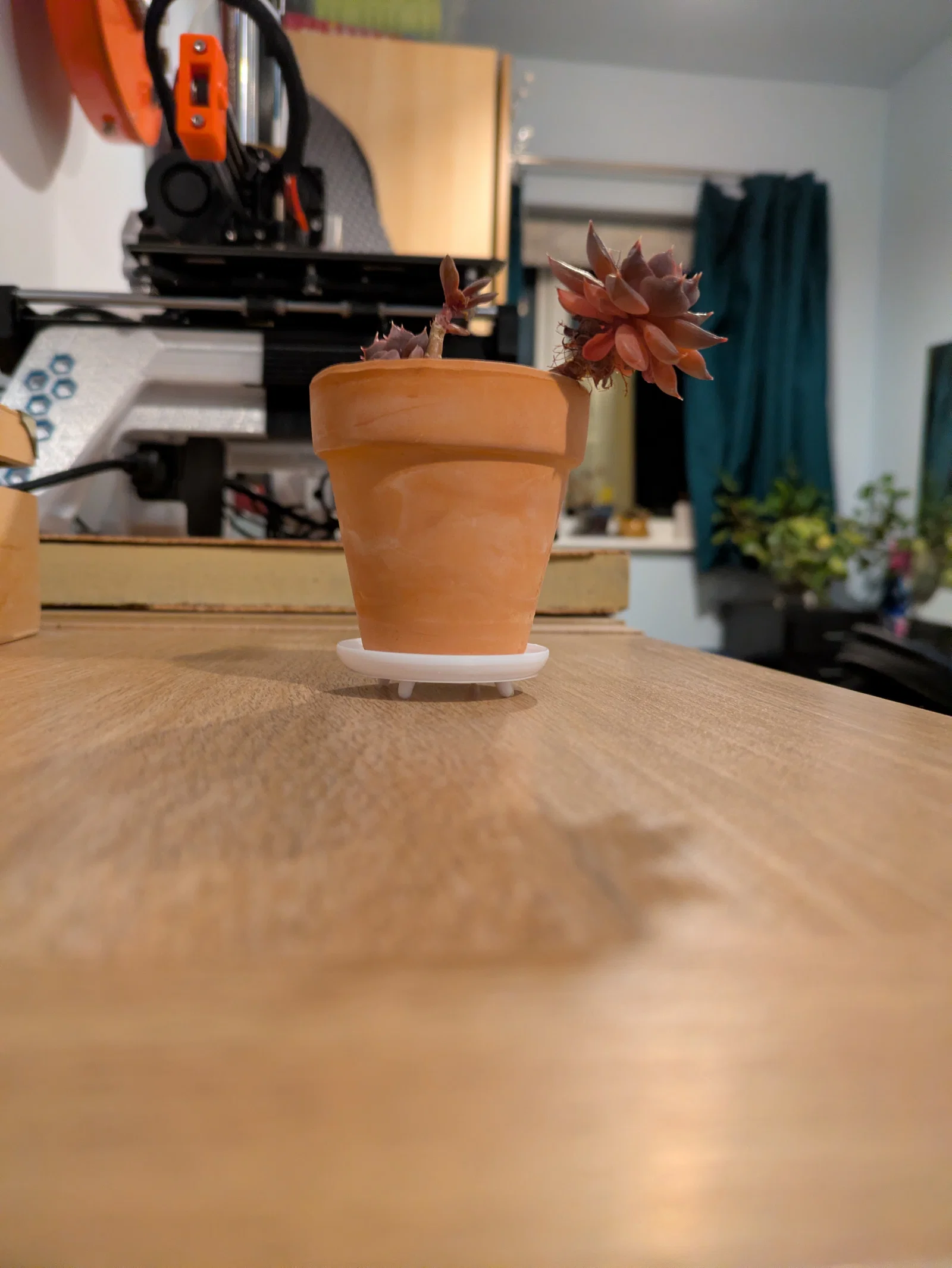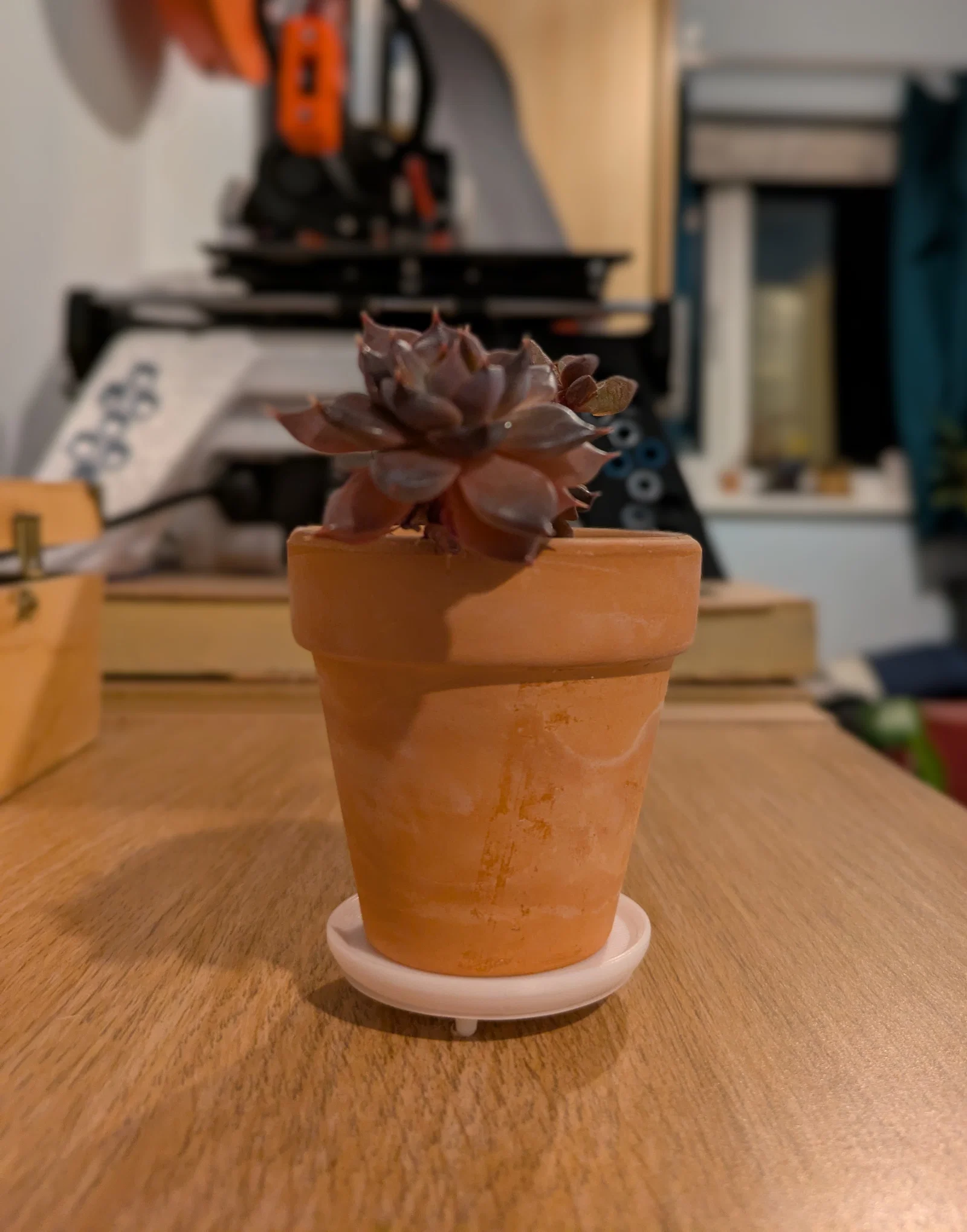 Chiếc khay lót chậu cây giúp nâng cao chậu một chút để tránh ẩm mốc cho bệ cửa sổ. Thiết kế cực nhỏ với đường kính 43mm, rất lý tưởng cho các chậu xương rồng tí hon. Phần chân đế dạng khớp ấn dễ dàng lắp đặt và đảm bảo độ kín nước khi in đúng cách.