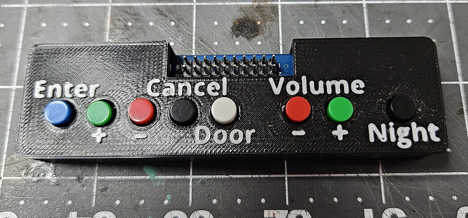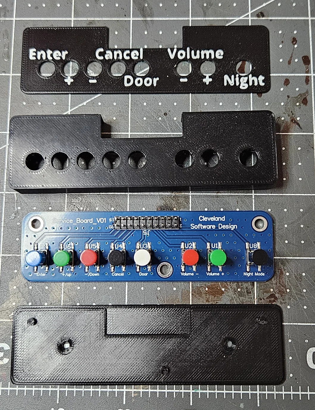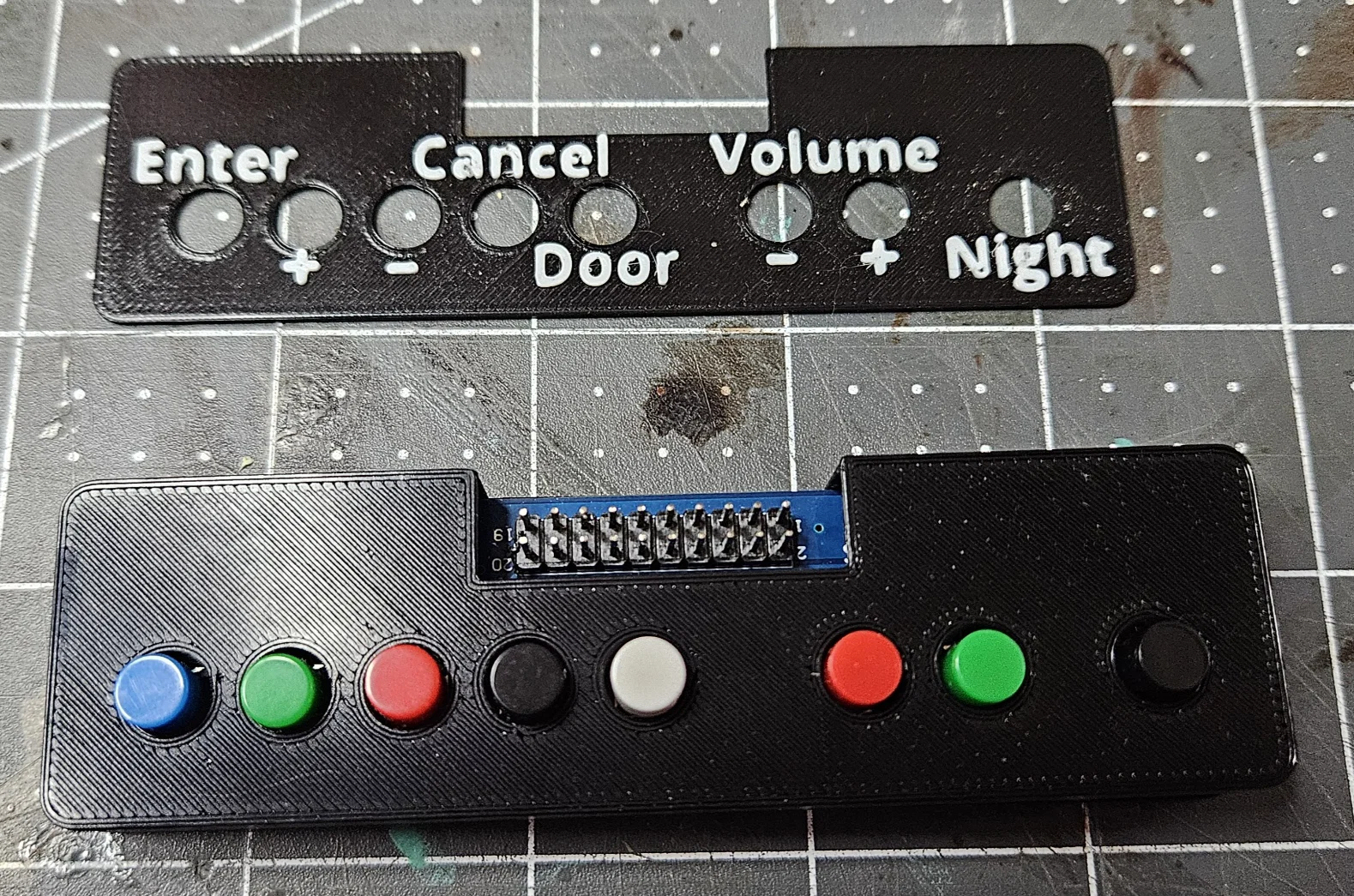 Mình muốn tìm một cách tốt hơn để gắn bo mạch này, đồng thời làm cho phần chú thích chức năng của từng nút bấm trở nên dễ nhìn hơn. Mình đã thiết kế mẫu này để in cực kỳ dễ dàng trên máy in 1 sợi nhựa (single filament) mà không cần dùng support.
