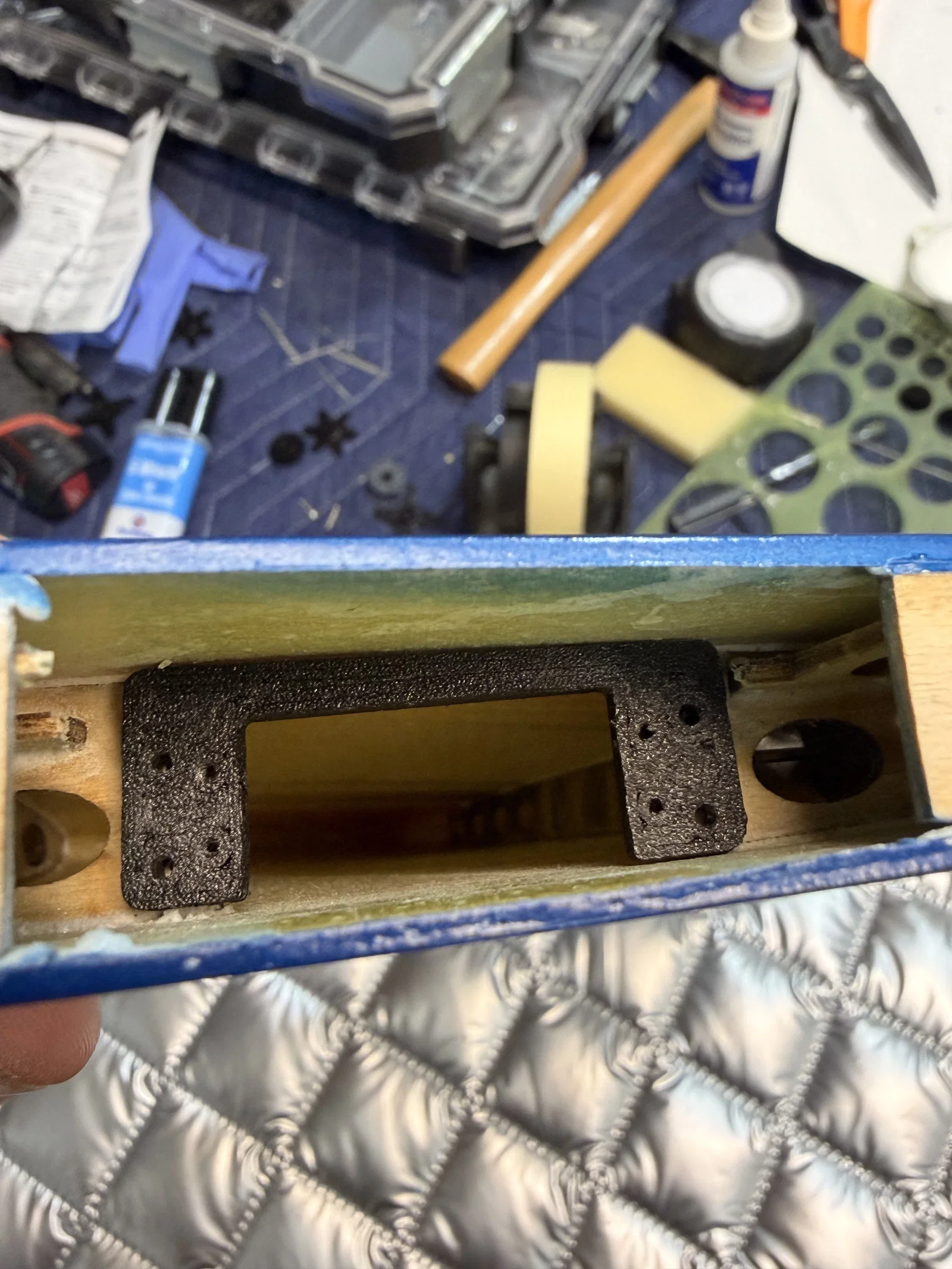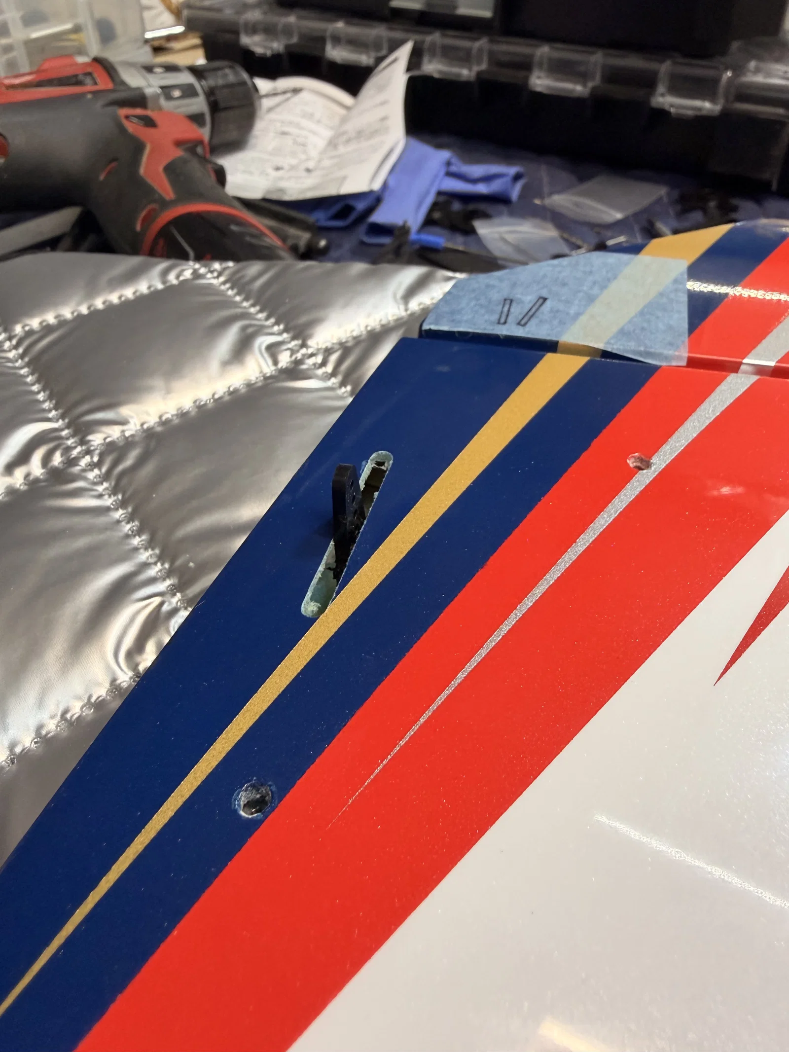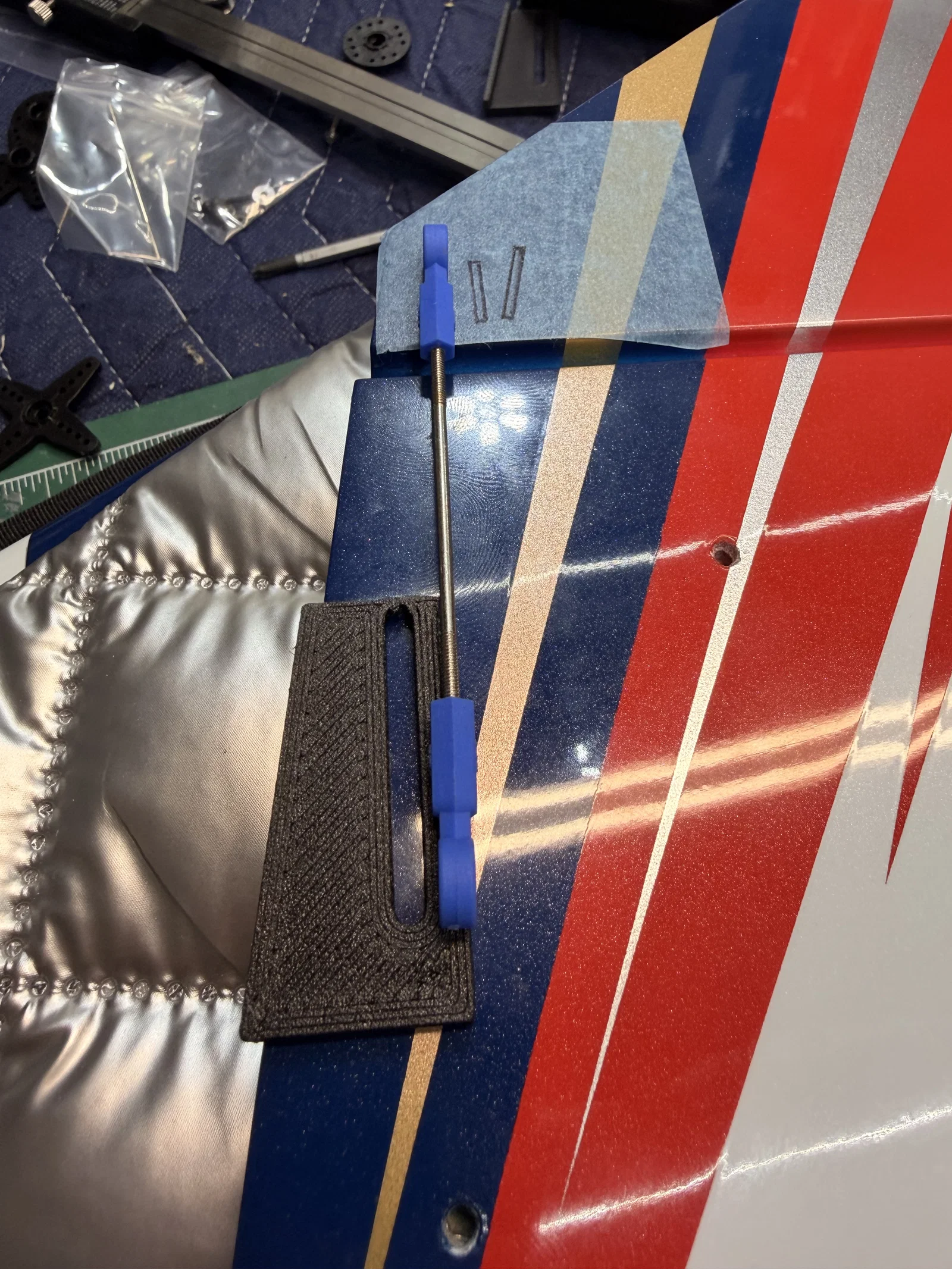 Tệp tải lên này bao gồm ba chi tiết. Bộ chuyển đổi cánh (wing adapters) chỉ cần dán trực tiếp vào phần lỗ mở có sẵn trong bộ kit. Bạn có thể cần phải nới rộng lỗ ra một chút vì độ khít rất chặt. Hãy dùng keo epoxy để dán chúng vào khung hiện có, sau đó khoan xuyên qua các lỗ bắt vít của servo A600. Bộ chuyển đổi servo stab sẽ được dán trực tiếp lên trên gân (rib) có sẵn. Hãy tận dụng các lỗ lớn hơn lỗ gắn A600 để căn chỉnh khớp với các lỗ trên gân bằng cách dùng một cây ghim chữ T hoặc vật dụng tương tự khi dán, nhờ đó bạn sẽ biết chắc chắn vị trí đã trùng với lỗ của nhà sản xuất. Đồ gá khe (Slot jig) đóng vai trò là hướng dẫn để bạn dùng máy Dremel khoét một khe cho tay đòn servo. Bạn sẽ cần hai cái và chúng cần được đối xứng cho mỗi bên. Bạn có thể thực hiện lệnh mirror trong phần mềm in 3D (như Orca, v.v.). Hãy dùng mắt để căn tâm của khe thẳng hàng với trục đầu ra, sau đó dán băng dính cố định và dùng máy Dremel cùng đầu mài để khoét khe. Nhớ kiểm tra kỹ các thông số đo đạc trước khi cắt bất cứ thứ gì nhé!