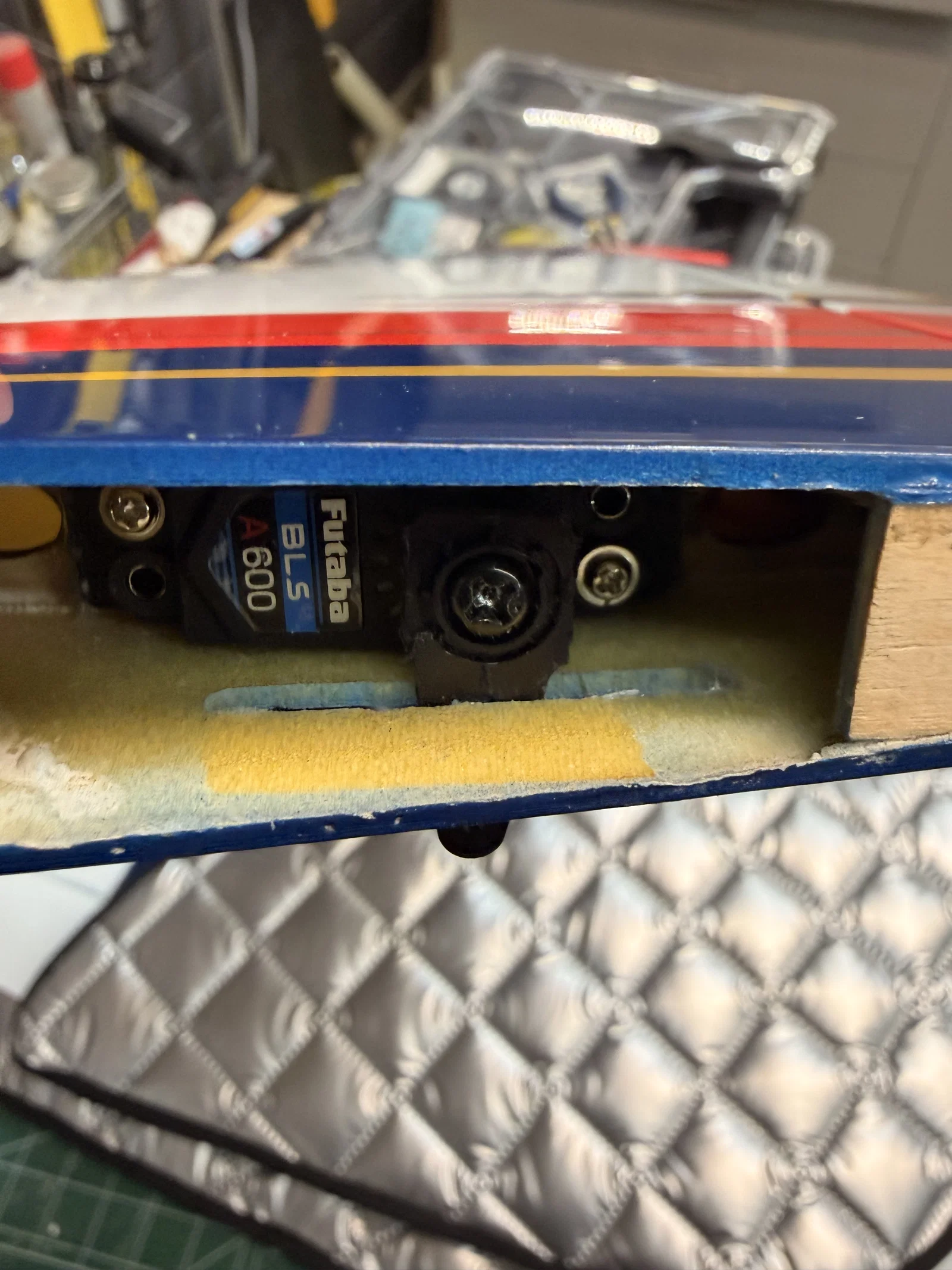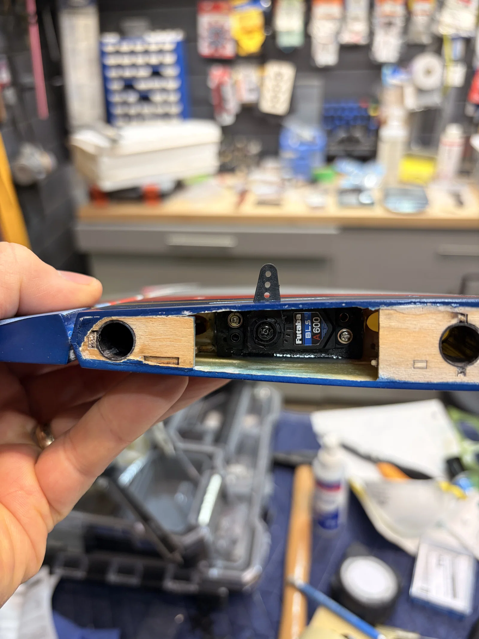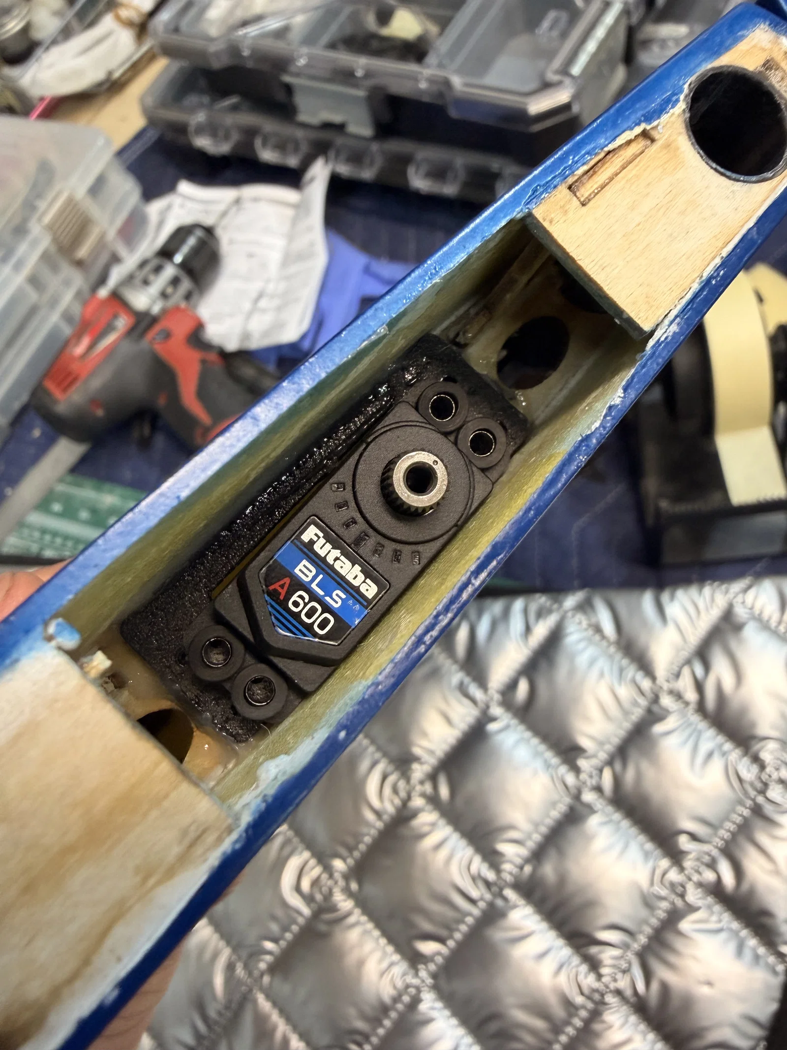 Các linh kiện cần thiết để lắp servo Futaba BLS A600 vào vị trí cánh và đuôi của máy bay VLV Aurora. Bao gồm bộ chuyển đổi cánh, servo stab và đồ gá (jig) để khoét khe tay đòn servo một cách chính xác.