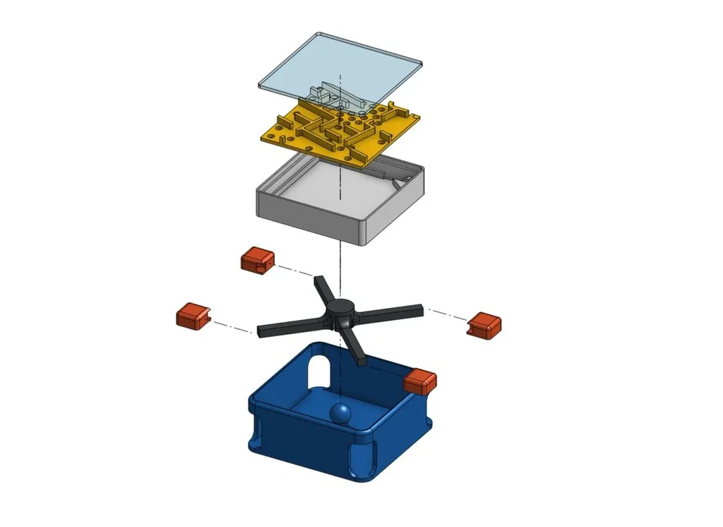 Một mẫu mê cung dễ in, đặt vừa vặn trên bàn, cho phép bạn dùng ngón cái và ngón trỏ để điều khiển tấm bảng. Thiết kế này hướng tới việc thay đổi các khung mê cung bằng khớp nối - nhưng hiện tại mình mới chỉ làm một bản thôi. Bên trong có một đường dốc để bi lăn trở về vị trí xuất phát. Bạn có thể lắp thêm nắp nhựa acrylic (tùy chọn) để tránh việc bi bị văng ra ngoài.