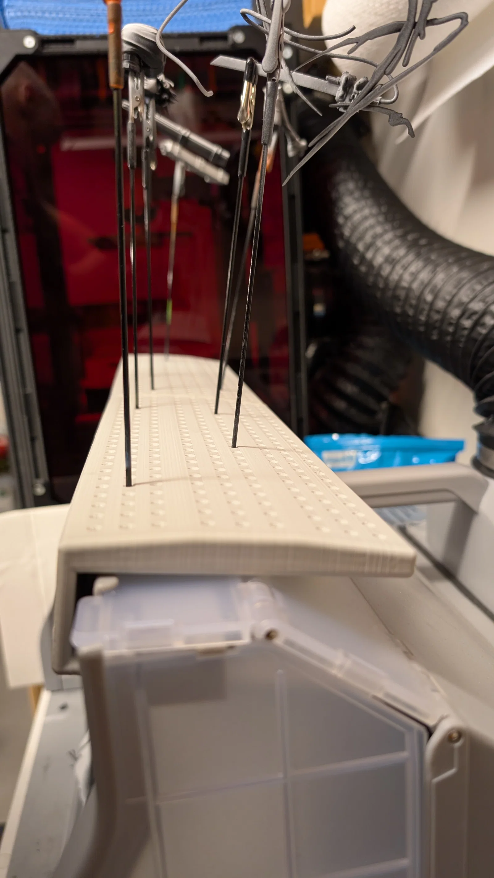 Mình cần một cái giá để cắm mấy cái kẹp cá sấu (alligator clips) khi đang đợi khô. Cái này dùng siêu ngon luôn, mình còn có thể bê nguyên bộ ra ngoài để xịt lót (primer) nhanh gọn lẹ. Nó tự đứng vững được, hoặc bạn chỉ cần trượt nó vào Paint Booth là xong. Bạn chỉ cần in mặt bên trái, rồi lật gương (mirror) để có mặt bên phải. Sau đó dán chúng lại với nhau khi đang đặt trên mặt phẳng là được. Chúc mọi người in vui vẻ nhé!
