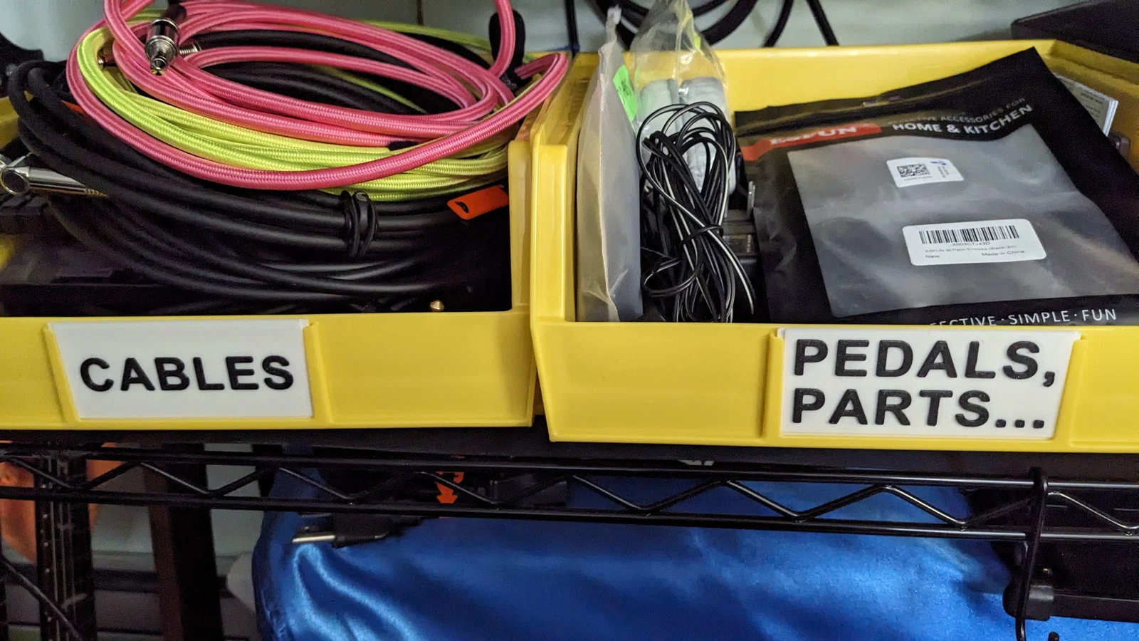 Điểm đặc biệt của thiết kế này là tính linh hoạt cực cao, cho phép bác lồng ghép nội dung văn bản tùy chỉnh trực tiếp lên bề mặt nhãn. Bác có thể in tên từng loại vật dụng như "Cables", "Pedals", "Parts" hoặc bất cứ nội dung nào mà bác muốn để quản lý kho đồ của mình thật ngăn nắp. Khi nhìn vào không gian làm việc được sắp xếp chỉn chu, dán nhãn rõ ràng, bác sẽ thấy việc tìm kiếm linh kiện nhanh chóng hơn rất nhiều, không còn cảnh bới tung mọi thứ lên chỉ để tìm một sợi dây hay con ốc nhỏ nữa.