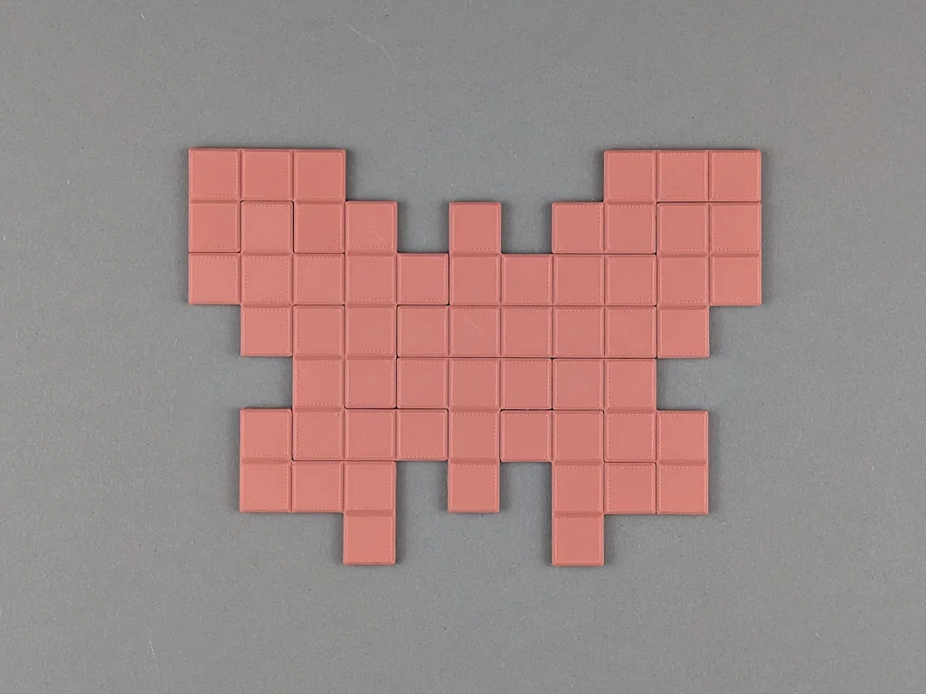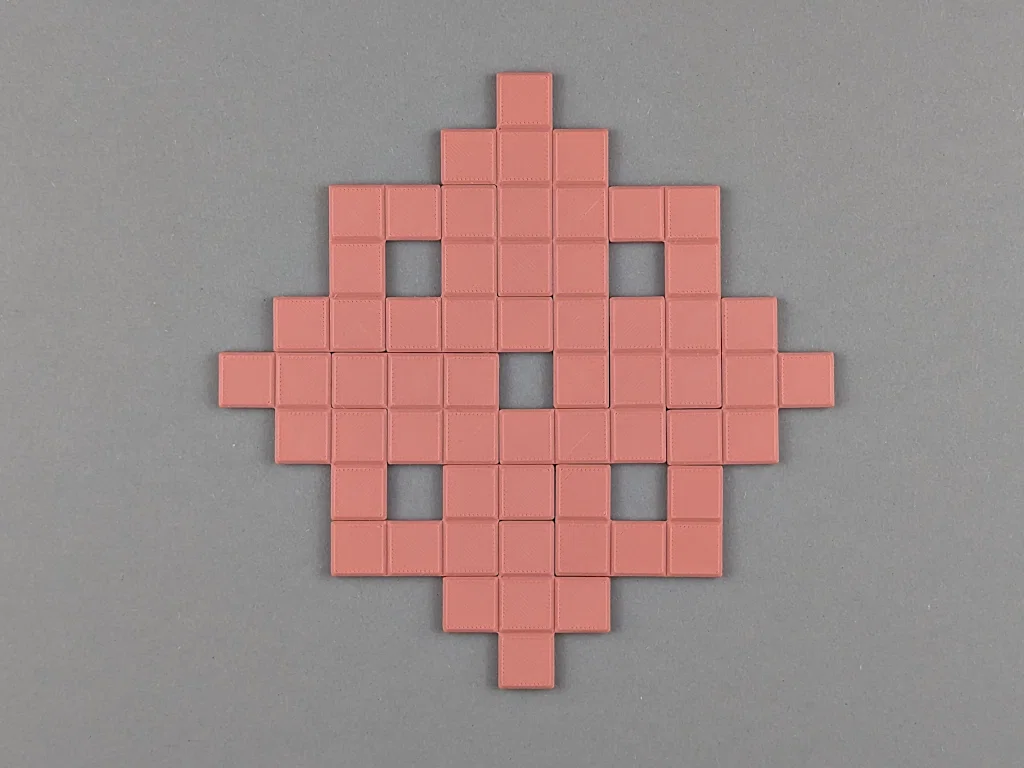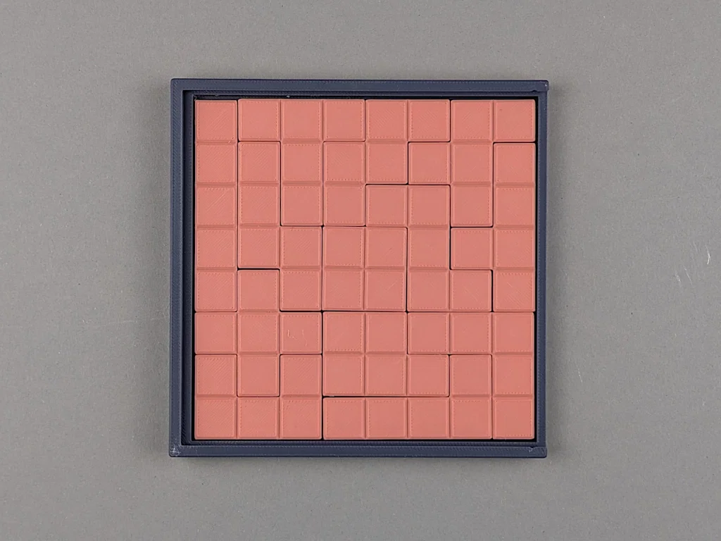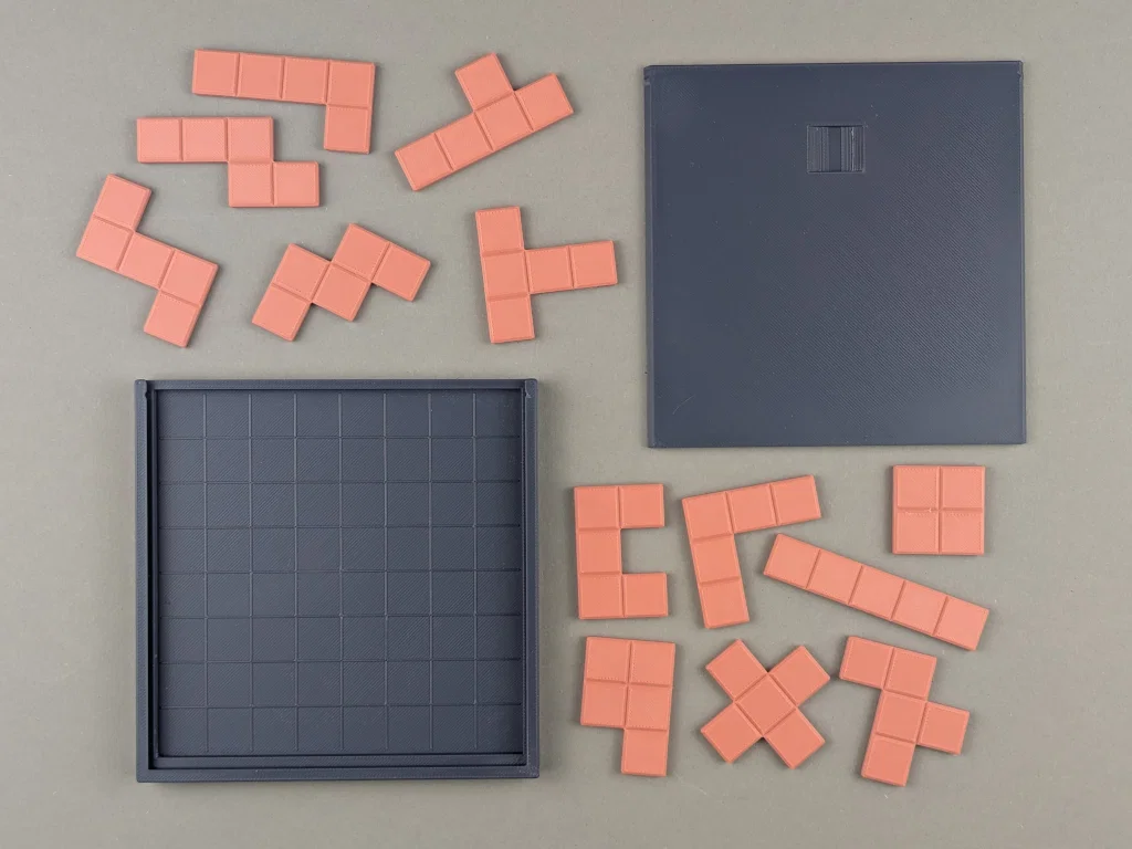 Pentomino là các đa hình (polyforms) được tạo thành từ 5 ô vuông. Có 12 cách sắp xếp khác nhau. Vì 12 miếng pentomino chiếm diện tích 60 ô vuông, nên một miếng tetromino (4 đơn vị) được thêm vào để lấp đầy diện tích 8x8 (64 ô vuông). Bộ này sử dụng các miếng ghép dày 4 mm. Nếu bạn quan tâm đến các thử thách không gian, mình có đăng tải một bộ giải đố pentomino khác dành cho mô hình 3D trên Printables.