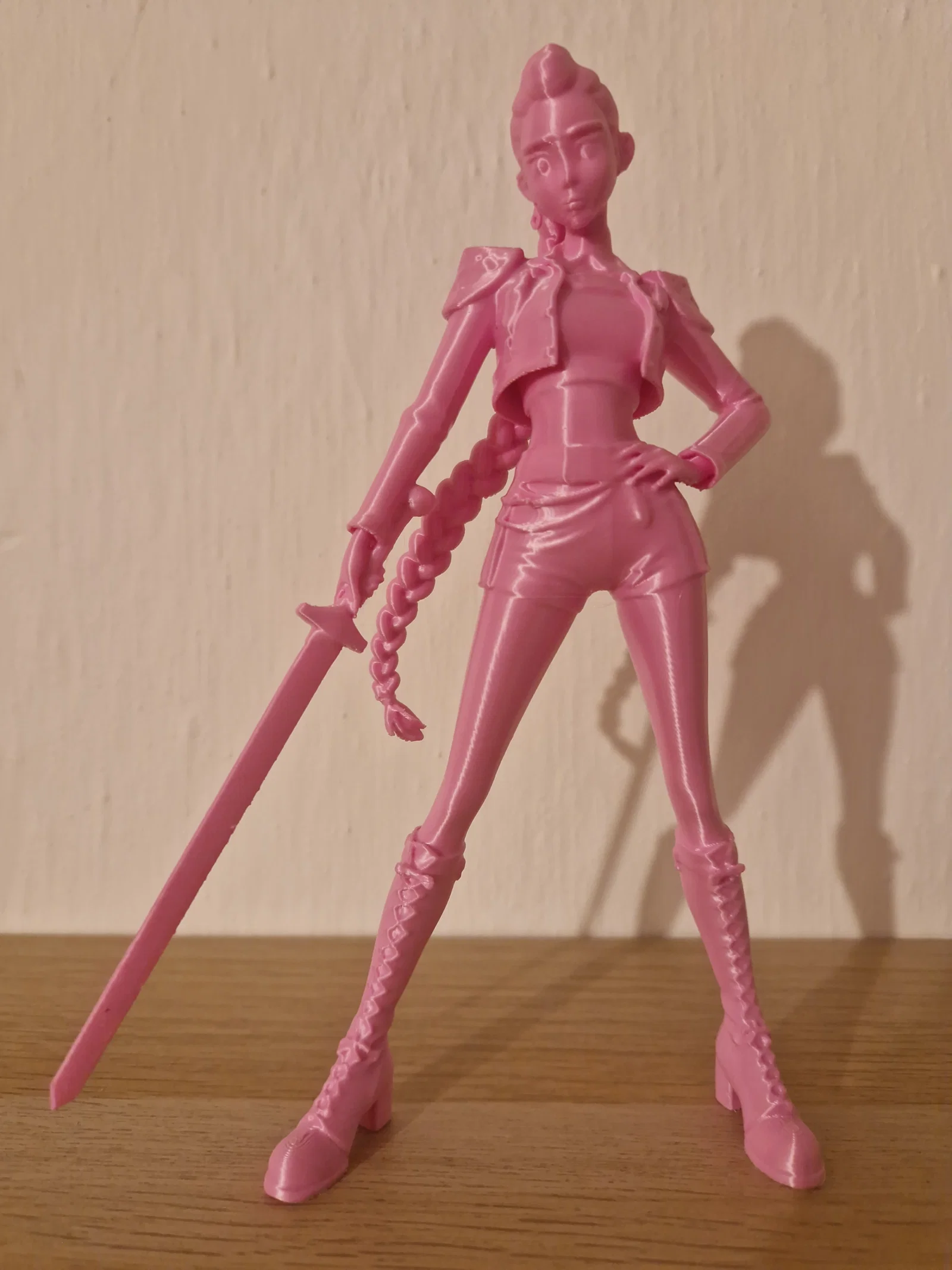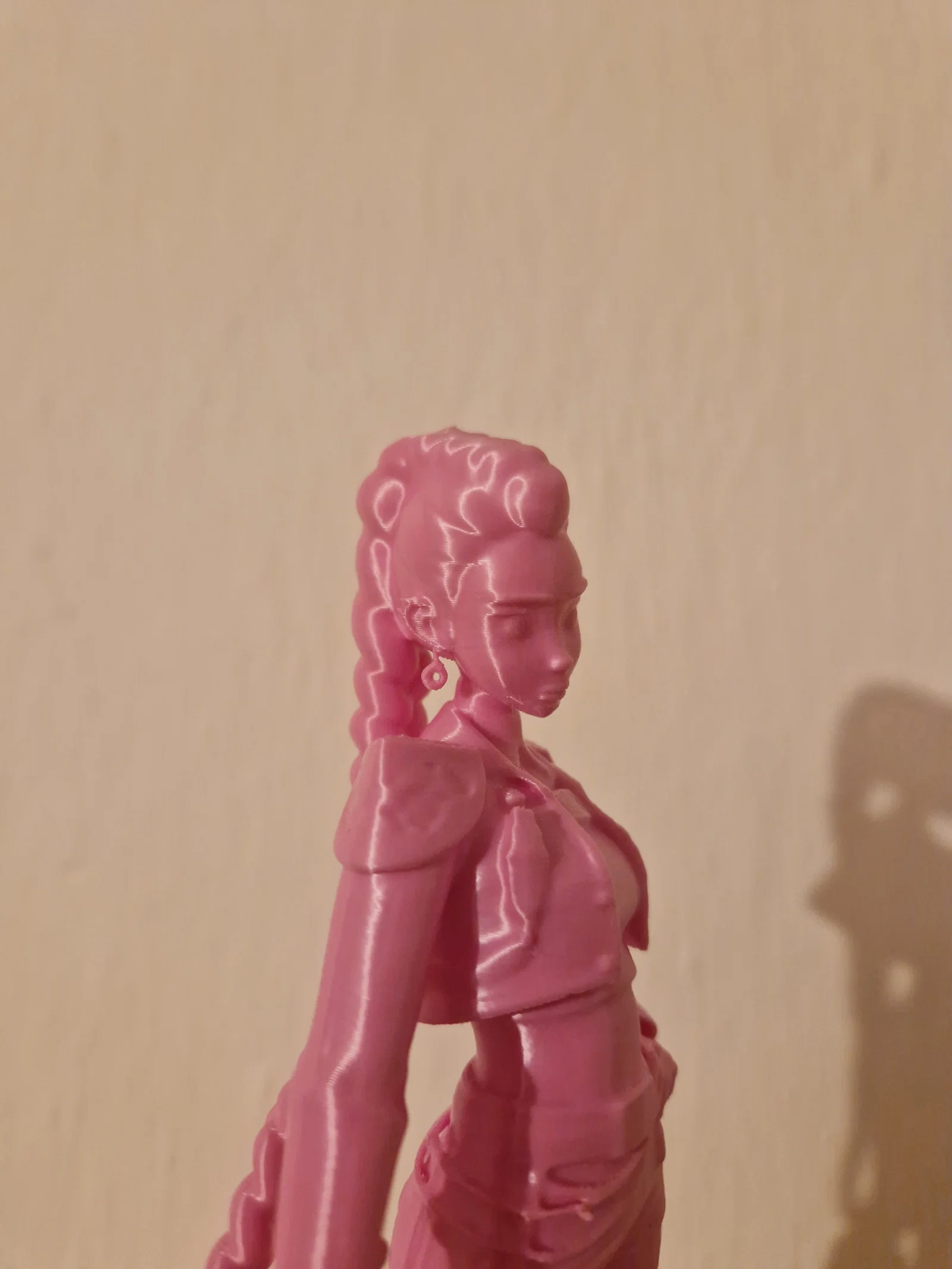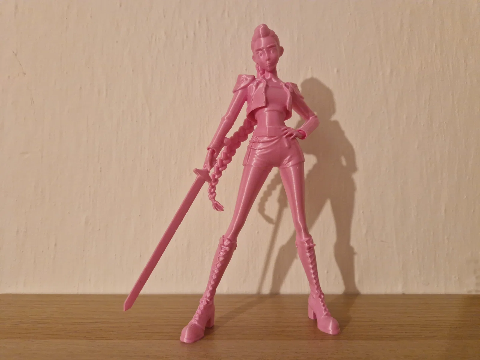 Con gái mình cực kỳ mê series K-Pop Demon Hunters, nhất là nhân vật Rumi. Bé muốn có một mô hình riêng nhưng mình tìm trên MakerWorld mãi không thấy mẫu nào ưng ý, nên mình quyết định tự thiết kế một bản custom cho con với bộ trang phục từ lễ trao giải International IDOL Awards, kèm theo cả thanh kiếm của cô nàng nữa. Con bé rất thích mô hình này và giờ lại đòi mình làm thêm cả Mira với Zoey nữa... khổ thân mình ghê 😀 Mình khuyên các bạn nên giảm tốc độ in xuống nha — vì mô hình cao gần 20cm nên nếu in nhanh quá, rung lắc sẽ làm ảnh hưởng đến chất lượng in đó. ##### Mẹo in ấn: Đầu phun (nozzle): 0,4mm Độ dày lớp in (layer): 0,16mm Vách tường (walls): 2 Độ đặc (infill): 15% * Nên dùng support dọc theo lưỡi kiếm để tránh rung lắc khi in. Và cuối cùng, có một thử thách nhỏ cho mọi người đây: ai có thể gỡ support mà không làm gãy chiếc bông tai như mình không? 😉