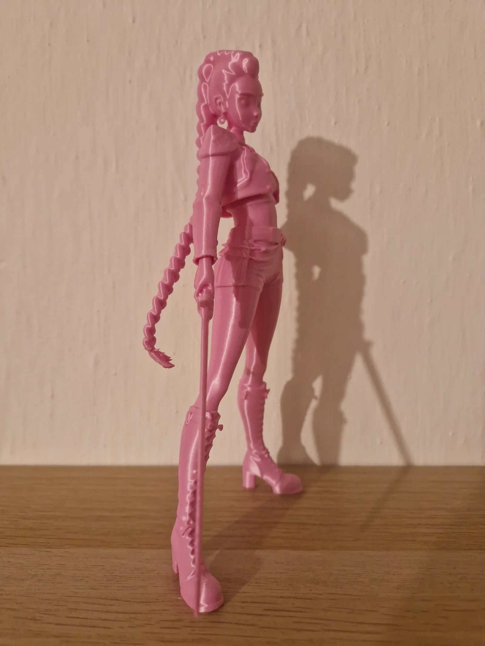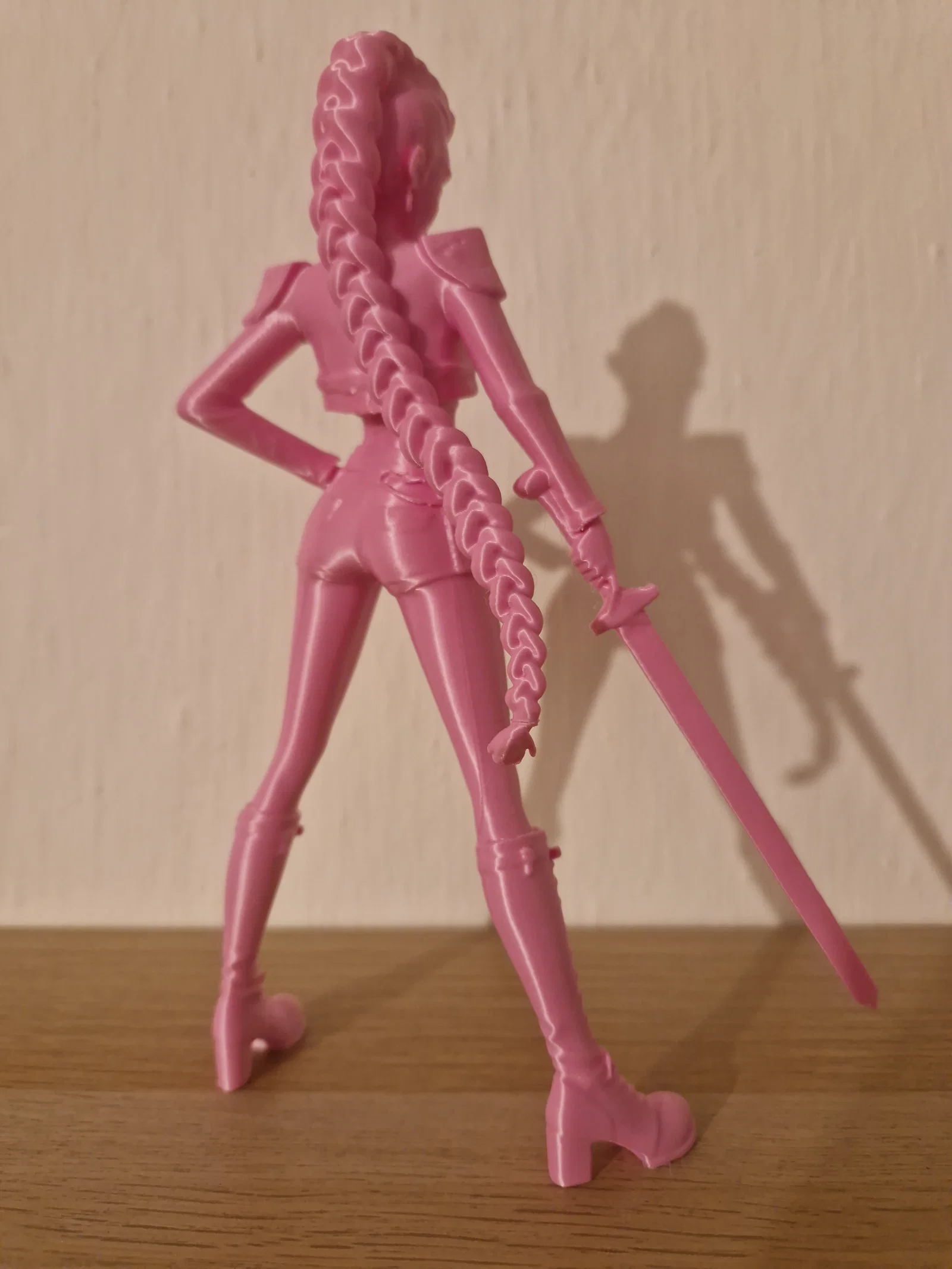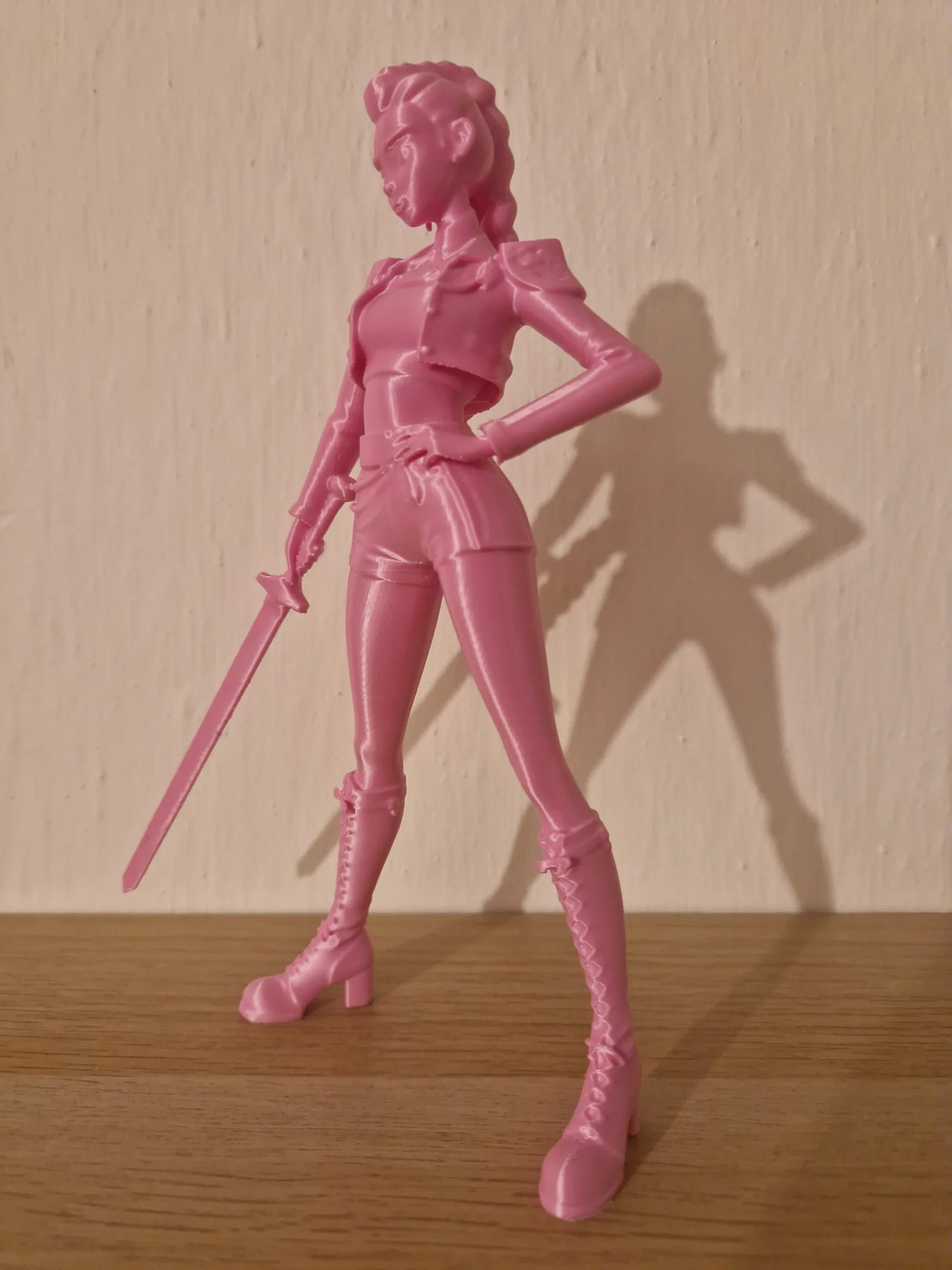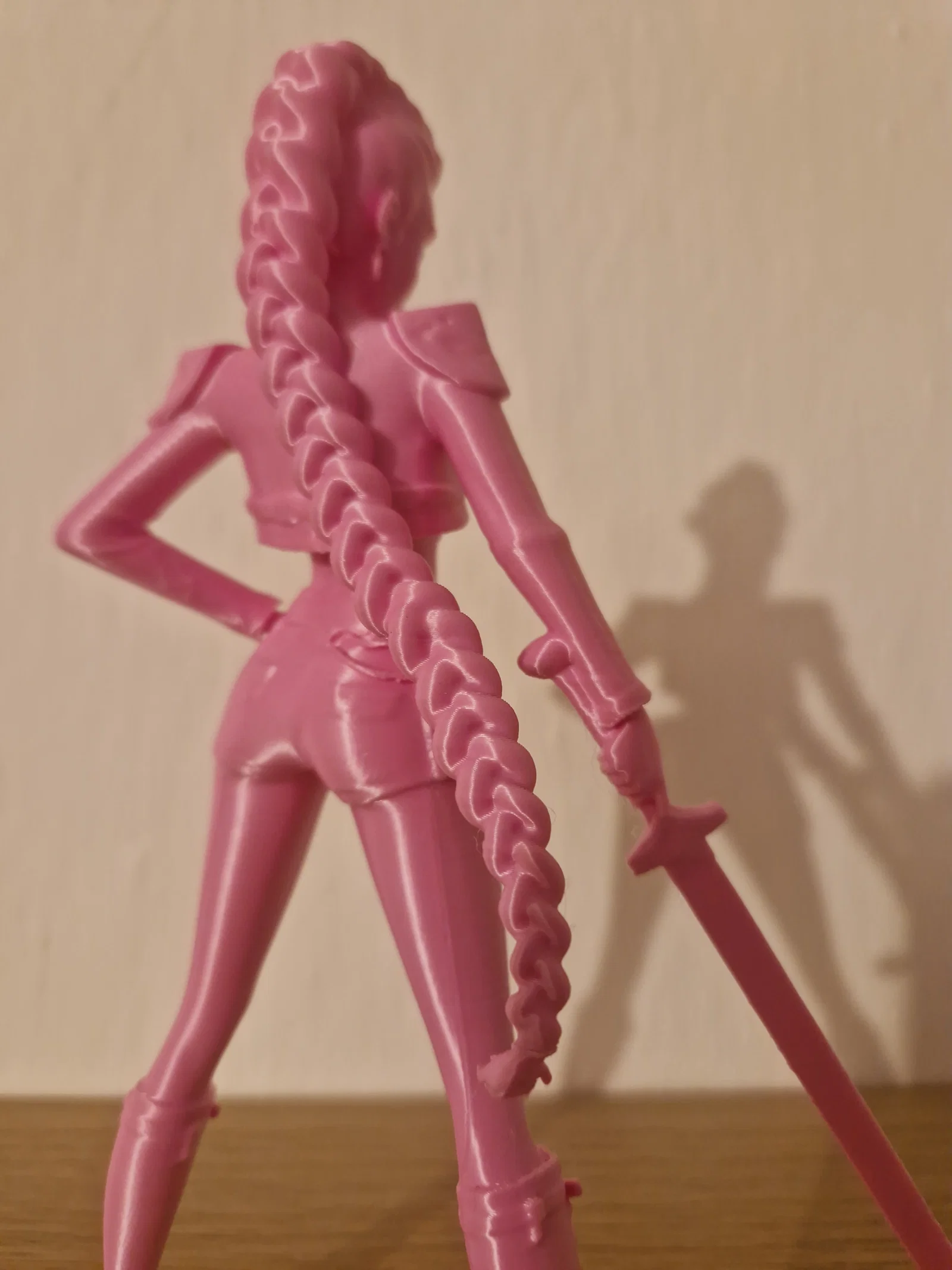Con gái mình cực kỳ mê series K-Pop Demon Hunters, nhất là nhân vật Rumi. Bé muốn có một mô hình riêng nhưng mình tìm trên MakerWorld mãi không thấy mẫu nào ưng ý, nên mình quyết định tự thiết kế một bản custom cho con với bộ trang phục từ lễ trao giải International IDOL Awards, kèm theo cả thanh kiếm của cô nàng nữa. Con bé rất thích mô hình này và giờ lại đòi mình làm thêm cả Mira với Zoey nữa... khổ thân mình ghê 😀 Mình khuyên các bạn nên giảm tốc độ in xuống nha — vì mô hình cao gần 20cm nên nếu in nhanh quá, rung lắc sẽ làm ảnh hưởng đến chất lượng in đó. ##### Mẹo in ấn: Đầu phun (nozzle): 0,4mm Độ dày lớp in (layer): 0,16mm Vách tường (walls): 2 Độ đặc (infill): 15% * Nên dùng support dọc theo lưỡi kiếm để tránh rung lắc khi in. Và cuối cùng, có một thử thách nhỏ cho mọi người đây: ai có thể gỡ support mà không làm gãy chiếc bông tai như mình không? 😉