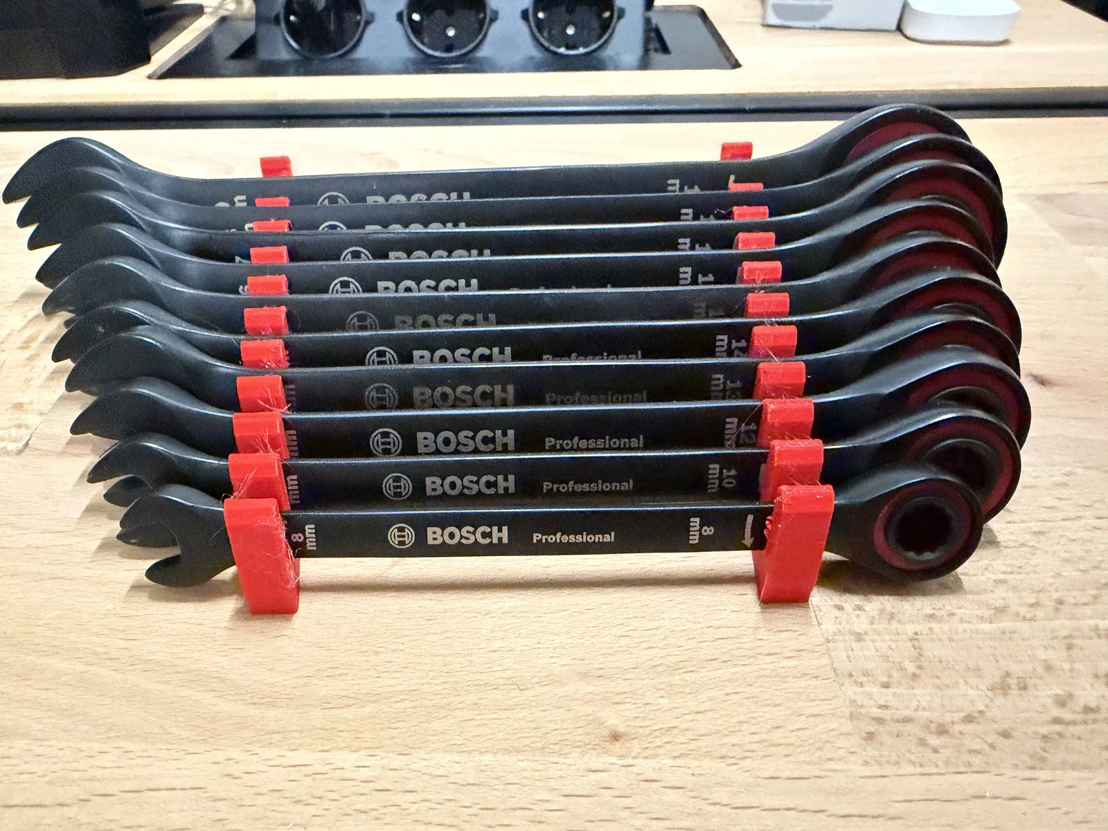 Mình đã in cái giá đỡ này bằng nhựa PLA với các thiết lập thông thường và kết quả rất ổn. Bosch cung cấp 10 chiếc cờ lê, ít hơn 11 chiếc của Wera, nhưng vẫn còn dư một chỗ để bạn để thêm một chiếc cờ lê khác. Mình cũng tận dụng cái giá đỡ này để sắp xếp cờ lê gọn gàng trong hộc tủ bàn làm việc, giúp tiết kiệm không gian và lấy ra sử dụng rất tiện lợi.