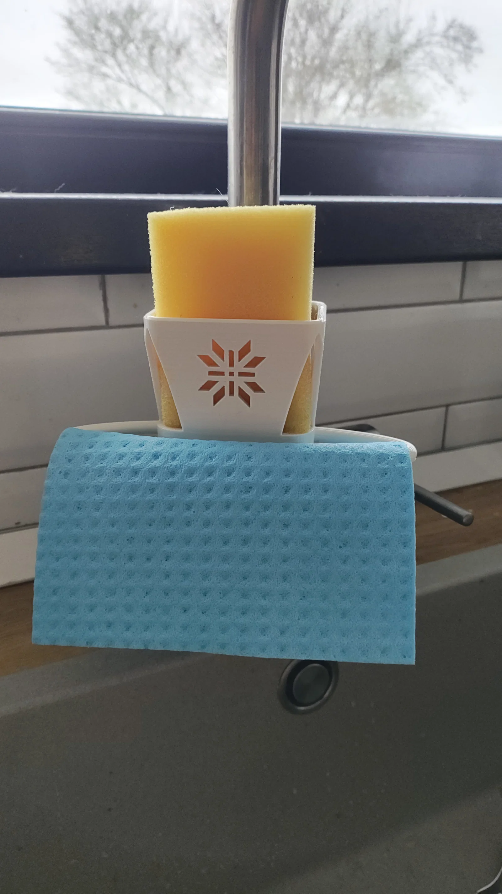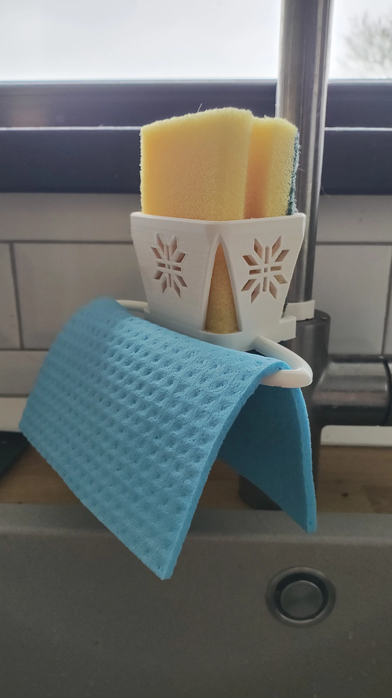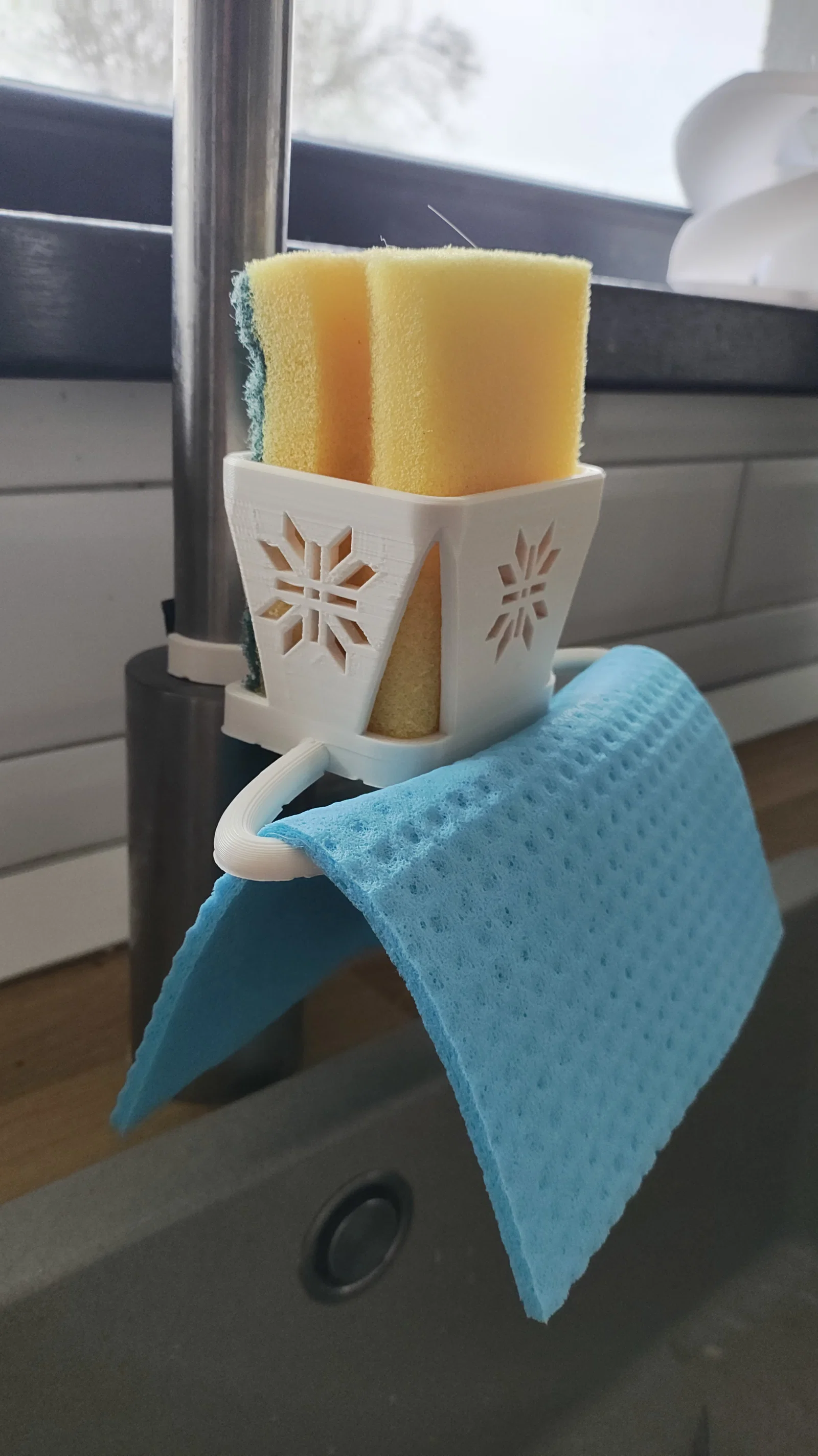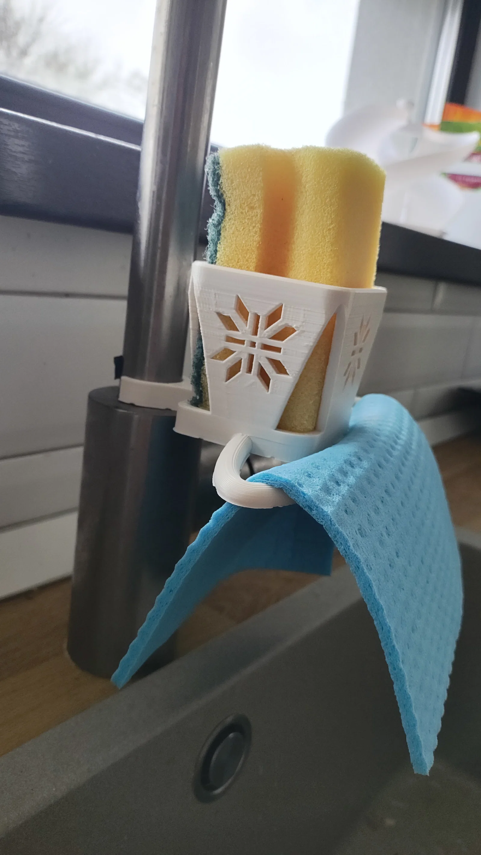 Đây là phiên bản nâng cấp của giá đỡ bọt biển kẹp vòi nước, nay tích hợp thêm giá treo khăn lau tiện lợi. Sản phẩm được thiết kế tối ưu cho in 3D với mọi loại vật liệu, phù hợp với hầu hết các loại vòi nước thông dụng hiện nay.
