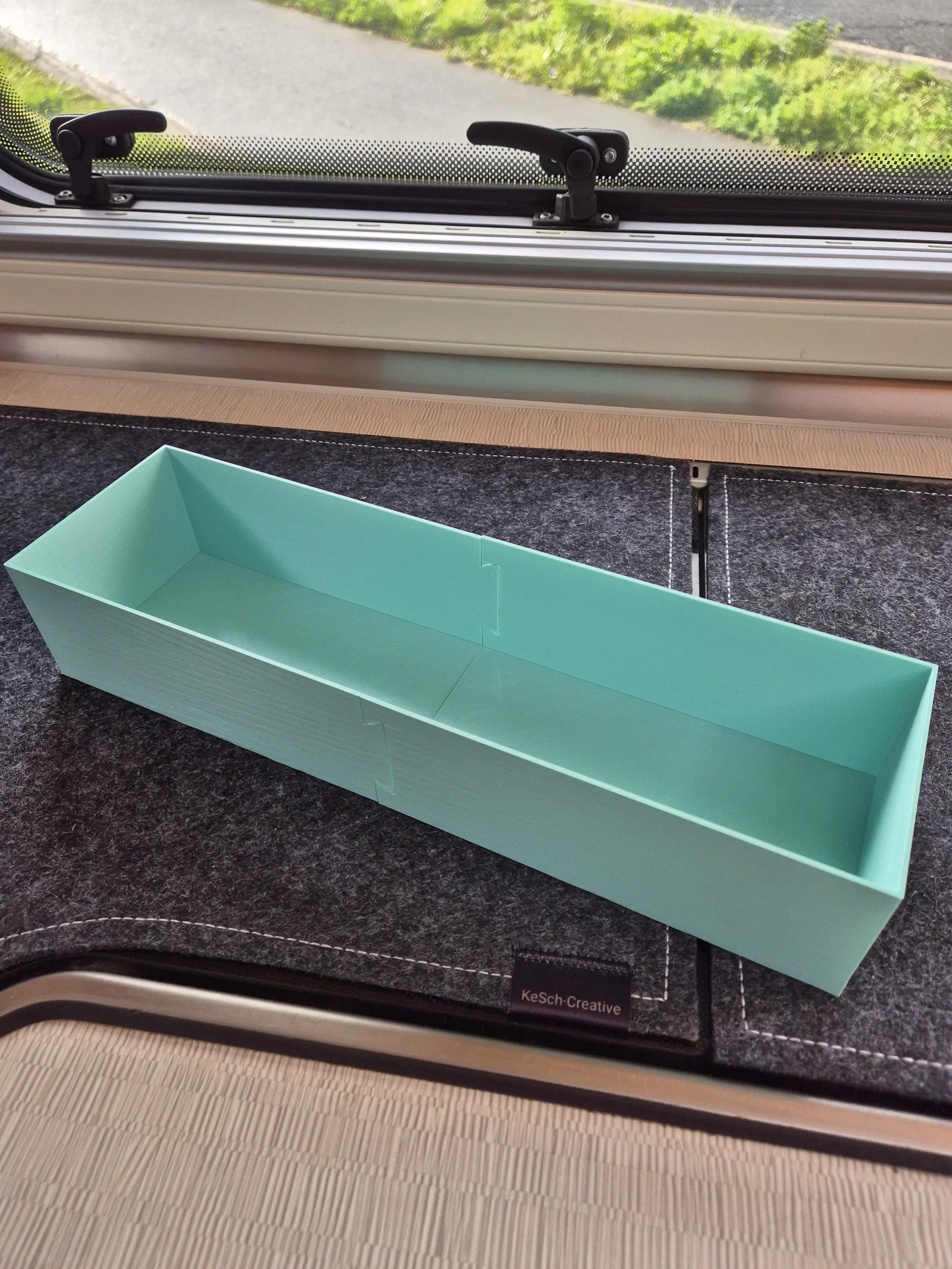 Ngăn chứa đồ cho tủ gương trên xe Fendt Saphir 465 đời 2015. Ngăn chứa này có kích thước 315 x 90 x 60 mm (Dài x Rộng x Cao). Mình đã cắt đôi mô hình ở giữa trong phần mềm Slicer và sử dụng khớp nối kiểu đuôi én (dovetail) để ghép lại. Phần khớp đuôi én cần phải có support khi in.