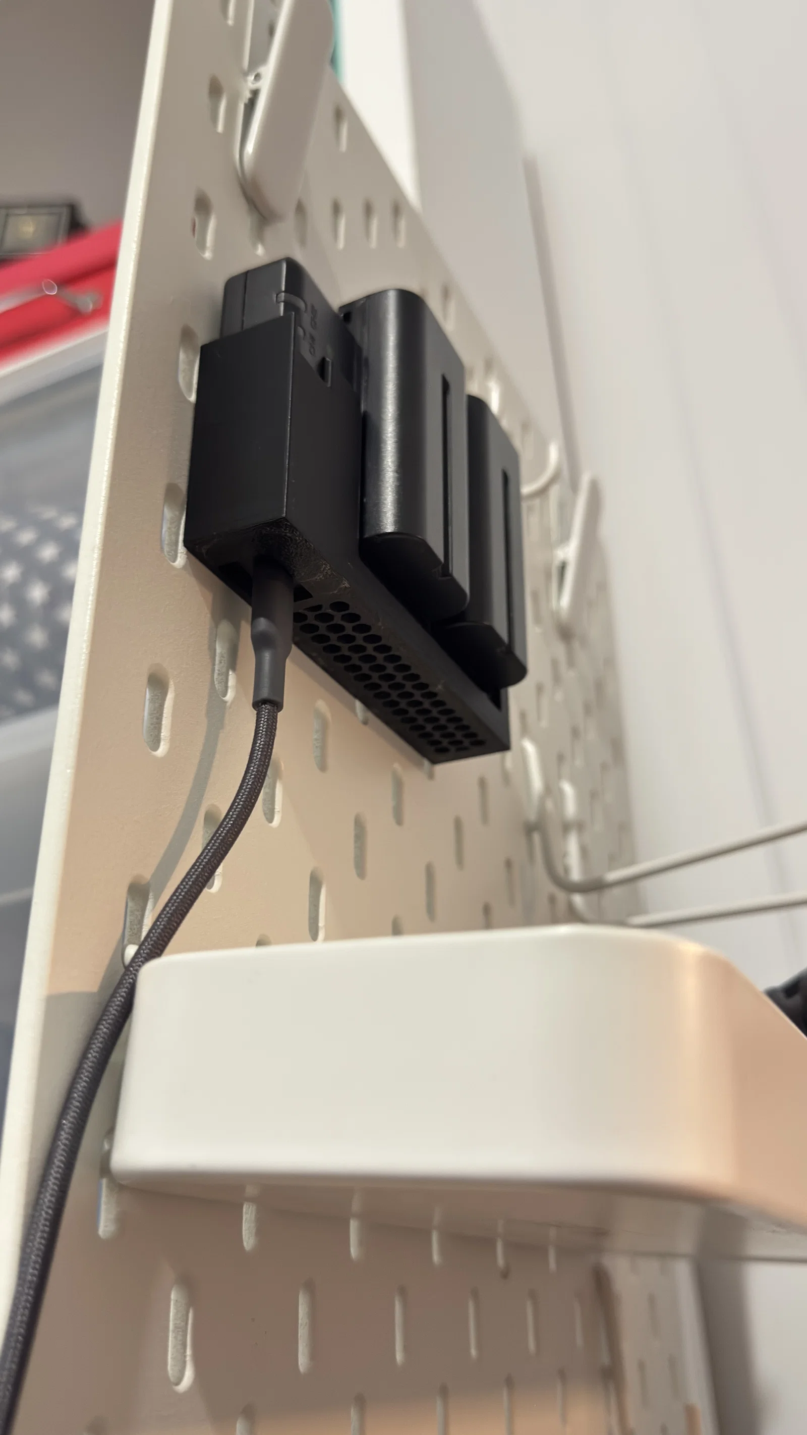 Sản phẩm này sở hữu cơ chế gắn hai điểm tiếp xúc chắc chắn, giúp bộ sạc được giữ cố định một cách an toàn trên bảng SKADIS mà không bị rung lắc hay rơi rớt. Thiết kế tối giản, ôm sát thân sạc, vừa đảm bảo tính thẩm mỹ, vừa tạo điều kiện thuận lợi để bạn cắm sạc pin ngay trên tường một cách nhanh chóng. Đây là giải pháp hoàn hảo để tối ưu hóa góc làm việc của các "creator", giúp bạn dễ dàng theo dõi tình trạng pin cũng như lấy pin sử dụng ngay khi cần.