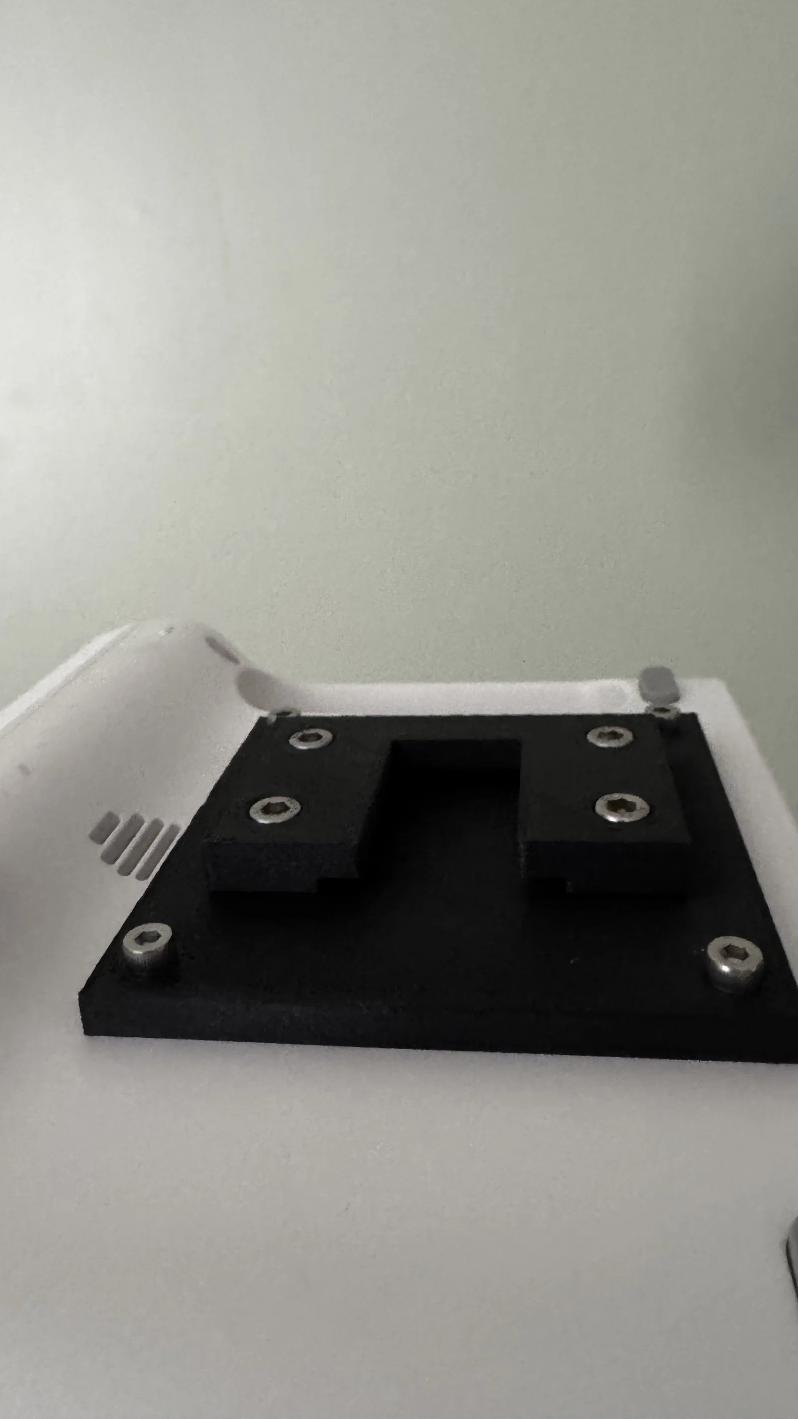 Mô hình thứ hai là phần kết nối trung gian giữa tấm đế và hệ thống mà bạn muốn gắn thiết bị lên. Trong trường hợp của tụi mình, tụi mình có một giá đỡ cột với phần thanh vuông nhô ra. Mô hình này được thiết kế để trượt vừa vào thanh vuông đó và khóa chặt tại chỗ. Bạn dùng ốc và đai ốc M5 để cố định phần kết nối này vào tấm đế. Nếu chọn đúng độ dài ốc, đầu ốc và đai ốc M5 sẽ được âm xuống dưới bề mặt.