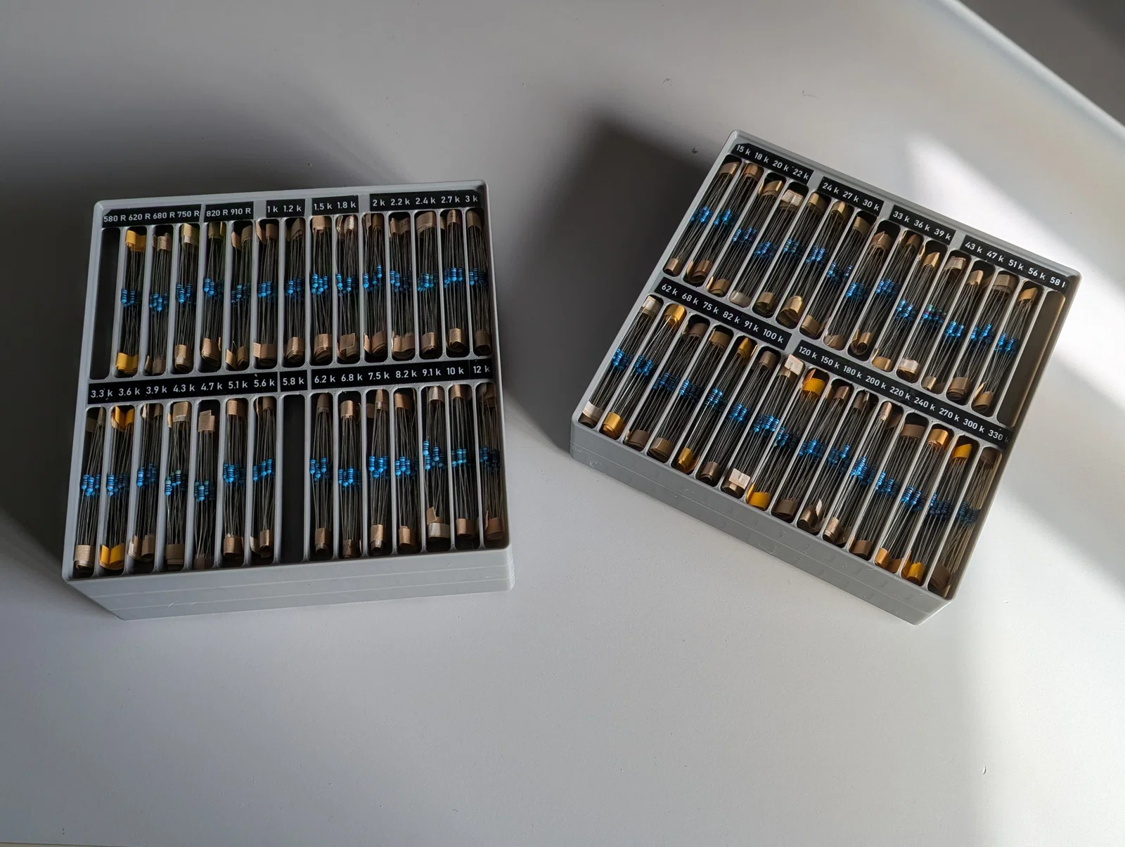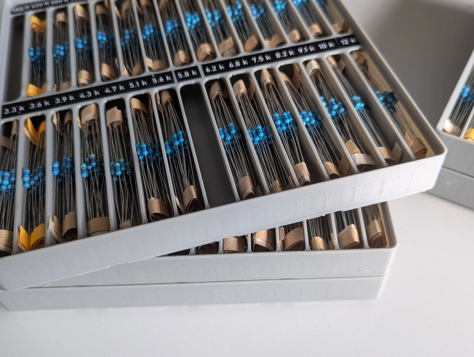 Đây là một mô hình đơn giản để cất giữ các loại điện trở màng kim loại 1/4W thông dụng trong khay Gridfinity kích thước 4x4. Mỗi khay có 30 ngăn chia thành 2 hàng. Có chỗ để dán nhãn; nhãn 9mm sẽ hơi khít ở hàng trên nhưng vẫn vừa. Khu vực dán nhãn ở giữa rộng rãi hơn do không bị vướng vách ngăn. Mỗi khay có chiều cao 3 đơn vị GF, bạn có thể in được khoảng 6 khay từ 1 cuộn nhựa 1kg. Mục tiêu chính là thiết kế dạng có thể xếp chồng lên nhau, vì mình không ưng ý các mẫu lưu trữ điện trở khác hiện có. Mỗi ngăn có thể chứa dễ dàng khoảng 25 điện trở 1/4W loại dây đai (belted), rất lý tưởng cho các bộ kit điện trở. Nếu để rời, mỗi ngăn còn chứa được nhiều hơn nữa, nhưng mình thấy dùng loại dây đai sẽ dễ thao tác hơn. Phần đáy được thiết kế theo kiểu "gridfinity-refined" với các hốc nam châm. Nếu bạn không thích hoặc không cần, bạn có thể dùng Gridfinity Rebase để thay đổi phần đáy. Mình cũng có thêm một cái nắp để đậy chồng khay, nhưng cá nhân mình thấy không nhất thiết phải dùng đến.