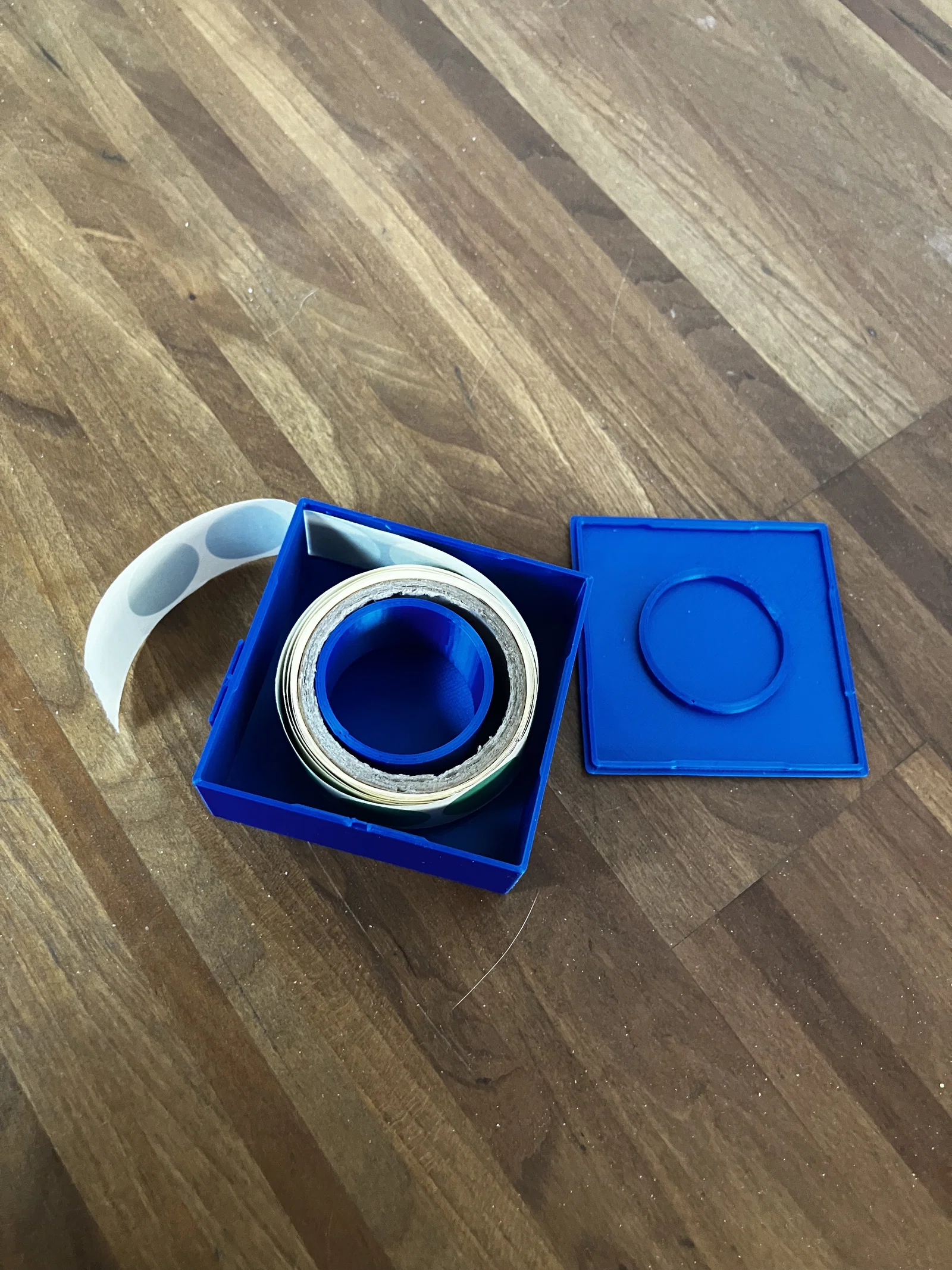 Đây là hộp đựng tiện lợi cho các cuộn chấm dán (adhesive dots) của Neuland. Hộp giấy đi kèm theo sản phẩm gốc của Neuland sau một thời gian sử dụng sẽ bị hỏng và không còn hoạt động tốt nữa – đây chính là giải pháp thay thế hoàn hảo! Bên ngoài được trang bị kẹp giữ, giúp cố định đầu cuộn chấm dán để bảo quản dễ dàng hơn.