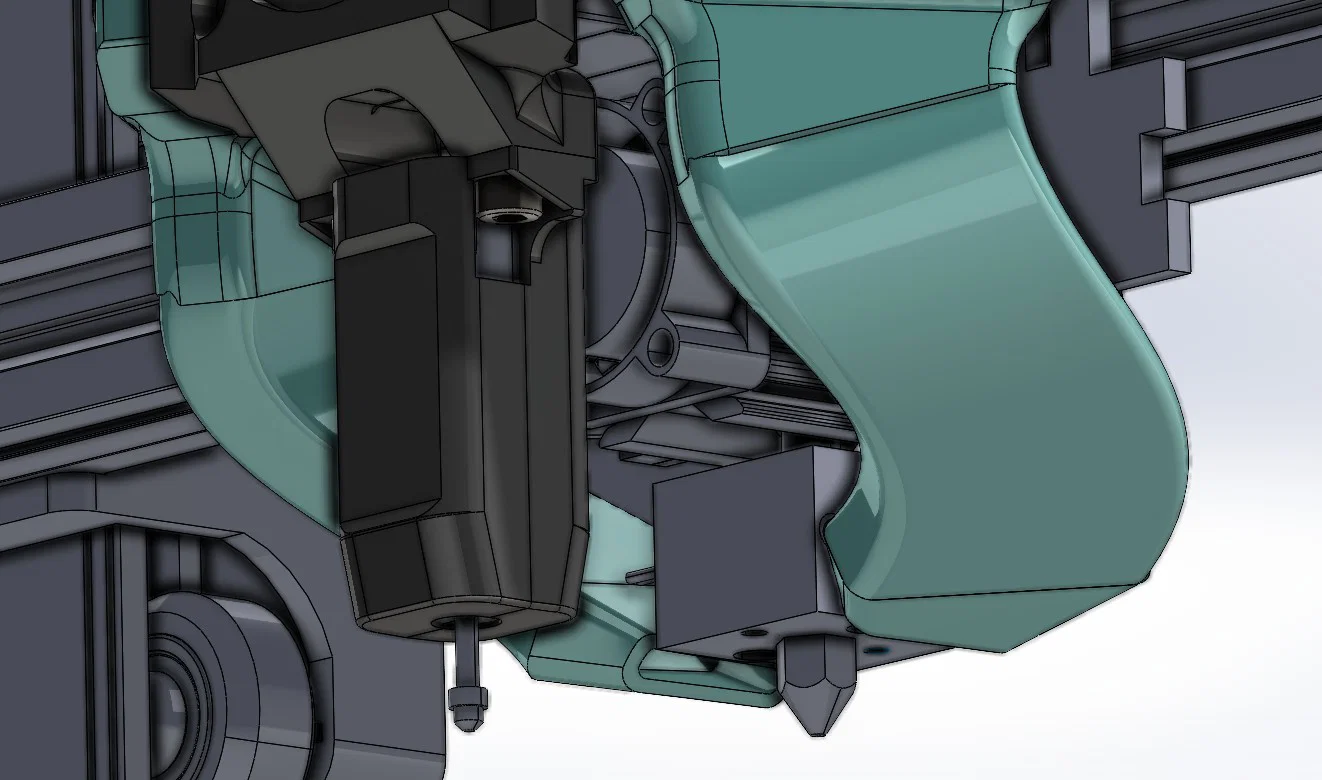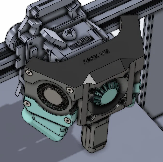 Sử dụng quạt kép 4010. Bản thiết kế này đã có sẵn vị trí để gắn CRTouch. Do phiên bản trước mình không nhìn thấy đầu phun (nozzle) khi đang in, mình đã quyết định nâng quạt lên cao hơn và kéo dài các ống dẫn khí. Còn quạt 4010 trục ở tản nhiệt không mang lại hiệu quả khác biệt nên mình đã quay lại dùng quạt mini nguyên bản và lắp CRTouch ở phía trước nó. Mình hiện đang dùng bản này trên máy. Mình sẽ cập nhật lại tọa độ X-Y cho vị trí CRTouch mới sau.