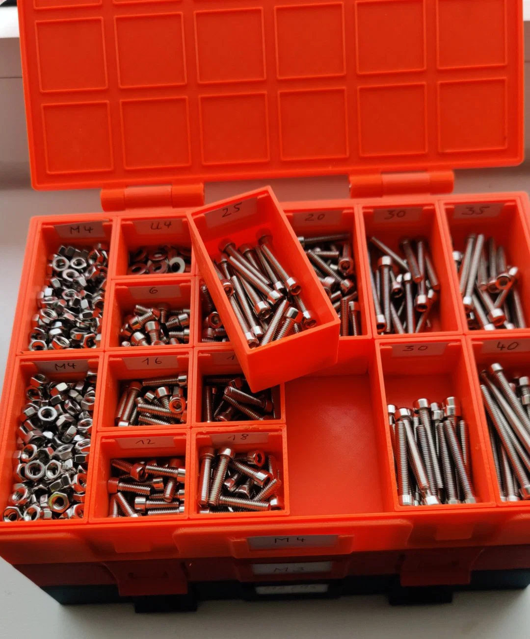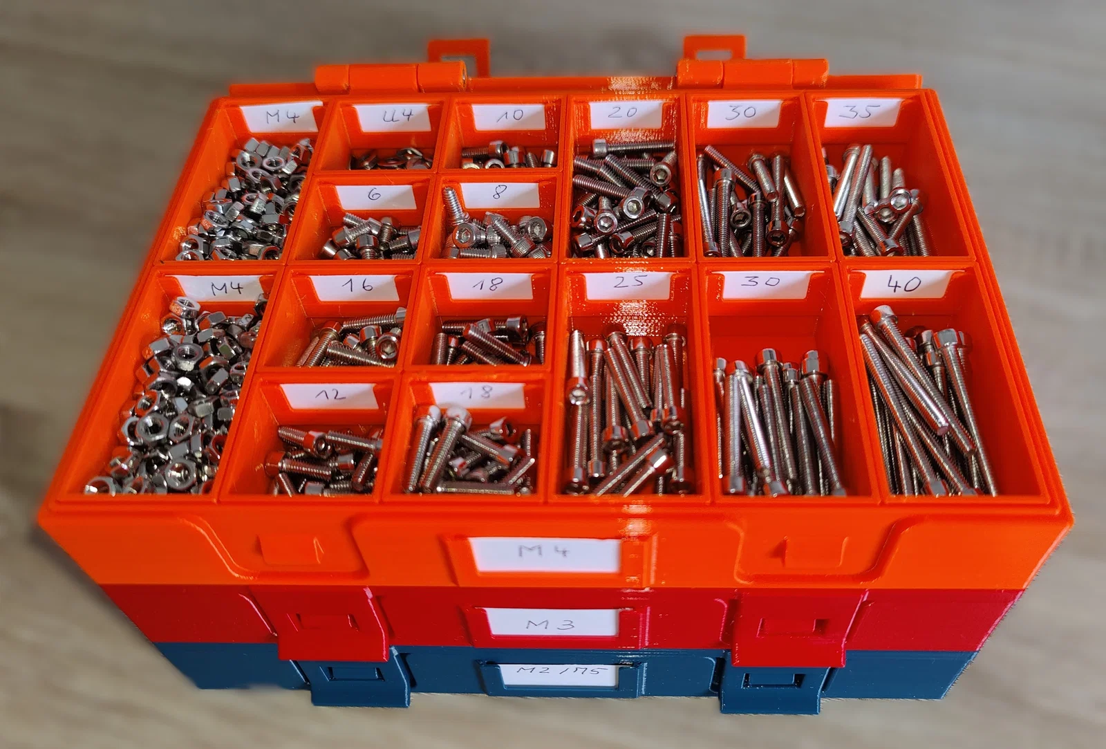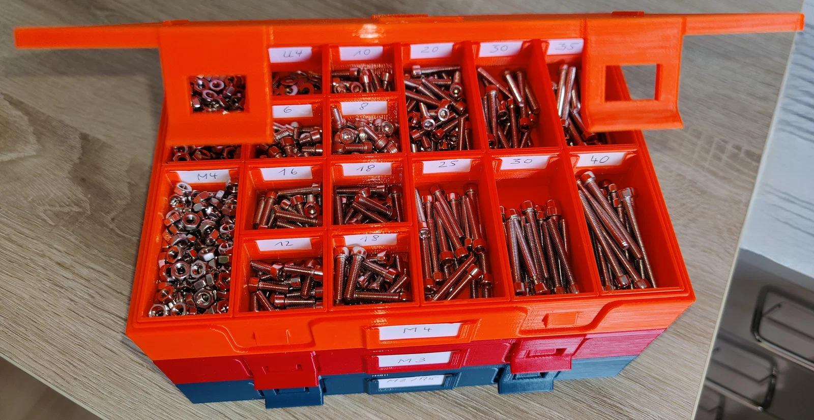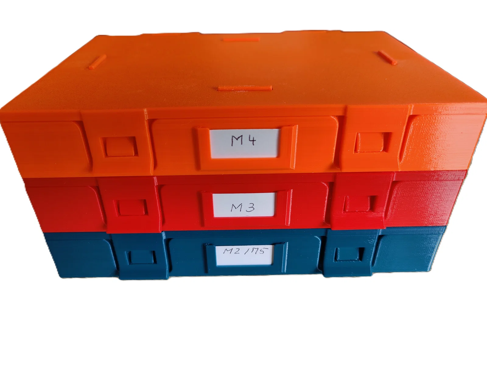 Cả hộp và các ngăn đều có khe để gắn nhãn giấy ghi chú. Kích thước giấy cho hộp là 37x19 mm, và cho các ngăn là 27x13 mm. Nếu muốn, bạn có thể dán bốn miếng in từ file "Stapel.STL" vào nắp hộp để chồng các hộp lên nhau gọn gàng. Lưu ý quan trọng: File "Stapel.STL" có độ rộng 2,7 mm và cao 2,2 mm, bạn hãy chú ý căn chỉnh hướng chính xác khi dán.