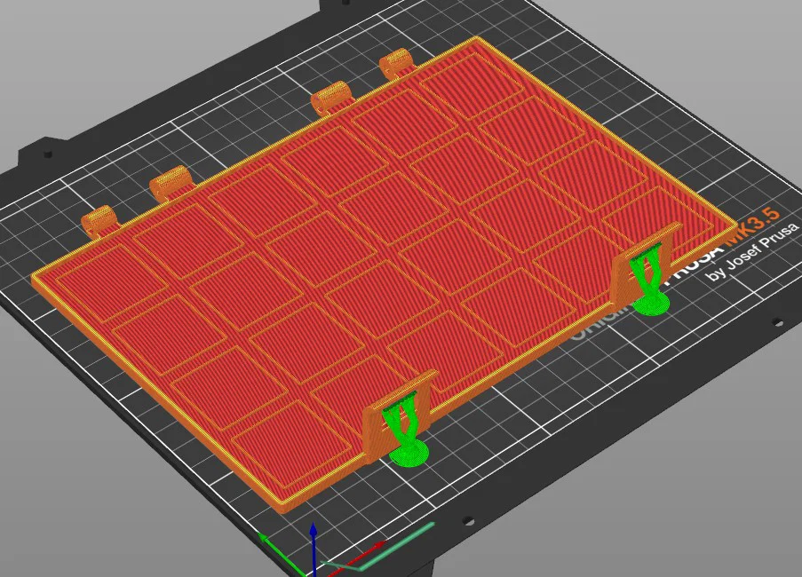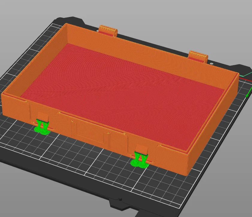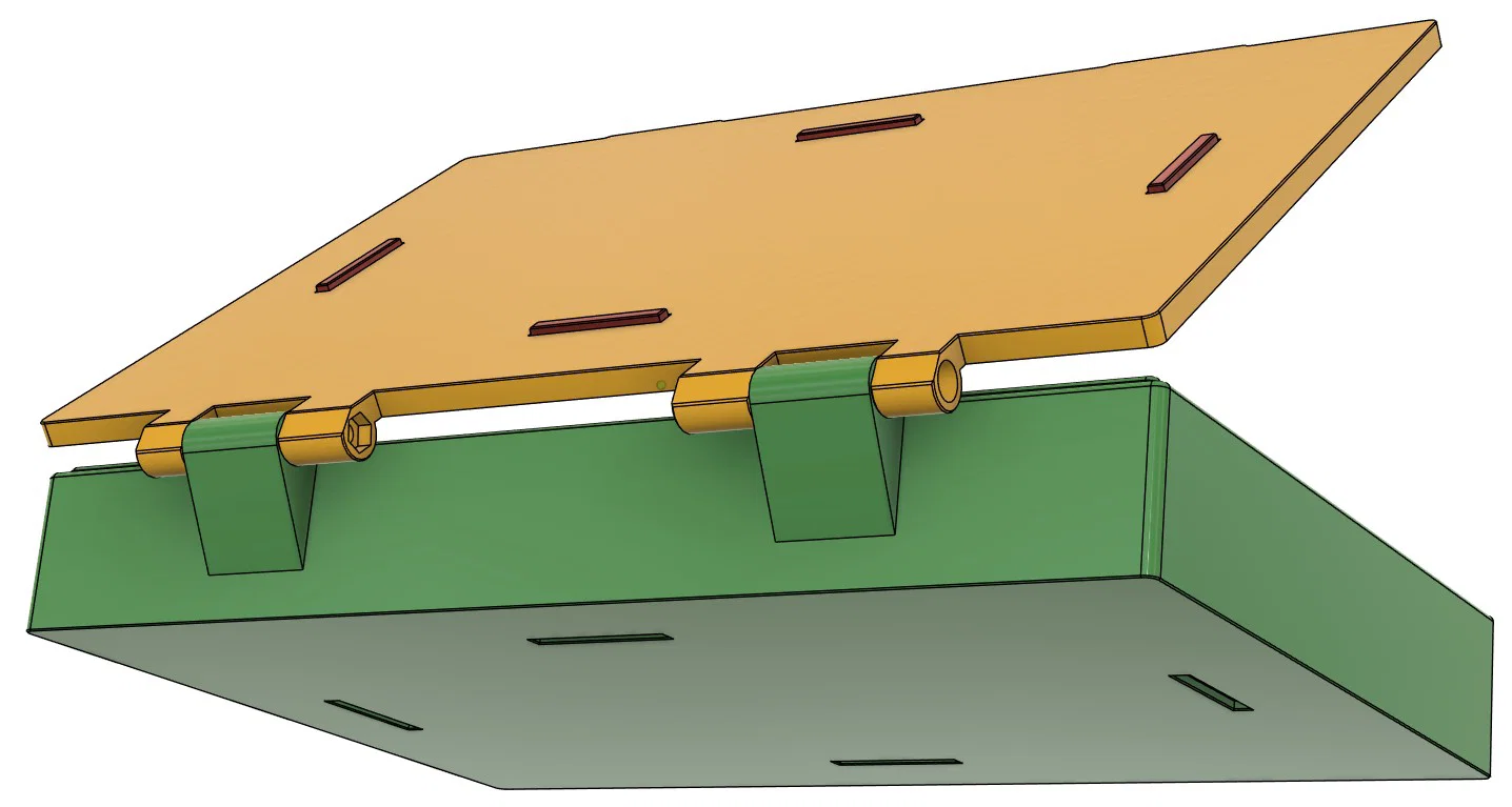 Để làm trục bản lề, bạn cần dùng hai ốc vít đầu trụ M3 x 40 và hai đai ốc M3. Các file "Deckel.STL" (nắp) và "Unterteil.STL" (đáy) cần được in với chế độ hỗ trợ (support) như hướng dẫn trong hình chụp. Để đảm bảo độ bền, mình khuyên các bạn nên dùng nhựa PETG, chỉnh Infill 15% và tối thiểu hai lớp Perimeter.