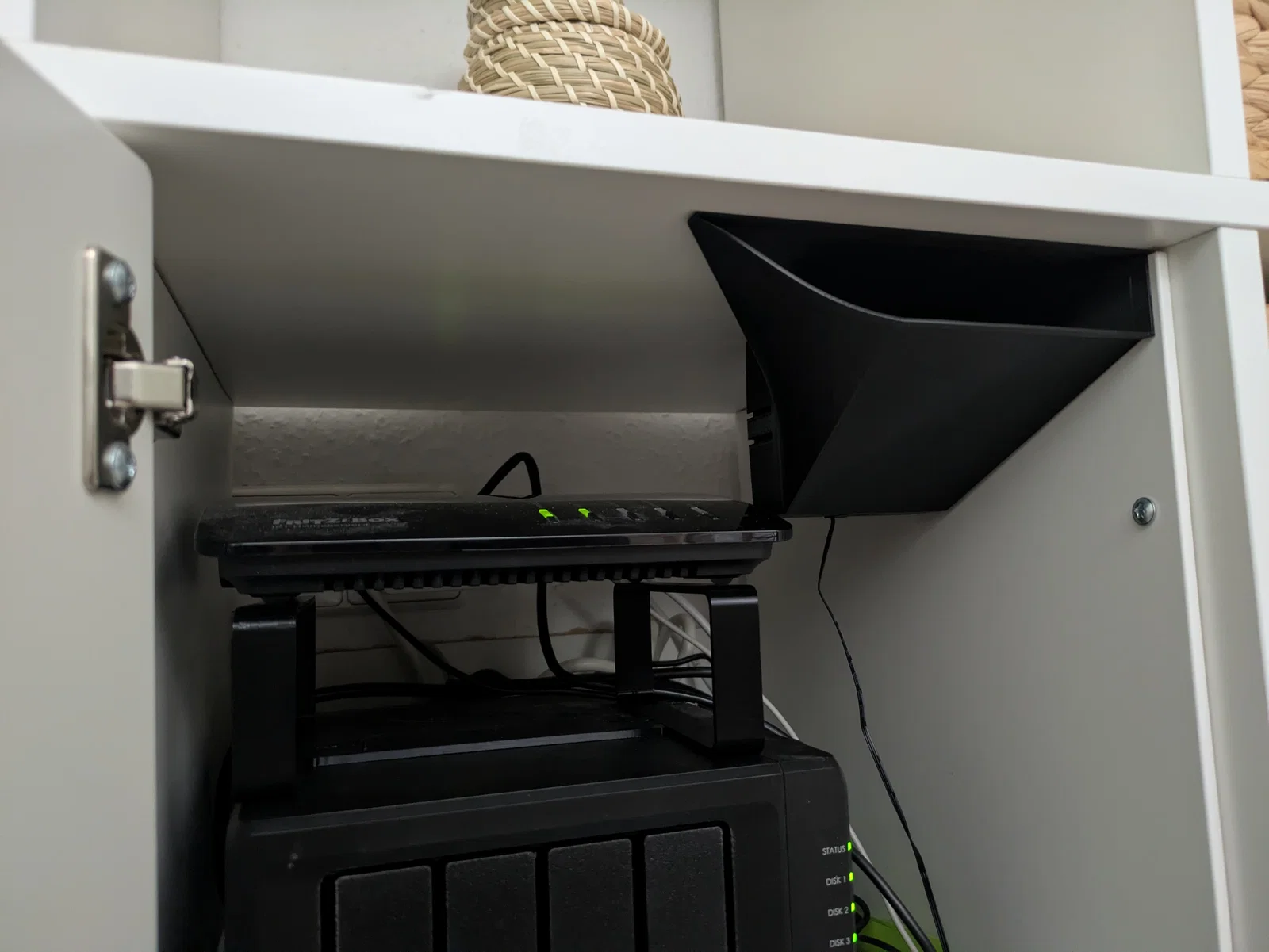 Ống dẫn nhiệt gắn vào cửa kệ IKEA Kallax giúp tản nhiệt cho Synology NAS và Fritz Box bên trong. Thiết kế này dùng cho quạt 80mm, giúp giảm khoảng 5°C nhiệt độ, cực kỳ hữu ích cho việc làm mát các thiết bị điện tử đặt trong tủ kín.