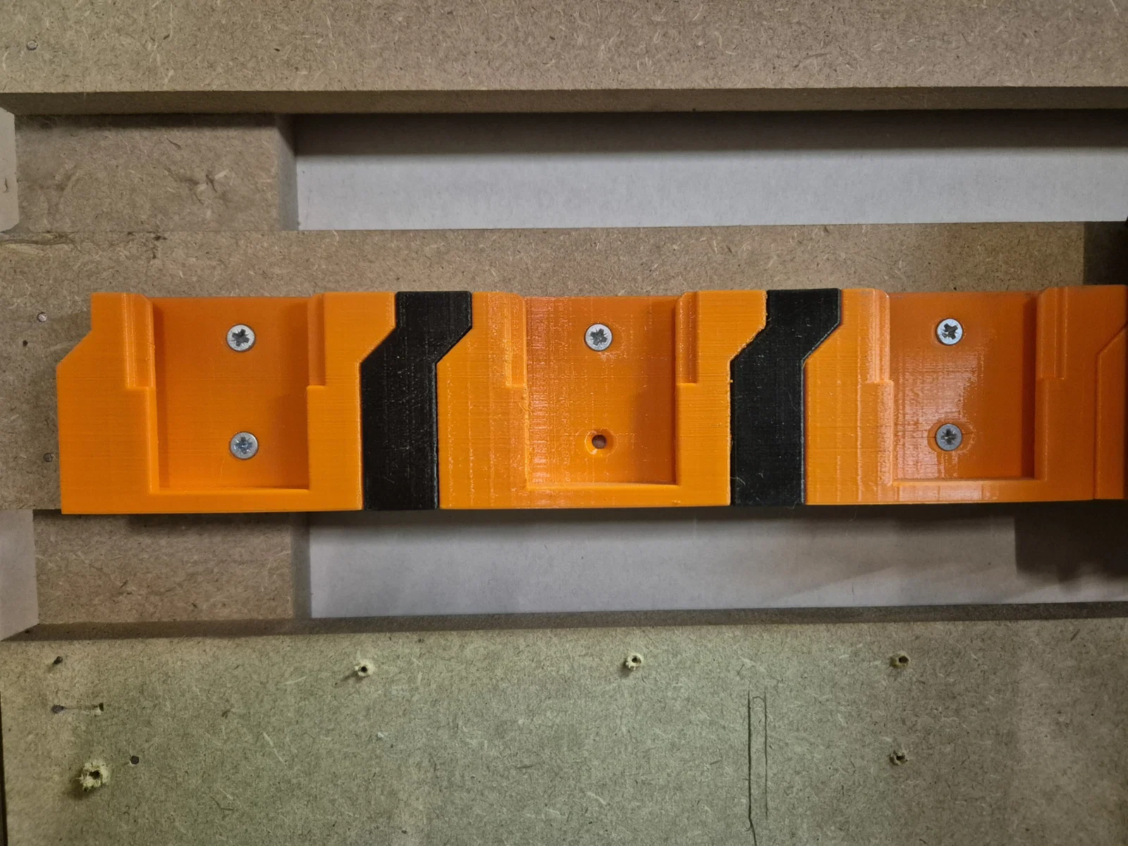 Vì vậy mình đã thiết kế ra mẫu này để các cục pin luôn giữ khoảng cách đều nhau và gắn lên tường rất dễ dàng. Nếu bạn bắt cái giá đỡ đầu tiên nằm ngang thì mấy cái còn lại cũng sẽ y hệt như vậy. Mình có thêm các miếng đệm (spacer) nếu bạn muốn gắn thêm giá treo máy khoan hoặc máy mài. Nhờ vậy mà giữa các dụng cụ sẽ có đủ không gian để bạn lấy ra hoặc cất vào một cách thuận tiện. Mọi người xem hình minh họa nhé.