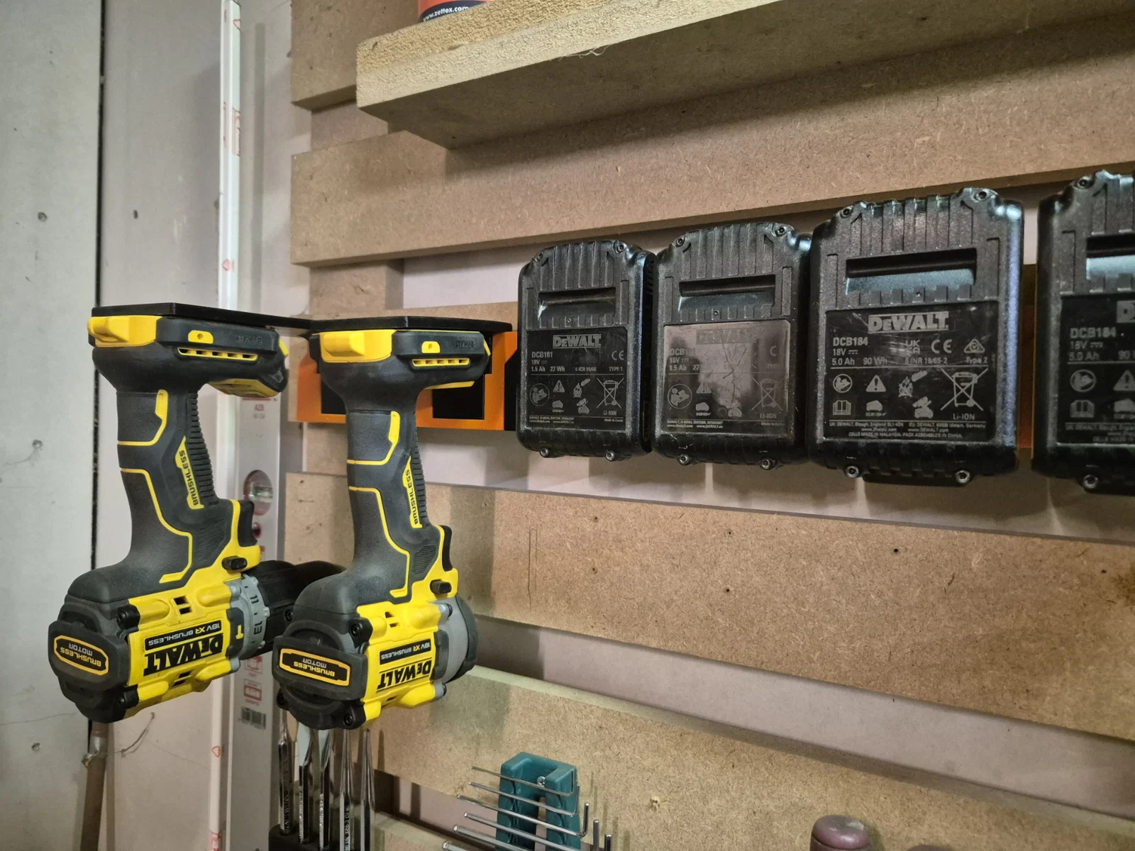 Mình muốn sắp xếp mấy cục pin Dewalt một cách gọn gàng mà không cần phải đo đạc khoảng cách thủ công cho từng cái.
