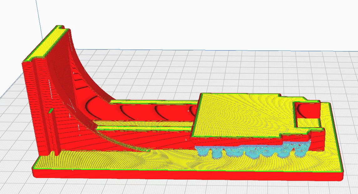Giá đỡ pin và miếng đệm không cần hỗ trợ (support) khi in đứng, nhưng riêng phần ngàm treo thì cần có support như hình. Hãy in theo hướng đặt mặt phẳng lớn xuống dưới.