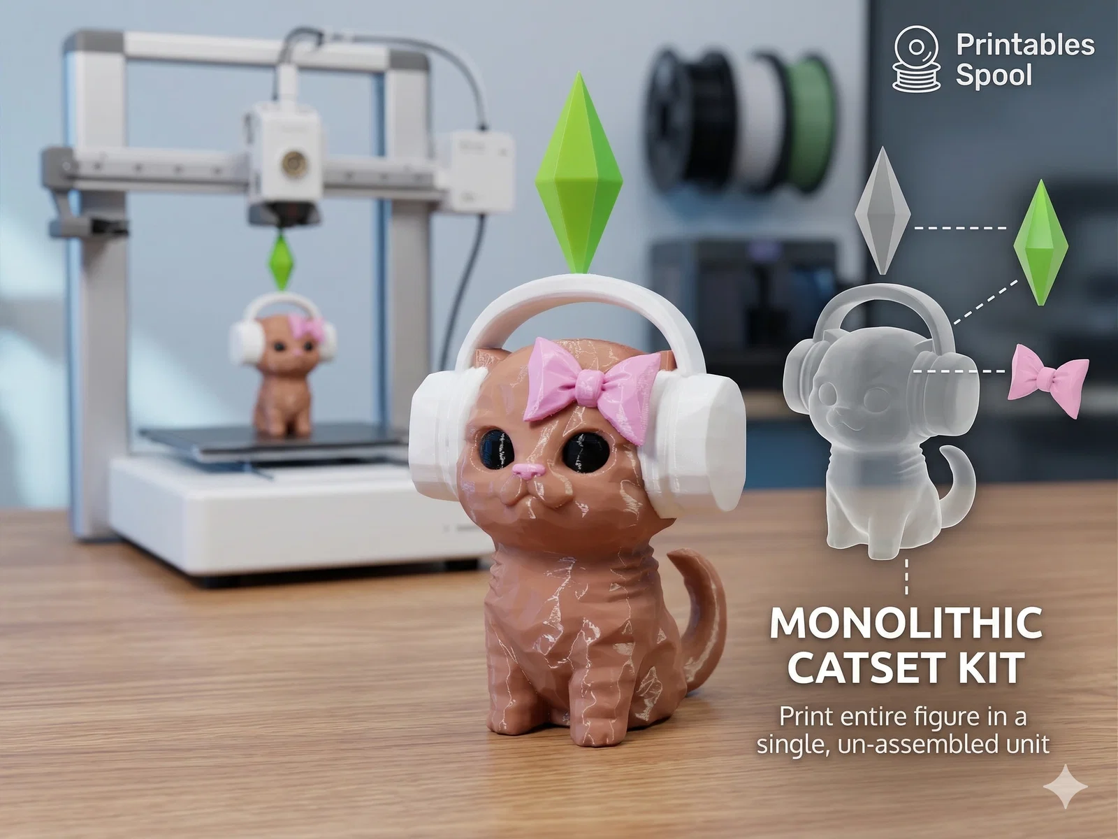 Mang chút hoài niệm của tựa game The Sims cùng vẻ đáng yêu của chú mèo lên bàn làm việc của bạn. Mô hình nguyên khối này tích hợp đầy đủ từ tai nghe đến viên đá Plumbob, không cần lắp ráp, vô cùng dễ in và hoàn hảo để trang trí góc máy của fan The Sims.
