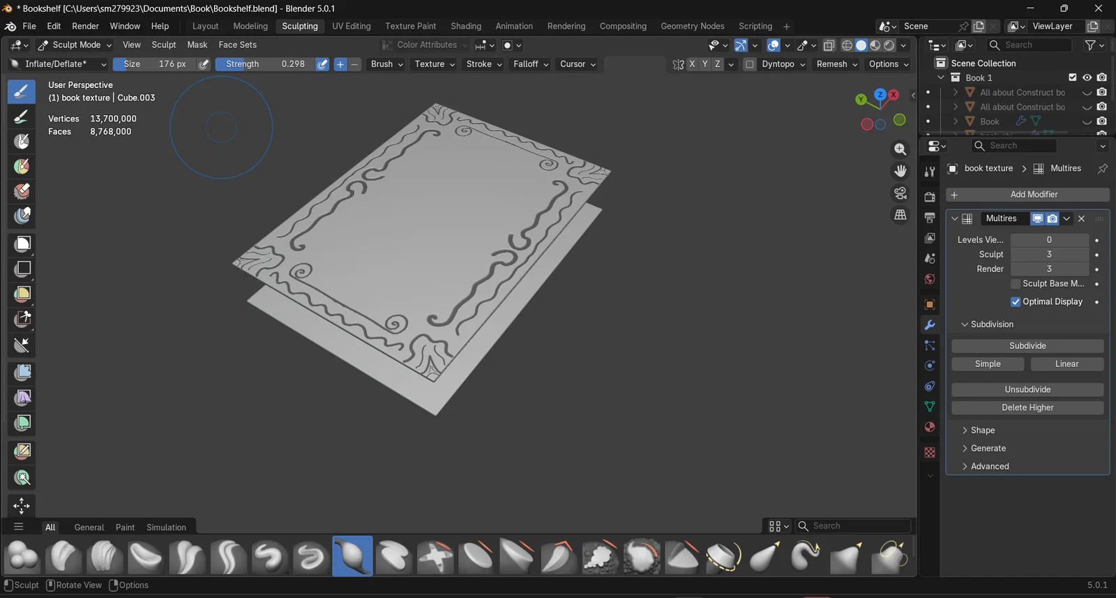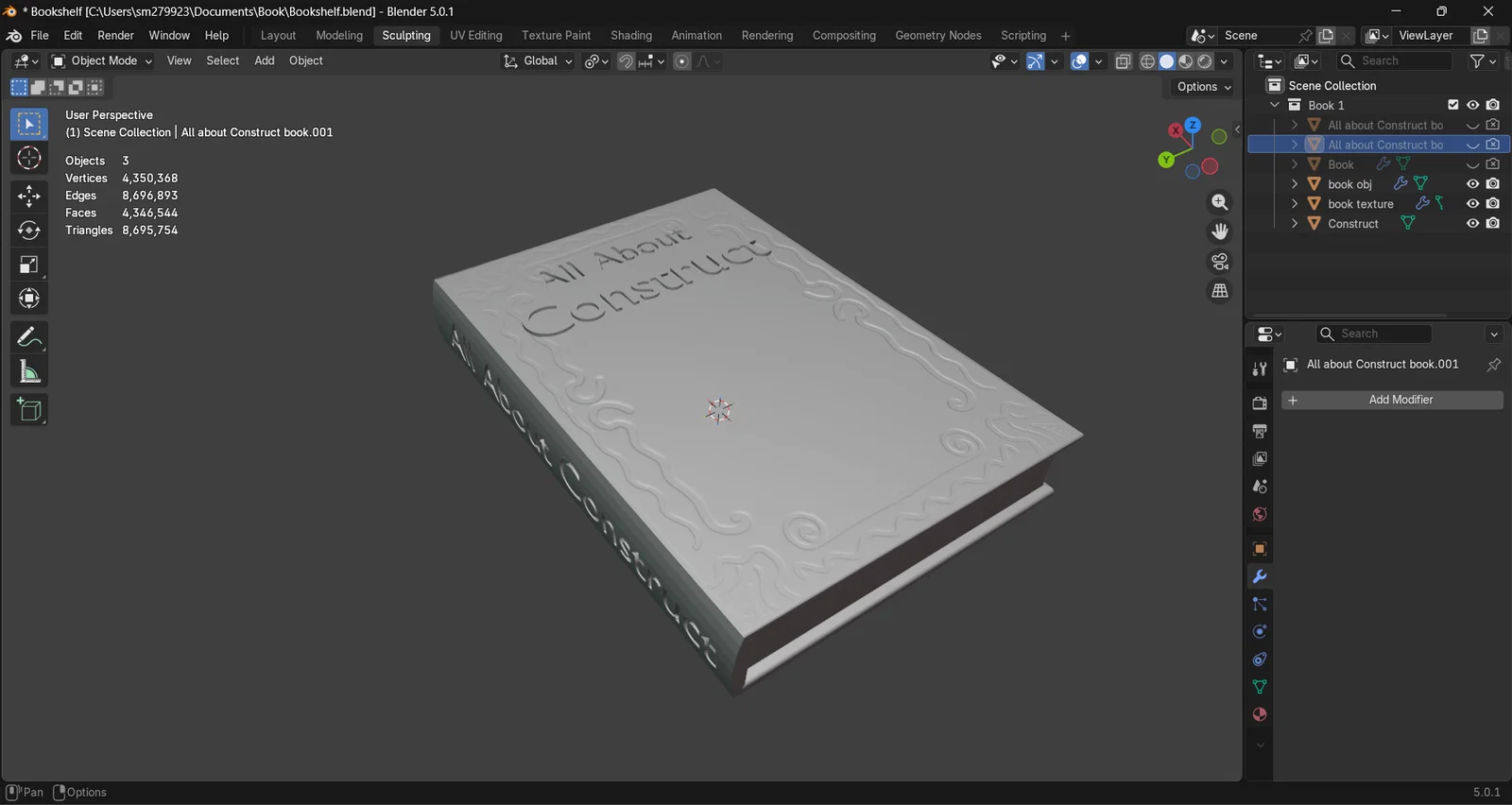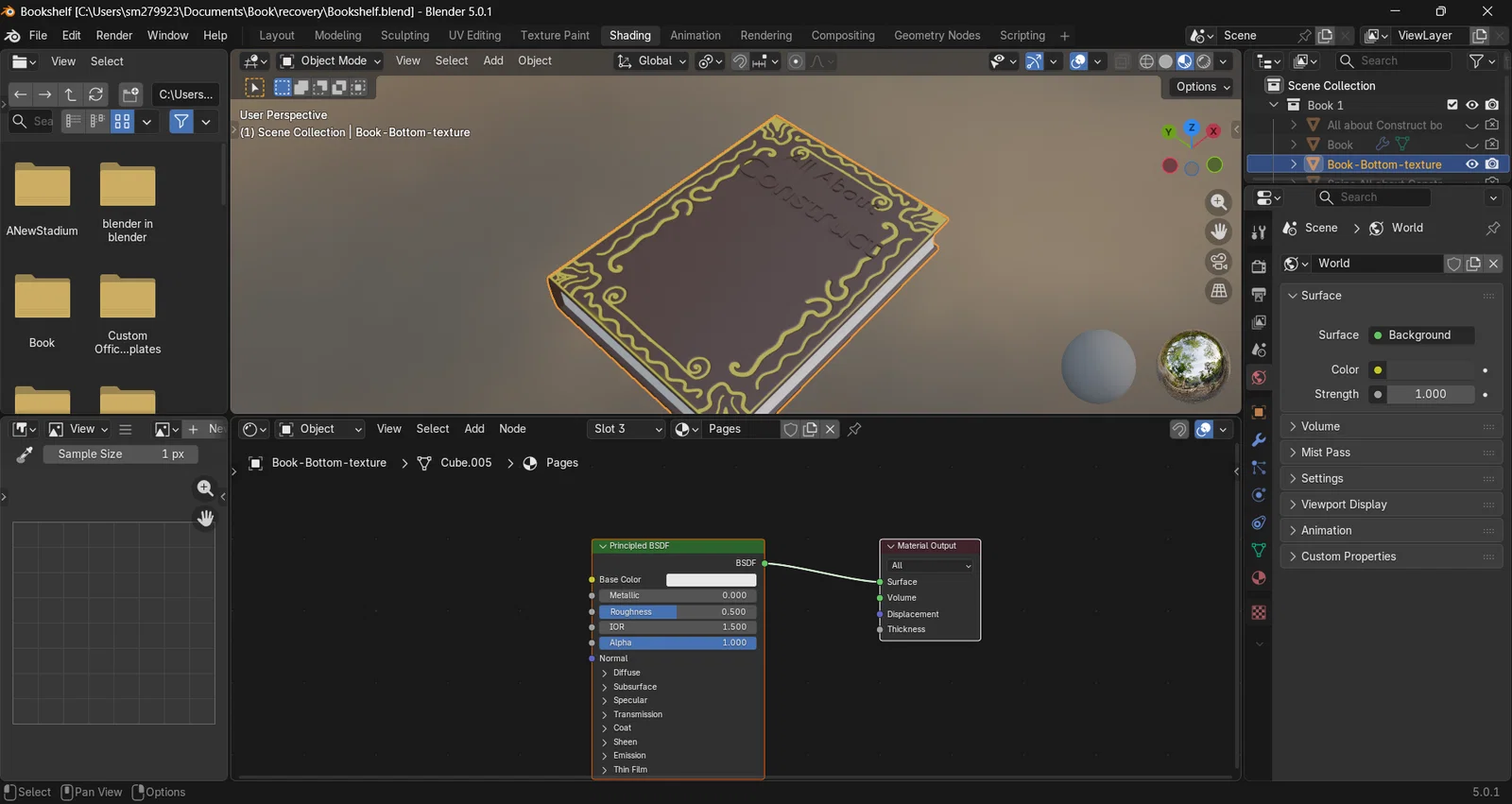 Mình đang làm một cuốn sách trong Blender. Việc tạo ra một cuốn sách bằng Blender sẽ giúp mình rèn luyện kỹ năng dựng hình 3D nhờ vào phần xử lý kết cấu (textures). Mình dự định sẽ học thêm về kỹ thuật masking, nhìn thì có vẻ đơn giản nhưng cái khó là phải vẽ trên trackpad.