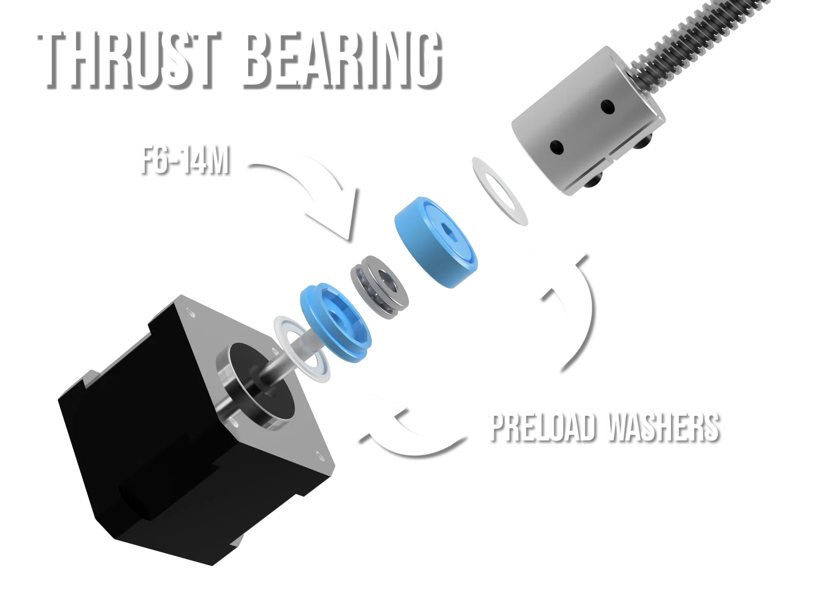 Bạn hỏi mẫu này giải quyết vấn đề gì à? Trục và bạc đạn của động cơ bước (stepper motor) không được thiết kế để chịu tải dọc trục (axial load) mà chỉ chịu tải hướng tâm (radial load). Việc để chúng gánh toàn bộ trọng lượng của khung máy không phải là sở trường, nó sẽ làm bạc đạn nhanh mòn, tạo ra độ rơ và nếu loại nào có lò xo chịu tải trước (preload spring) thì sẽ dẫn đến việc di chuyển trục Z thiếu chính xác do bị quá tải liên tục. Cách giải quyết? Hãy lắp thêm bạc đạn chặn (thrust bearing), chúng được thiết kế để chịu được lực dọc trục. Lúc này tải trọng sẽ đi qua khớp nối, xuống thẳng mặt tấm đệm động cơ, kết hợp với các miếng đệm TPU mỏng để tạo lực preload lên bạc đạn, đảm bảo chúng luôn hoạt động ổn định và hỗ trợ chịu toàn bộ trọng lượng. Lưu ý, miếng đệm preload này khác với lò xo preload trên trục động cơ nhé, lò xo đó chỉ giữ rotor tại chỗ chứ không phải để gánh tải nặng. 🤩 Bạn thích thiết kế này chứ? Bạn có thể góp phần ủng hộ các sáng kiến như thế này đấy! Cân nhắc hỗ trợ mình tại đây! Mình rất trân trọng sự ủng hộ của các bạn, và bạn sẽ nhận được quyền truy cập độc quyền vào nhiều file CAD khác nhau! Gửi yêu cầu tính năng tại đây! Tính năng: - Sử dụng TPU để preload giúp vận hành 24/7 (tùy chọn) - Có phần gờ hướng xuống giúp tránh bụi - Tự động căn chỉnh theo trục Thông số in khuyến nghị: - Đường kính đầu phun: 0.4mm - Chiều cao lớp in: 0.2mm - Độ đặc (Infill): 100% - Hướng in: giữ nguyên như file gốc - Hỗ trợ (Supports): không cần Vật liệu khuyên dùng: - PETG - ABS/ASA - Bất kỳ vật liệu chịu nhiệt nào vì động cơ khi chạy sẽ khá nóng! Yêu cầu khi lắp đặt: Mua tại đây - Bạc đạn chặn F6-14M/F10-18M - Hãy bôi thật nhiều mỡ lithium vào bạc đạn! (loại NLGI2-3, không chứa chất rắn) - Hãy nhớ "preload" bạc đạn bằng cách ấn chặt khớp nối xuống trong khi siết ốc! Nhật ký cập nhật: Phát hành chính thức. v5 (02/08/2024): Bản phát hành chính thức đầu tiên. v6 (28/08/2024): Thêm hỗ trợ cho bạc đạn F10-18M. Ưu điểm: Có gioăng chắn mỡ, không còn lo rò rỉ mỡ nữa.