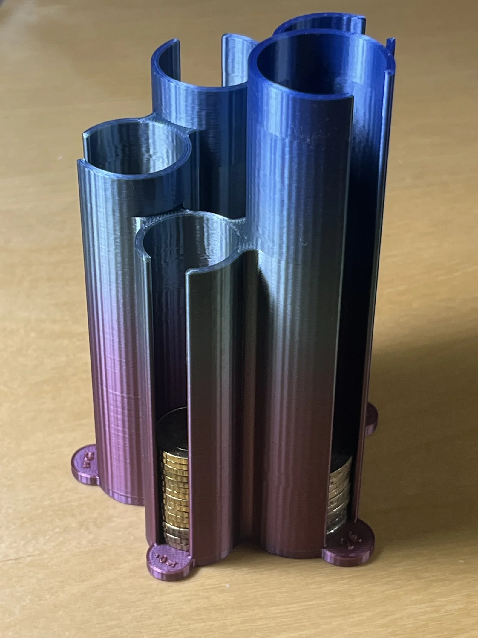 Điểm đặc biệt của mô hình này nằm ở tính ứng dụng cao và sự tinh tế trong thiết kế. Tác giả đã khéo léo tích hợp thêm một thiết bị nâng xu nhỏ bên trong, giúp bạn lấy từng đồng xu ra một cách dễ dàng mà không cần phải dốc ngược toàn bộ tháp. Dù bạn sử dụng loại tiền xu nào, sản phẩm này vẫn đảm bảo khả năng giữ tiền vững chãi, phân loại rõ ràng từng mệnh giá vào các ống riêng biệt. Đây là một món đồ in 3D không chỉ hữu dụng mà còn cực kỳ thú vị để trưng bày.