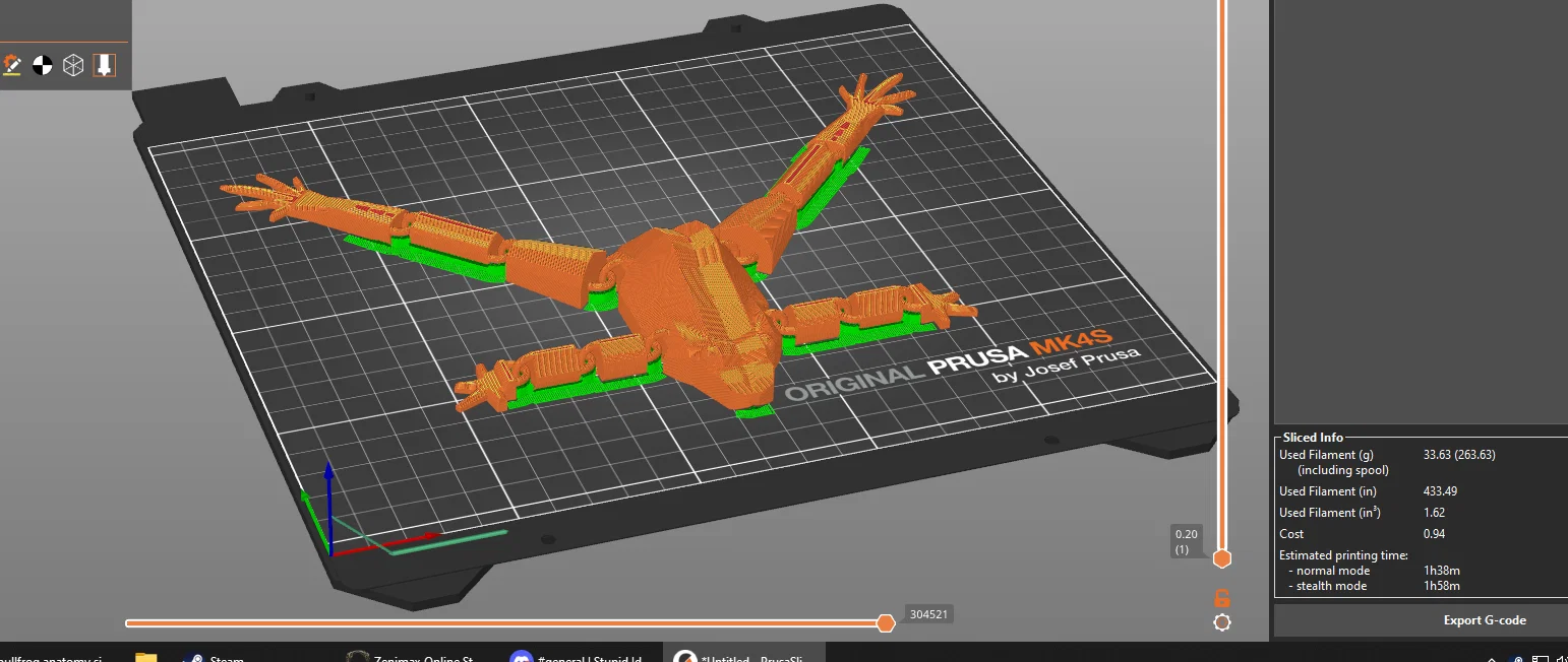 Hãy xem trước (preview) bản cắt lớp để đảm bảo vật liệu support đủ dễ để gỡ bỏ. Con ếch của mình chỉ mất khoảng 1 phút để cắt bỏ hết support trong các vòng khớp.