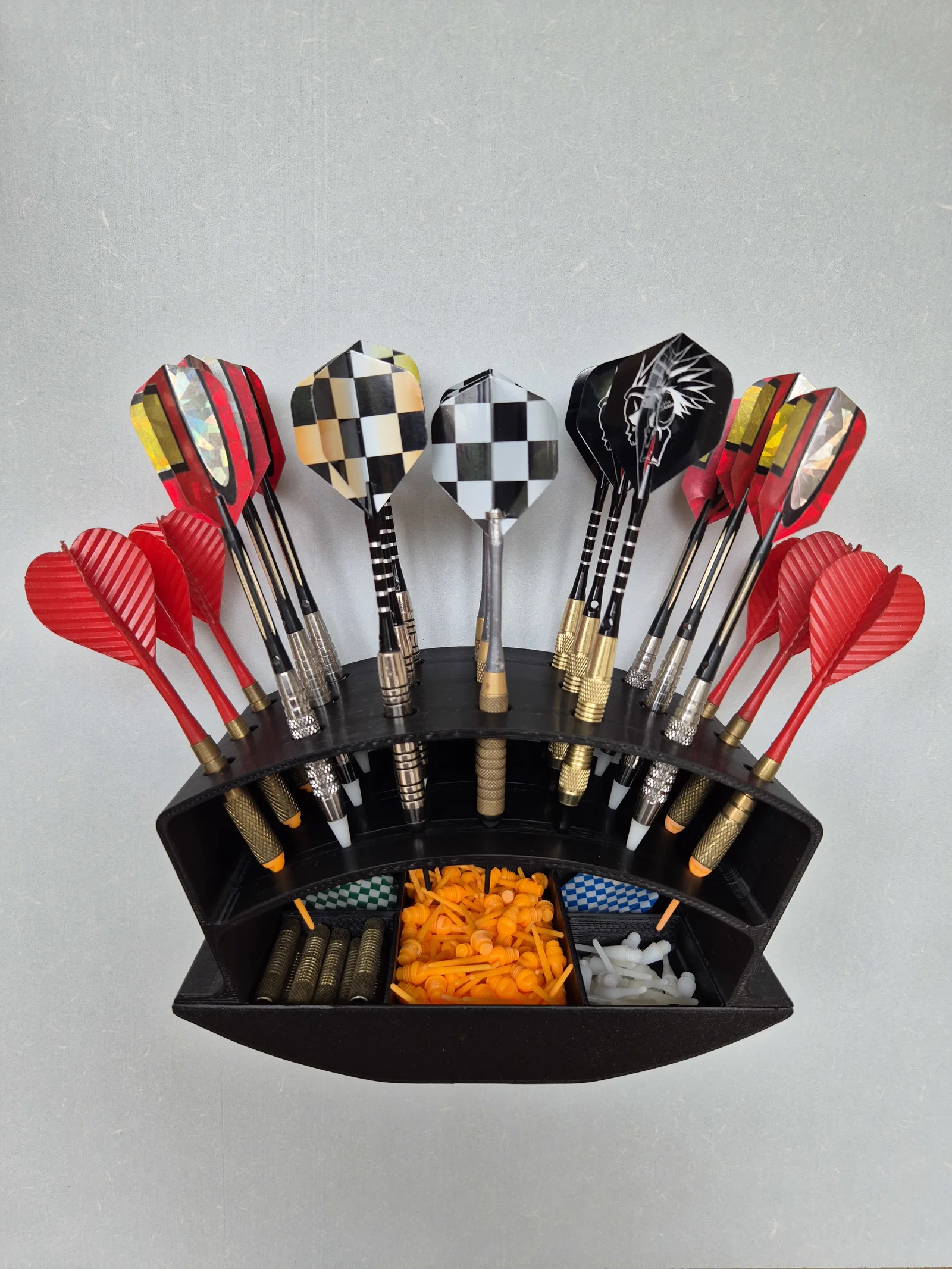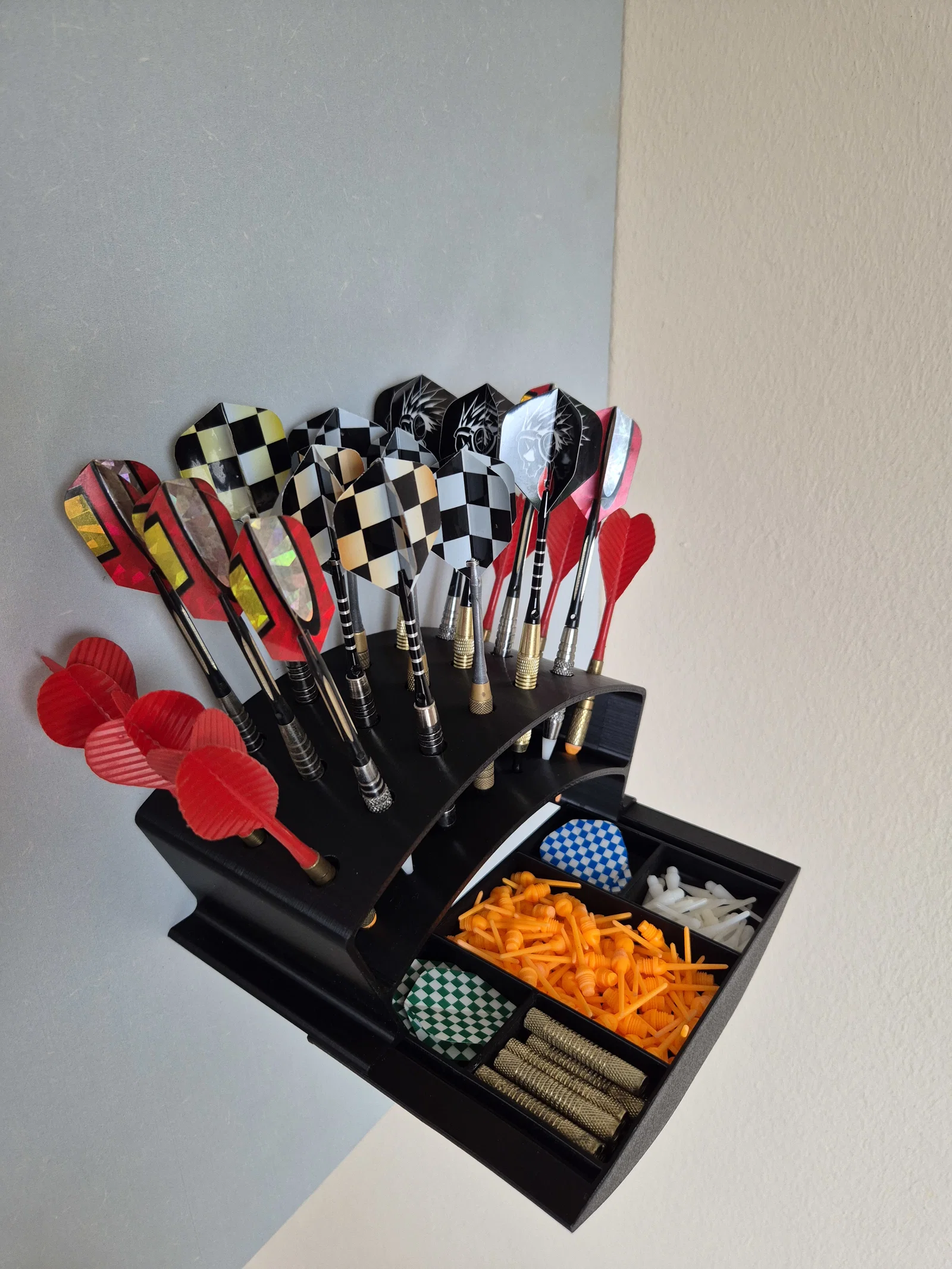 Trong ngăn kéo, bạn có thể cất giữ các phụ kiện thay thế như đầu mũi, thân phi tiêu (shafts) và cánh phi tiêu (flights). Nhờ vậy mà mọi thứ được gom gọn lại một chỗ, rất tiện lợi khi cần dùng ngay.