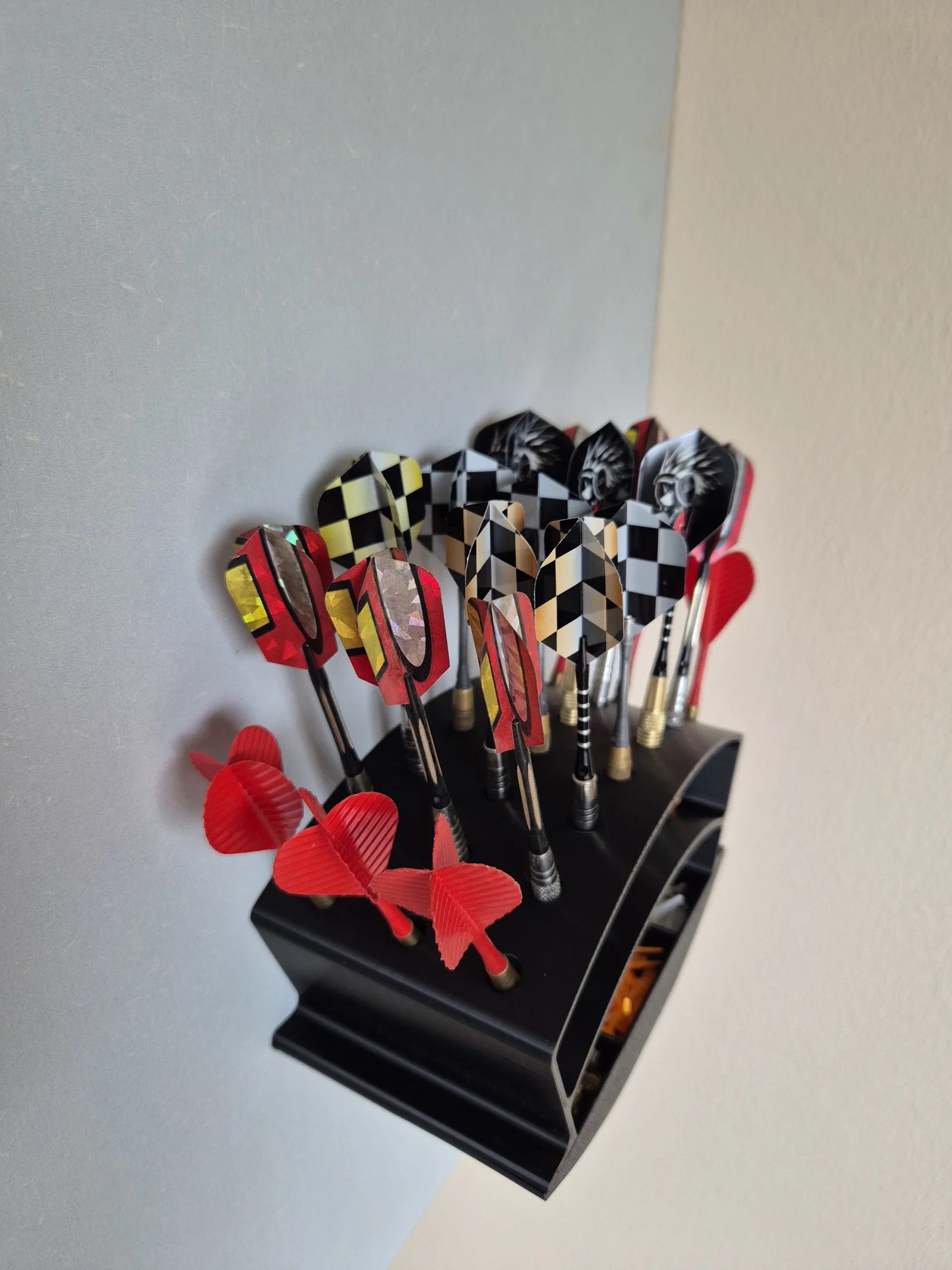 Giá treo phi tiêu thiết kế để gắn tường, có sức chứa 21 mũi phi tiêu cùng một ngăn kéo tiện dụng bên dưới để cất giữ phụ kiện như đầu mũi, shaft và flight. Sản phẩm có kích thước 175x100x106mm, rất gọn gàng và ngăn nắp cho góc chơi của bạn.