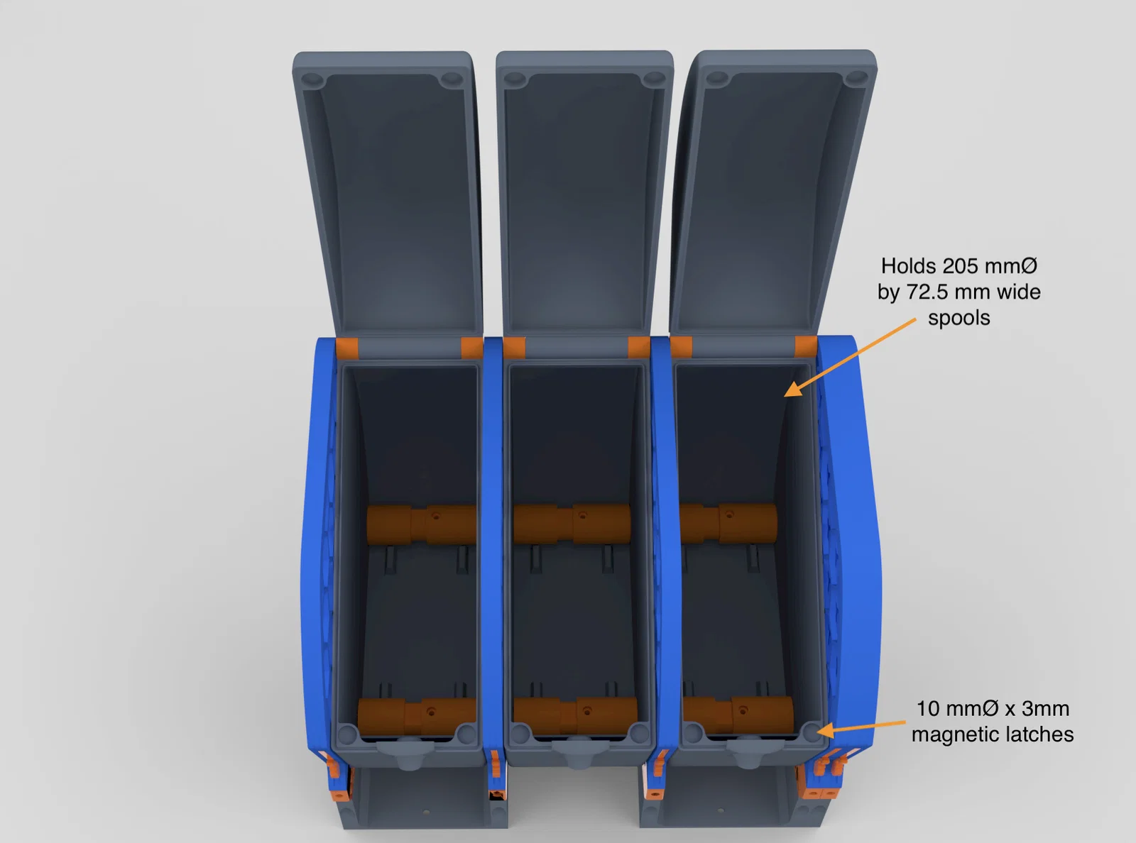 Các hộp dry box có thể được làm kín bằng sợi nhựa TPU 1.75mm. Mỗi hộp chứa vừa vặn cuộn nhựa kích thước 205 x 72.5mm.