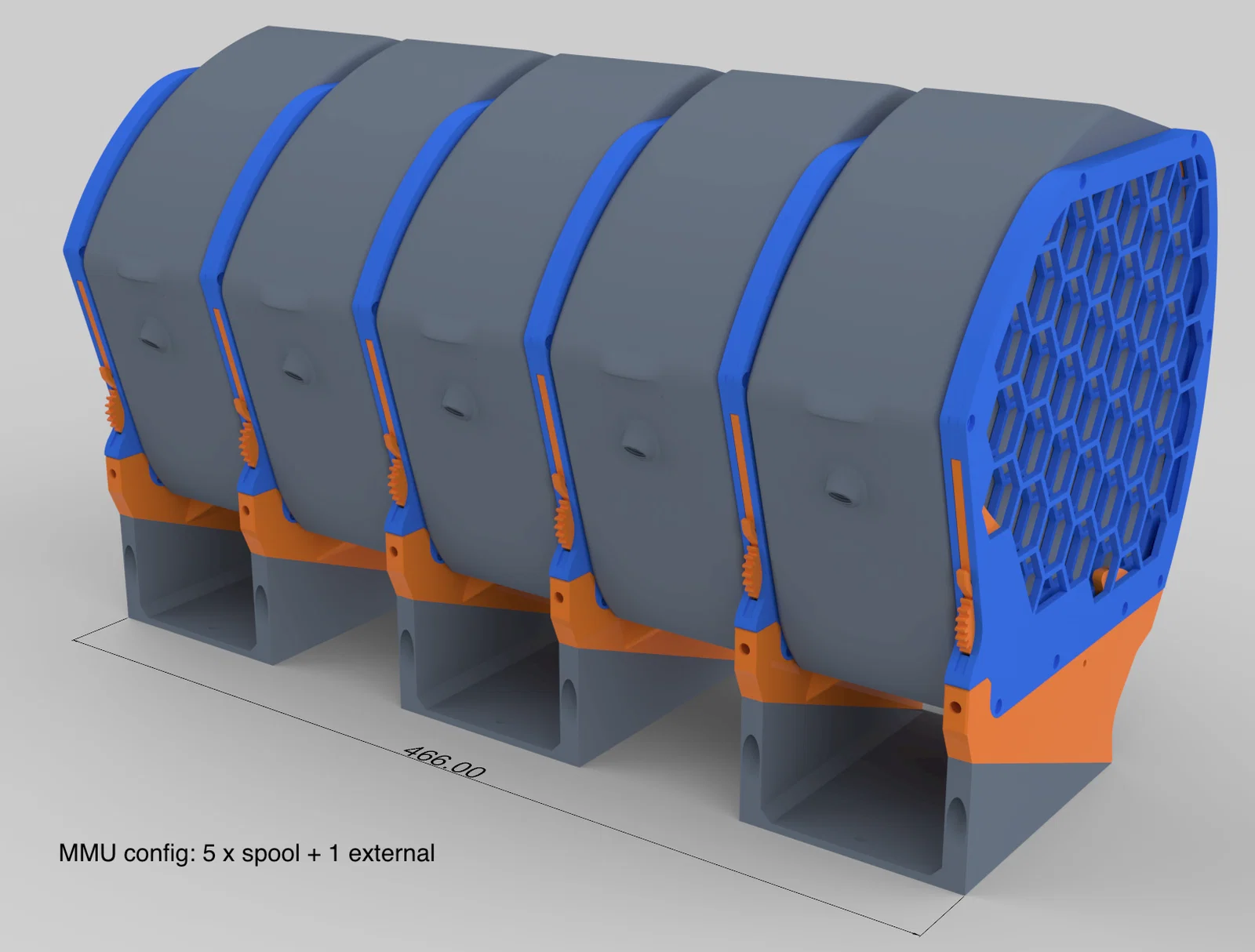 The Shark được thiết kế để tiết kiệm diện tích tối đa, nhờ đó bạn có thể xếp chồng nó ngay trên máy in. Với cấu hình 5x1 cho 5 cuộn MMU, bề ngang cũng chỉ vỏn vẹn 456mm. Mình thường dùng cấu hình 3 x 2, trong đó đường vào 1 và 2 lấy từ máy sấy sợi nhựa, còn 3, 4 và 5 dùng từ các hộp dry box.