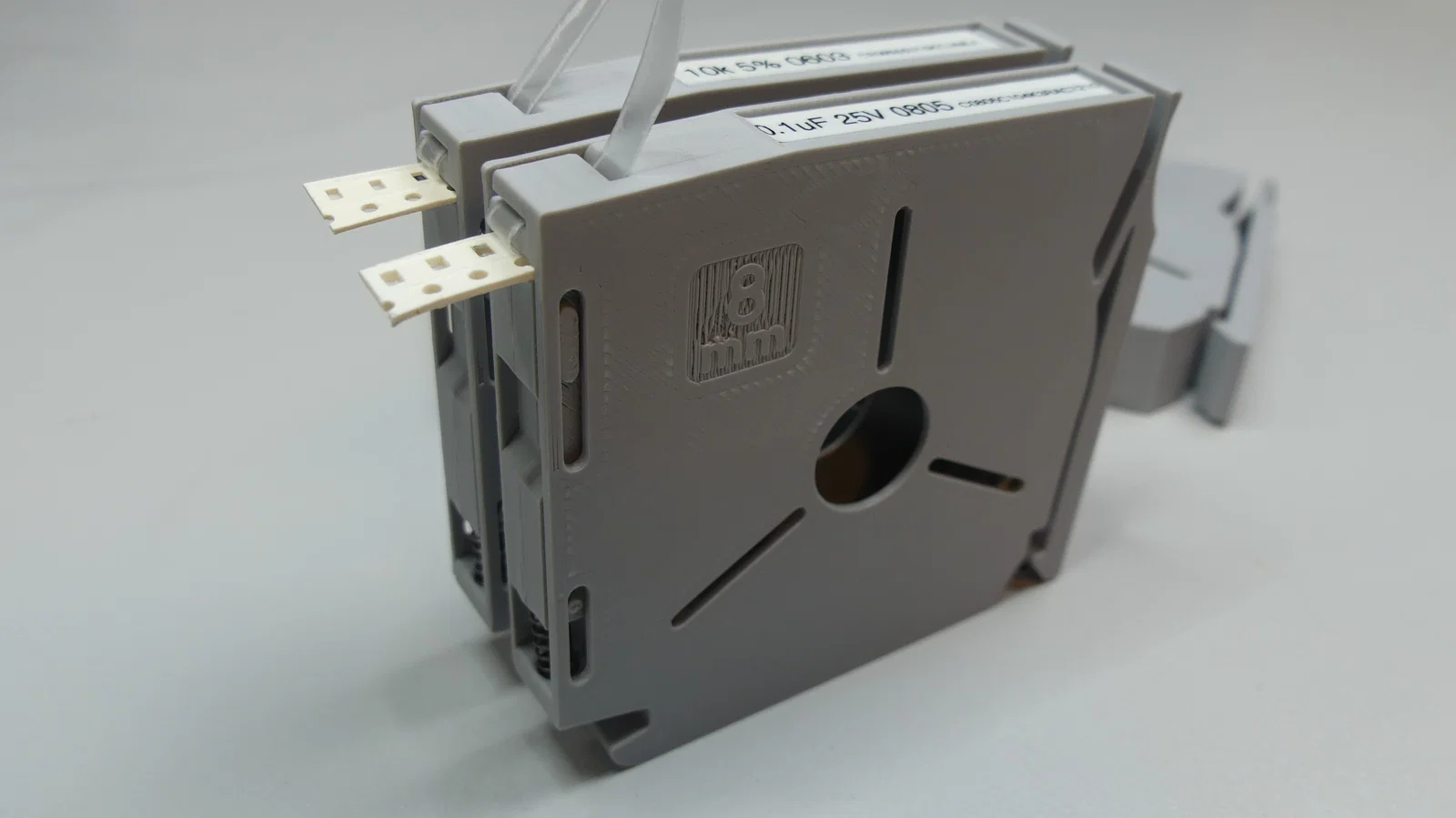 Mẫu SMD Magazine dùng giữ cuộn linh kiện 8mm, 12mm và 16mm đã được cải tiến giúp in không cần support. Thanh ray có thể gắn O-ring và đổ thêm cát hoặc xi măng để tăng độ ổn định. Phù hợp cho dân kỹ thuật sắp xếp linh kiện điện tử.