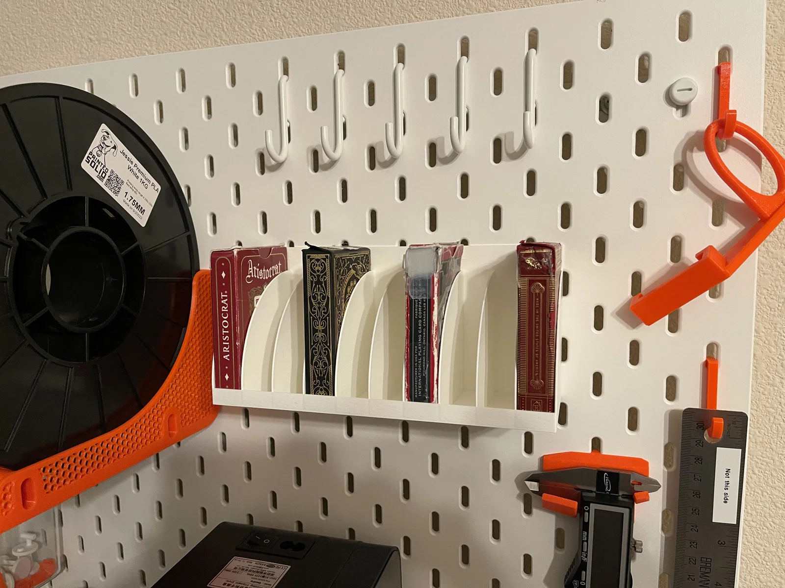 Mình thiết kế mẫu này để con gái có chỗ cất giữ và trưng bày bộ sưu tập hơn 30 bộ bài tây của bé. Mỗi khay kệ có thể chứa 10 bộ bài tiêu chuẩn. Theo tính toán của mình, bạn có thể lắp ít nhất 8 khay (tương đương 80 bộ bài) lên bảng IKEA Skadis cỡ 22x22" và 4 khay (40 bộ bài) trên tấm bảng nhỏ hơn cỡ 14-¼ x 22".